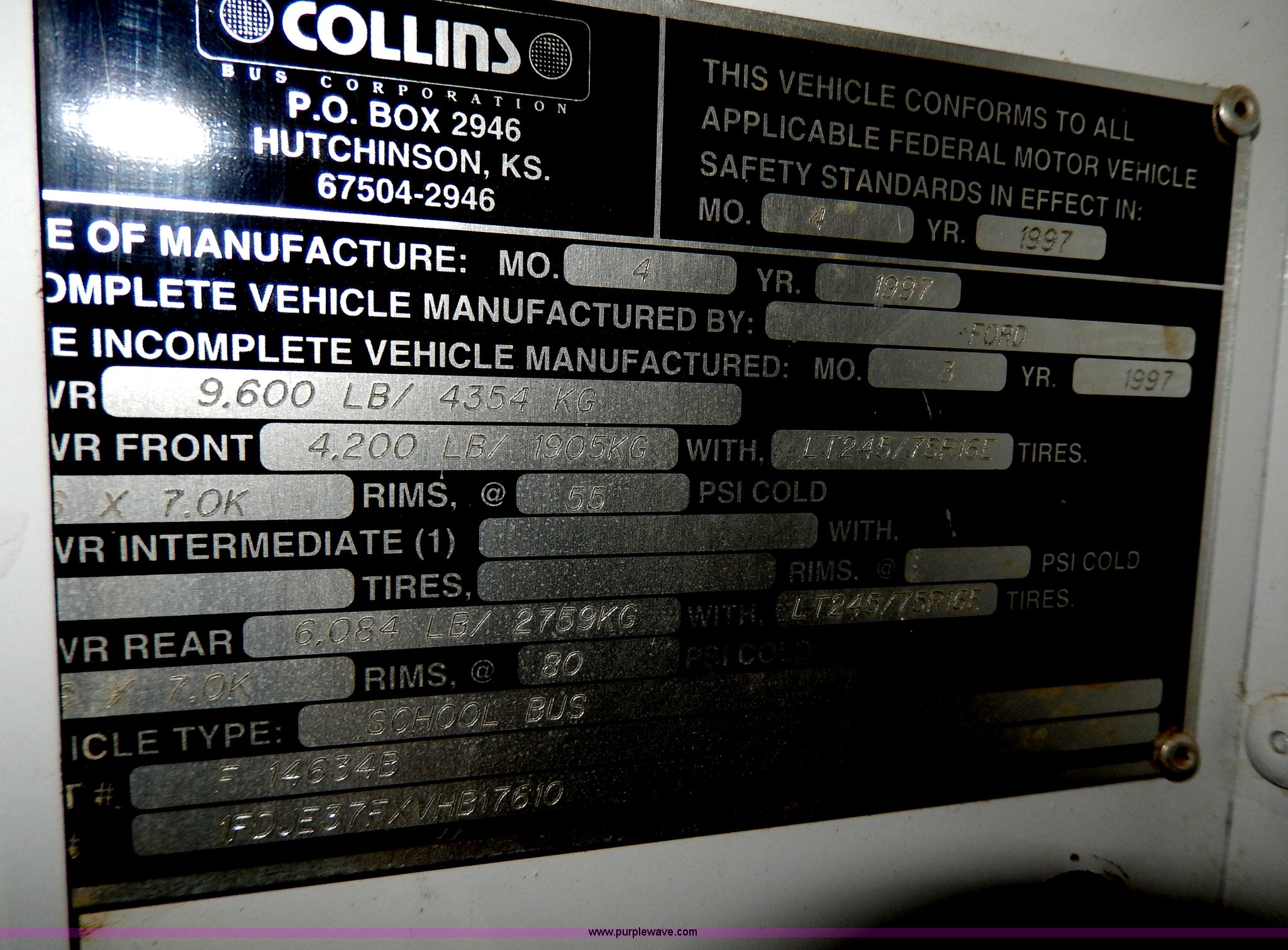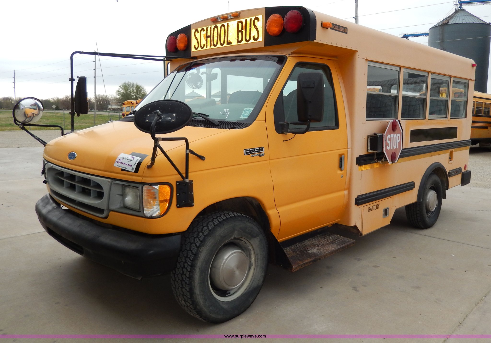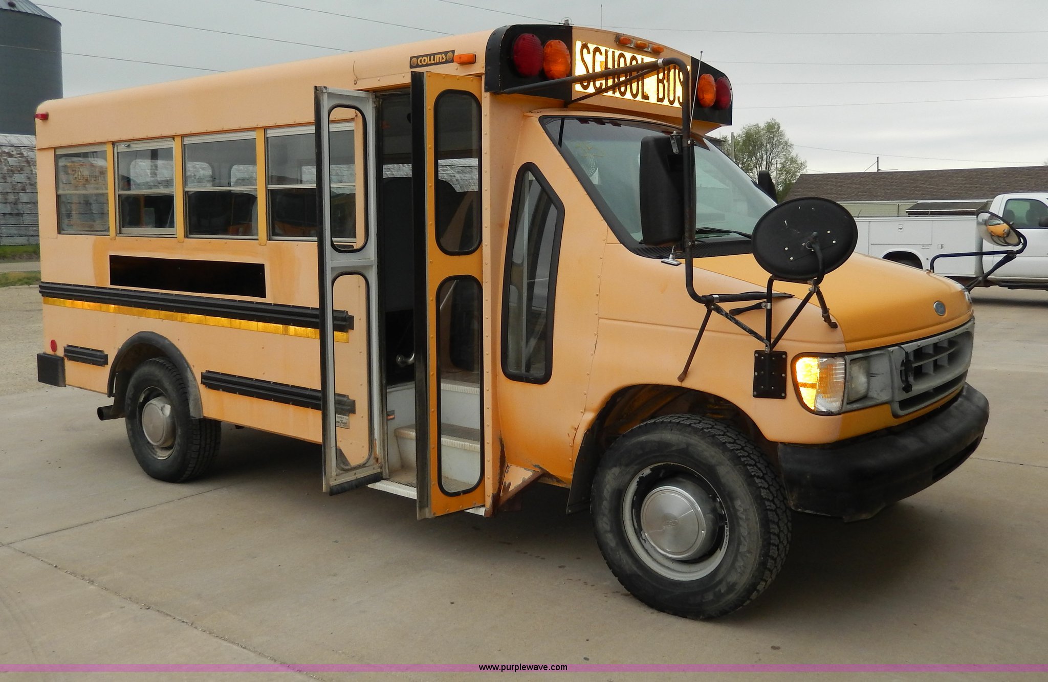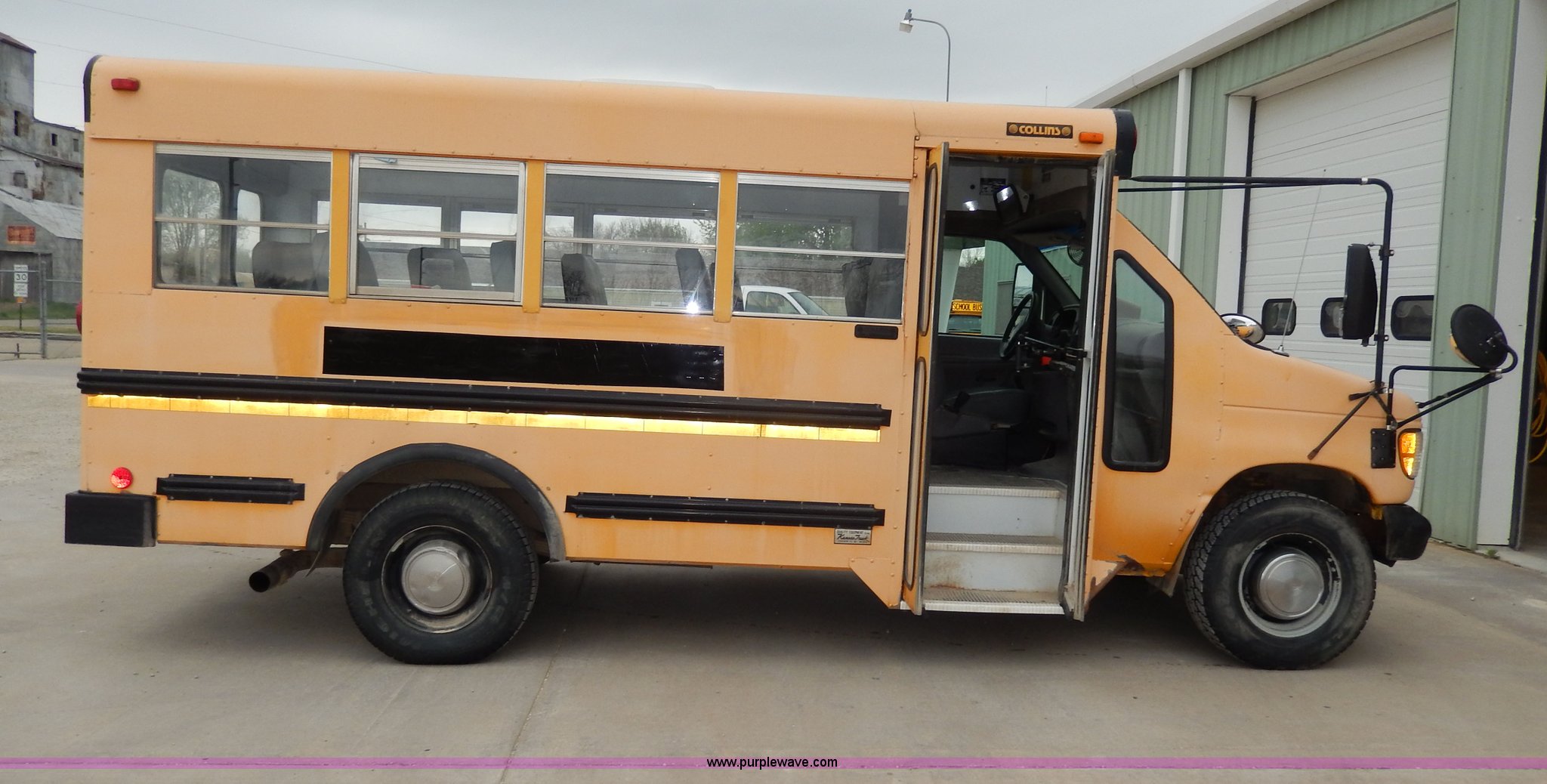 Purple Wave is selling a used Bus in Kansas. This item is a 1997 Ford Collins E350 school bus with the following: 116,249 miles on odometer, 18 passenger, 7.3L V8 turbo diesel engine, Automatic transmission, Heat, Manual windows and locks, Heated mirrors, Vinyl interior, Seat belts, Block heater, 245/75R16 tires, GVWR 9,600 lbs, Stereo missing