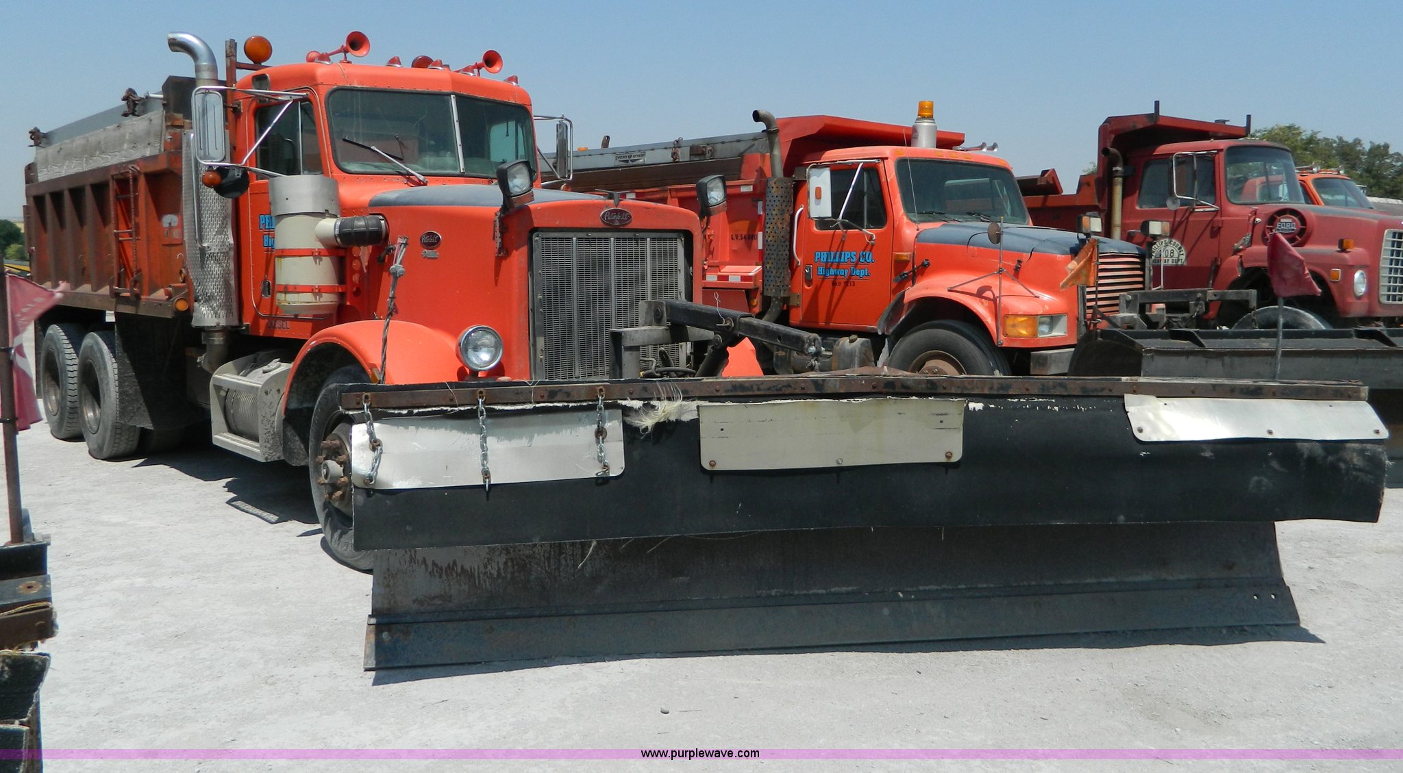 Purple Wave is selling a used Construction Dump Truck in Kansas. This item is a 1985 Peterbilt 349 dump truck with the following: 187,964 miles on odometer, Caterpillar 3306 10.5L L6 diesel engine, Road Ranger eight speed manual transmission, Heat, Air suspension seat, 14' dump bed, Manual end gate, Two stage single ram hoist, Baix 12' snow plow, Larson spreader, 10 yard capacity, Pintle hitch, Dual fuel tanks, PTO, Spring suspension, Air brakes, 11R22.5 tires, GVWR 50,000 lbs, Interior/exterior cosmetic damage, Rust