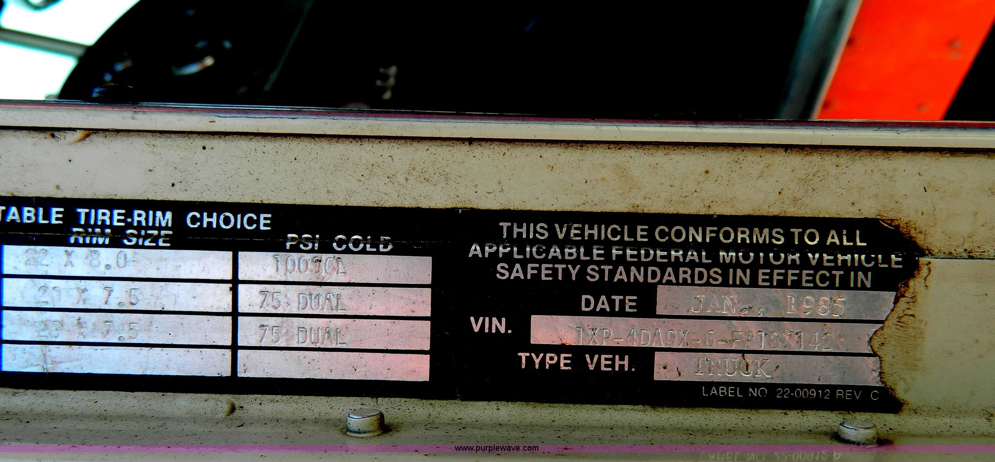1985 Peterbilt 349 dump truck. 187,964 miles on odometer, Caterpillar 3306 10.5L L6 diesel engine, Road Ranger eight speed manual transmission, Heat, Air suspension seat, 14' dump bed Manual end gate, Two stage single ram hoist, Baix 12' snow plow, Larson spreader 10 yard capacity, Pintle hitch, Dual fuel tanks, PTO, Spring suspension, Air brakes, 11R22.5 tires, GVWR 50,000 lbs, Interior/exterior cosmetic damage, Rust. 1XP4DA9X6FP187142. Shipping quotes available. Phillips County Road and Bridge. 195 W Maple. Phillipsburg, KS 67661