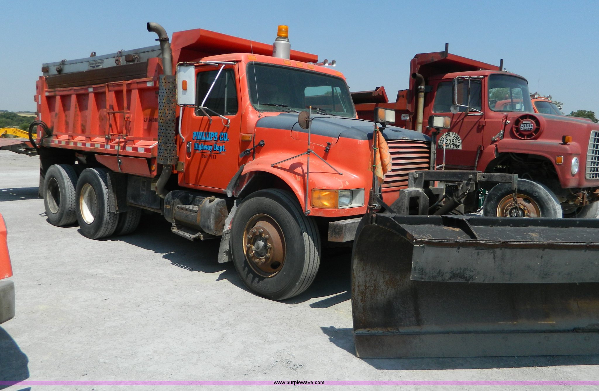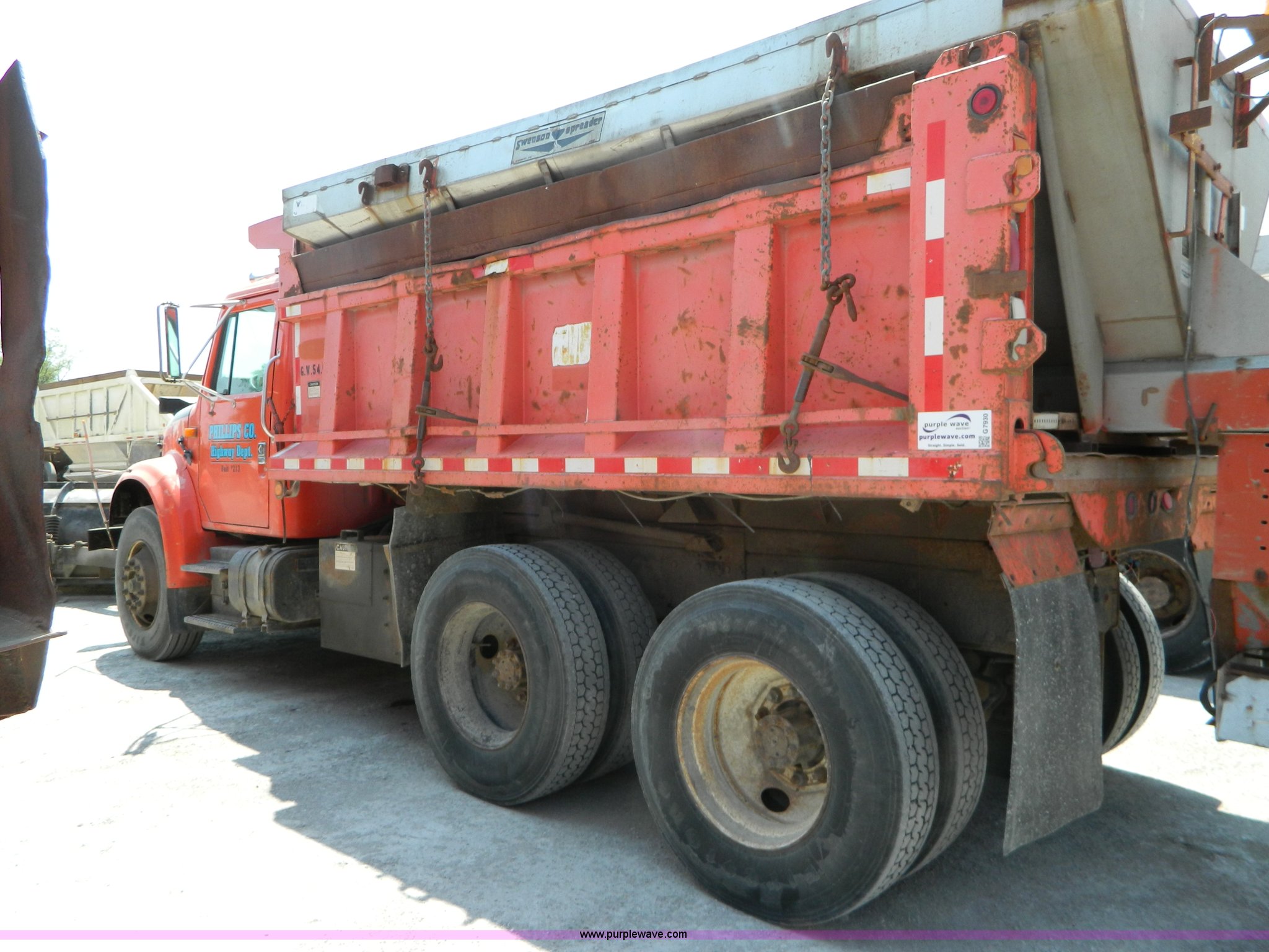 1991 International 4900 dump truck. 249,420 miles on odometer, International DT466 7.6L L6 diesel engine, Allison five speed automatic transmission, Power divider, Heat, AM/FM, Air suspension seat, 13' dump bed Manual end gate, Two stage single ram, Schmidt 11' snow plow Model L03-3120, Swenson stainless steel spreader Model 721-3120, 7 yard capacity, Dual fuel tanks, Air brakes, 170" wheelbase, 10.00-20 tires, GVWR 46,000 lbs, Interior/exterior cosmetic damage, Rust. 1HTSHNGR3MH337680. Shipping quotes available. Phillips County Road and Bridge. 195 W Maple. Phillipsburg, KS 67661