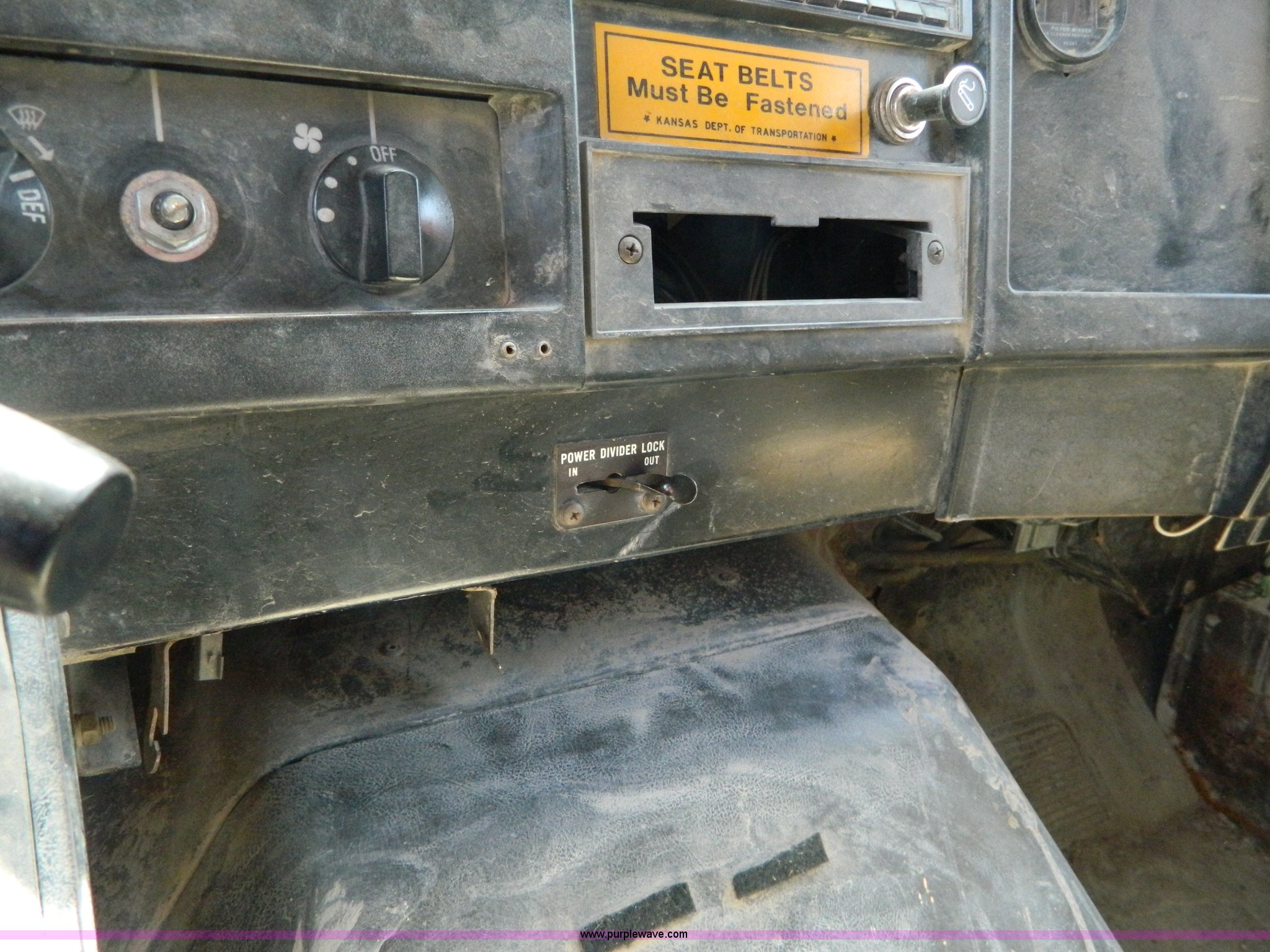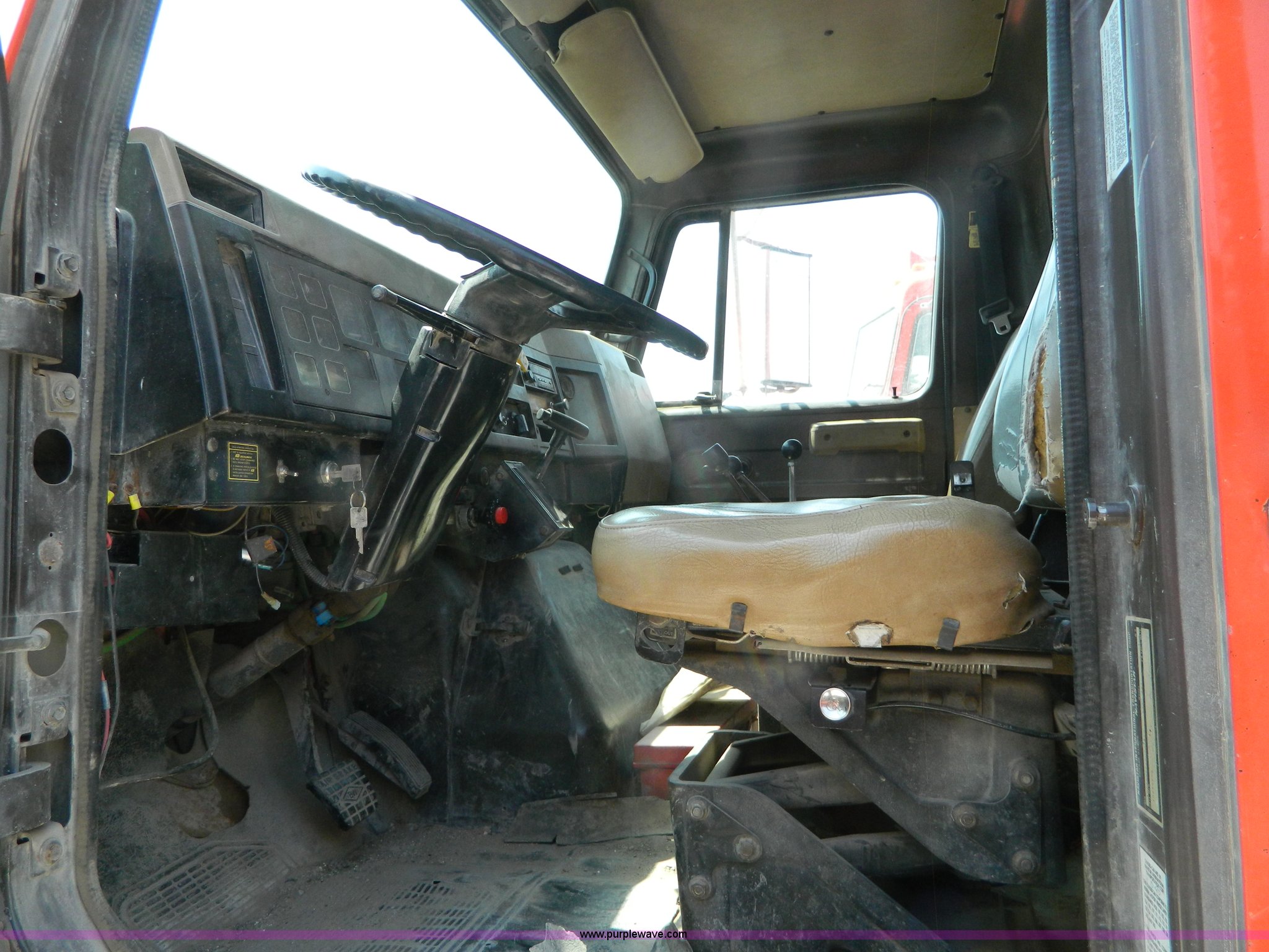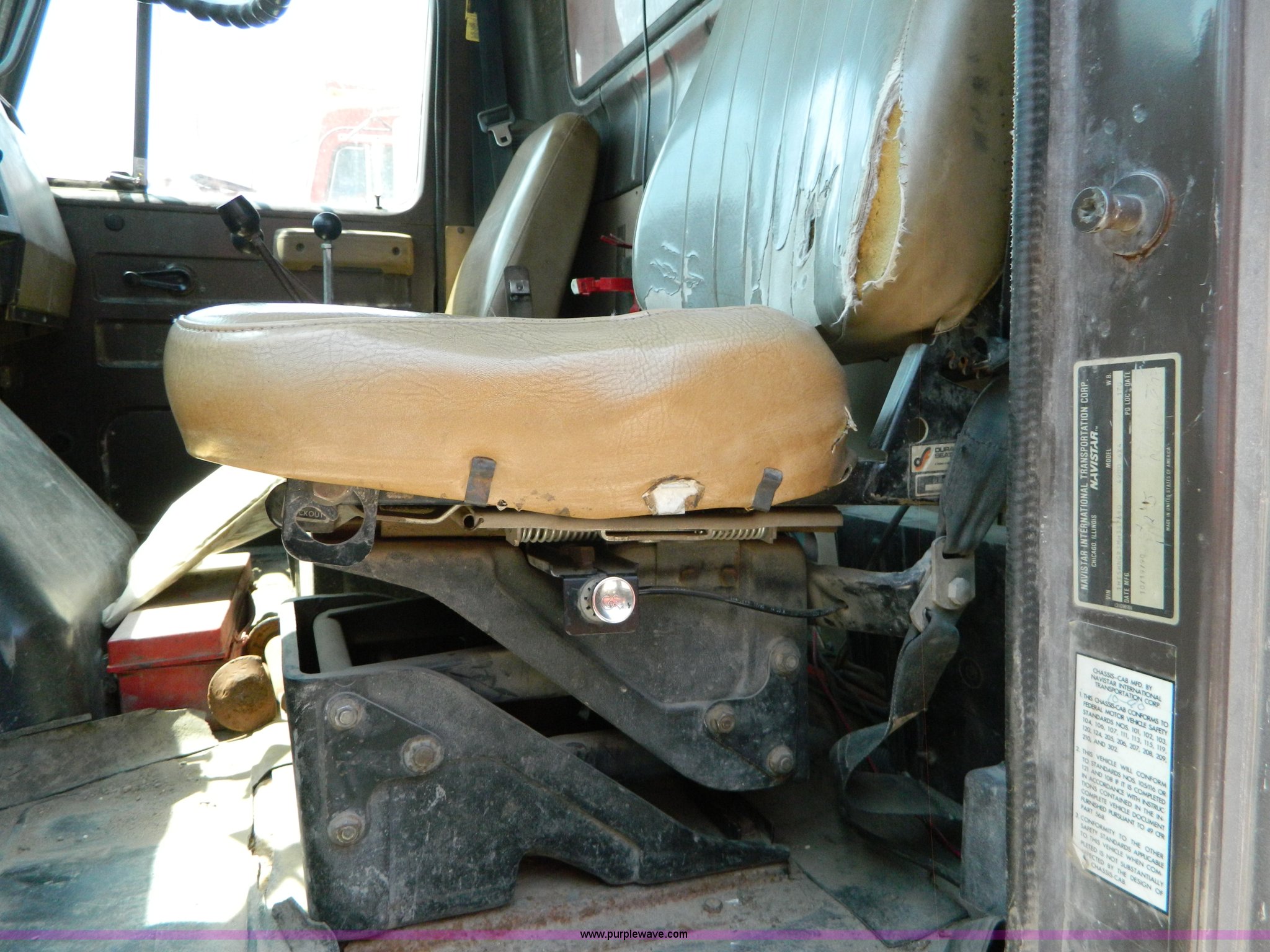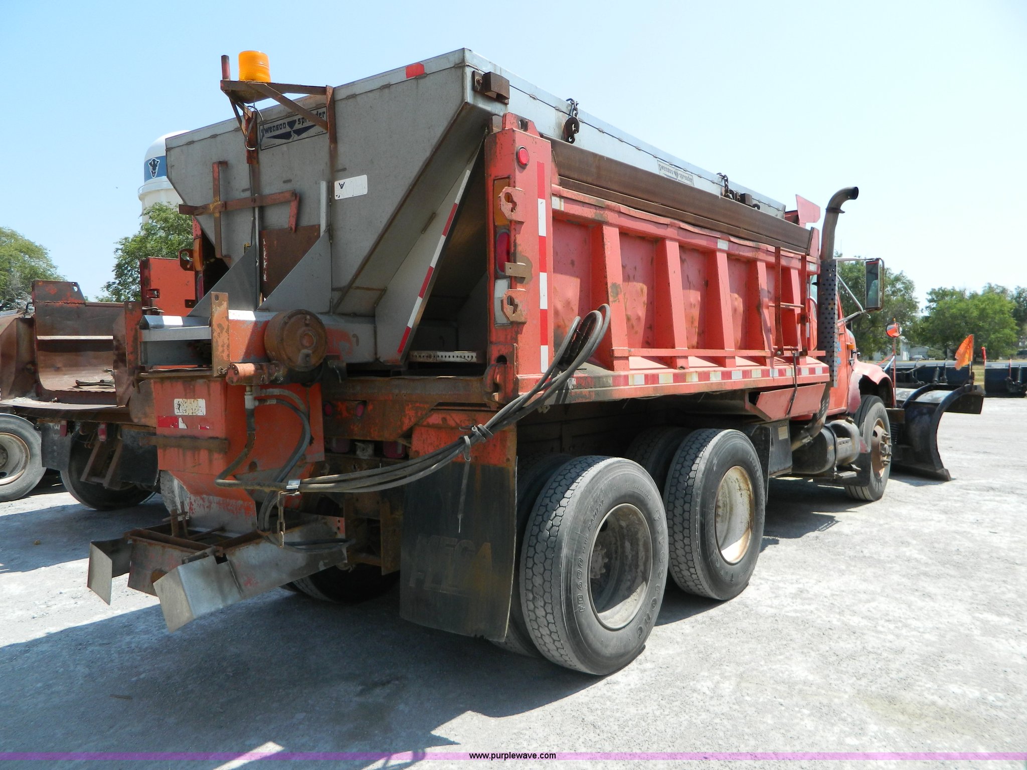 Purple Wave is selling a used Construction Dump Truck in Kansas. This item is a 1991 International 4900 dump truck with the following: 249,420 miles on odometer, International DT466 7.6L L6 diesel engine, Allison five speed automatic transmission, Power divider, Heat, AM/FM, Air suspension seat, 13' dump bed, Manual end gate, Two stage single ram, Schmidt 11' snow plow, Model L03-3120, Swenson stainless steel spreader, Model 721-3120, 7 yard capacity, Dual fuel tanks, Air brakes, 170" wheelbase, 10.00-20 tires, GVWR 46,000 lbs, Interior/exterior cosmetic damage, Rust