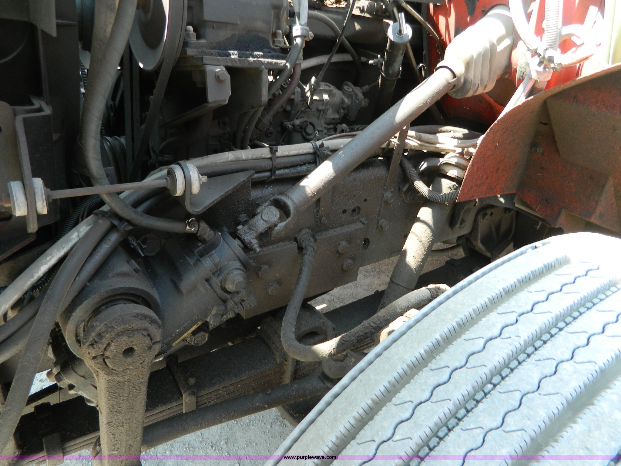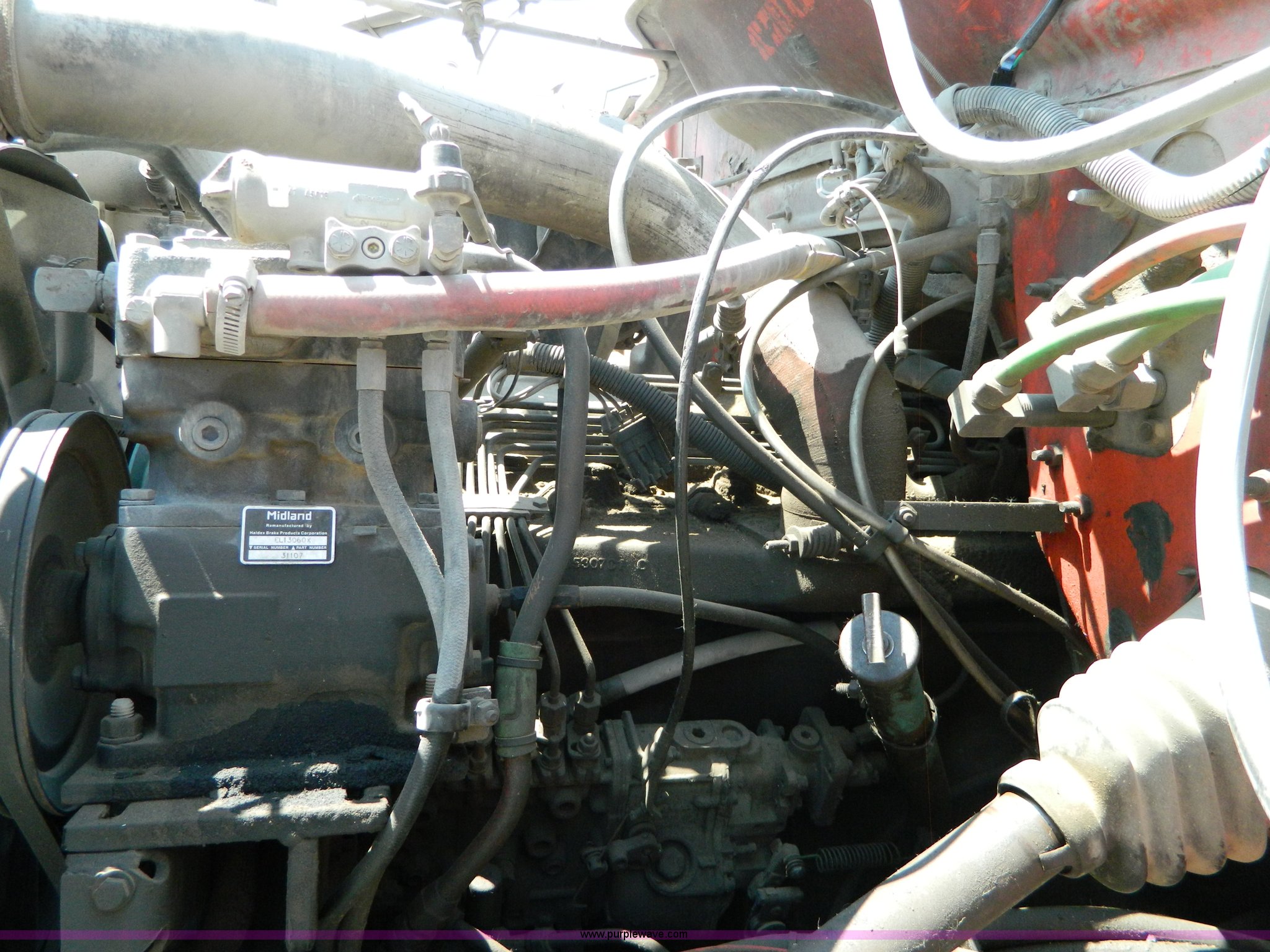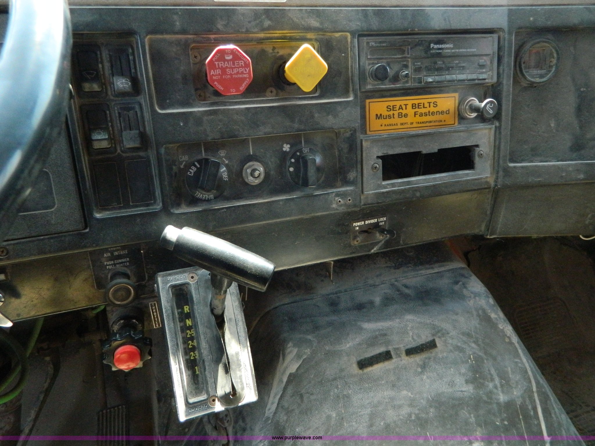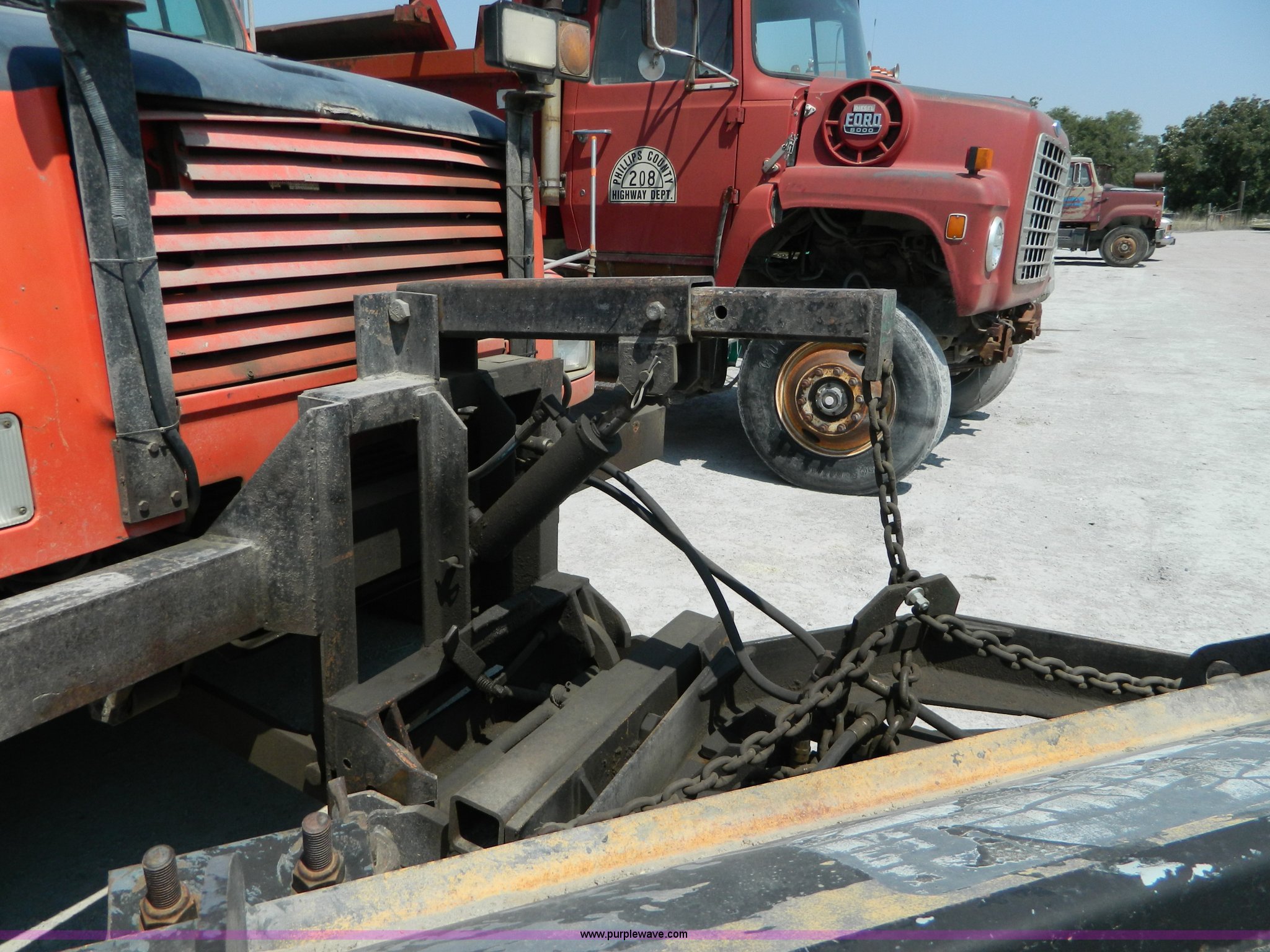 Purple Wave is selling a used Construction Dump Truck in Kansas. This item is a 1991 International 4900 dump truck with the following: 249,420 miles on odometer, International DT466 7.6L L6 diesel engine, Allison five speed automatic transmission, Power divider, Heat, AM/FM, Air suspension seat, 13' dump bed, Manual end gate, Two stage single ram, Schmidt 11' snow plow, Model L03-3120, Swenson stainless steel spreader, Model 721-3120, 7 yard capacity, Dual fuel tanks, Air brakes, 170" wheelbase, 10.00-20 tires, GVWR 46,000 lbs, Interior/exterior cosmetic damage, Rust