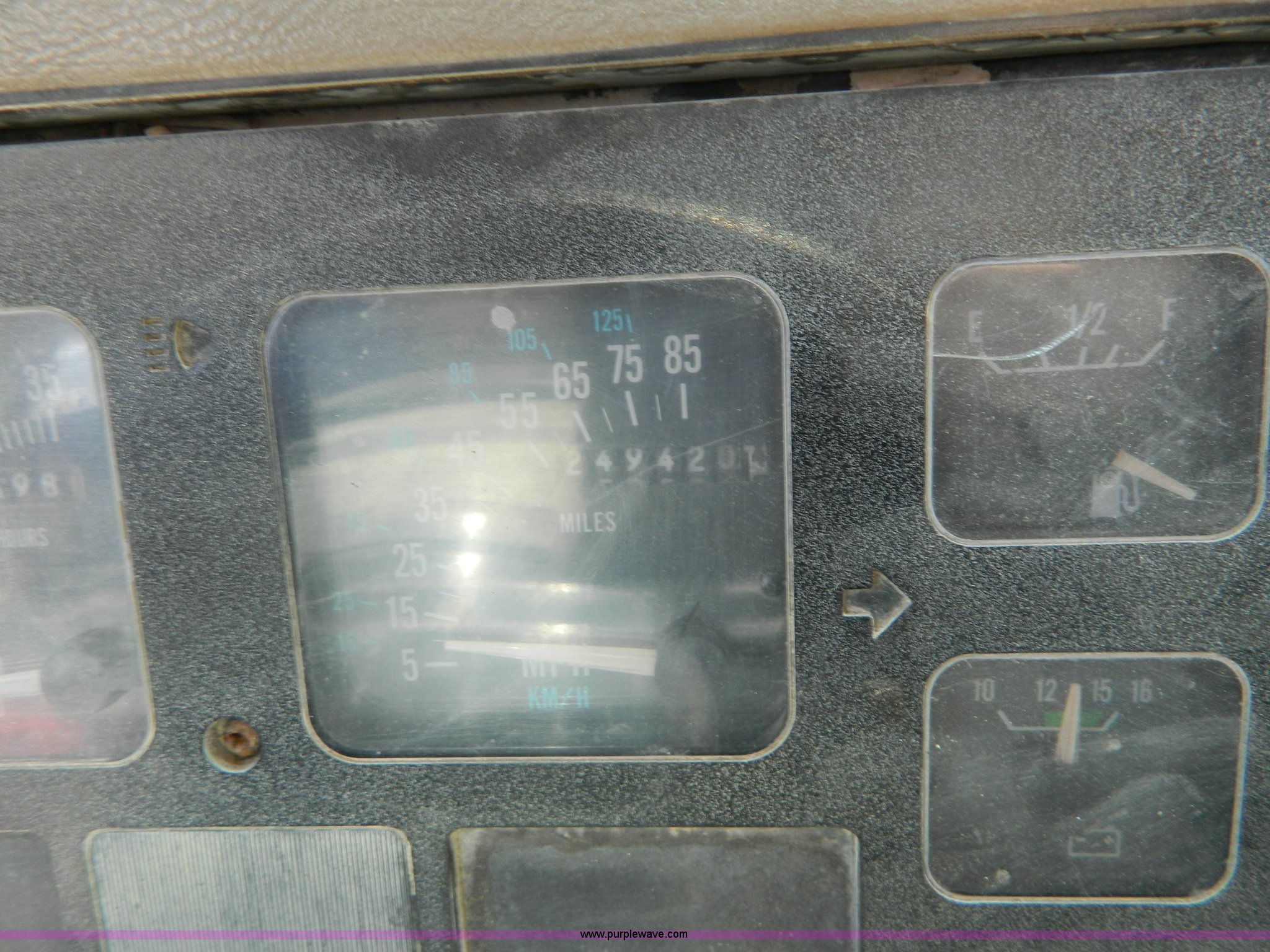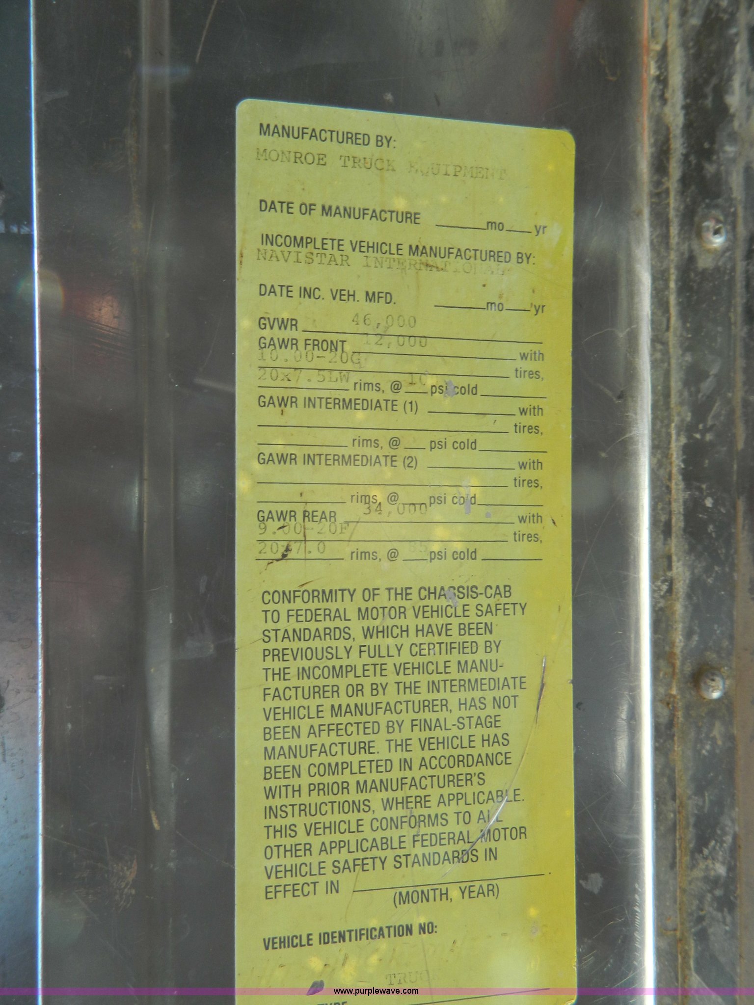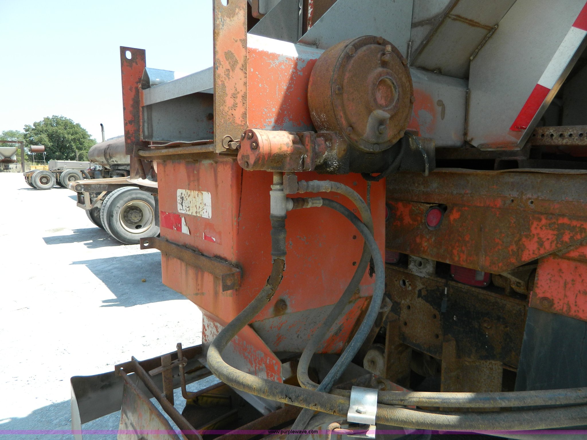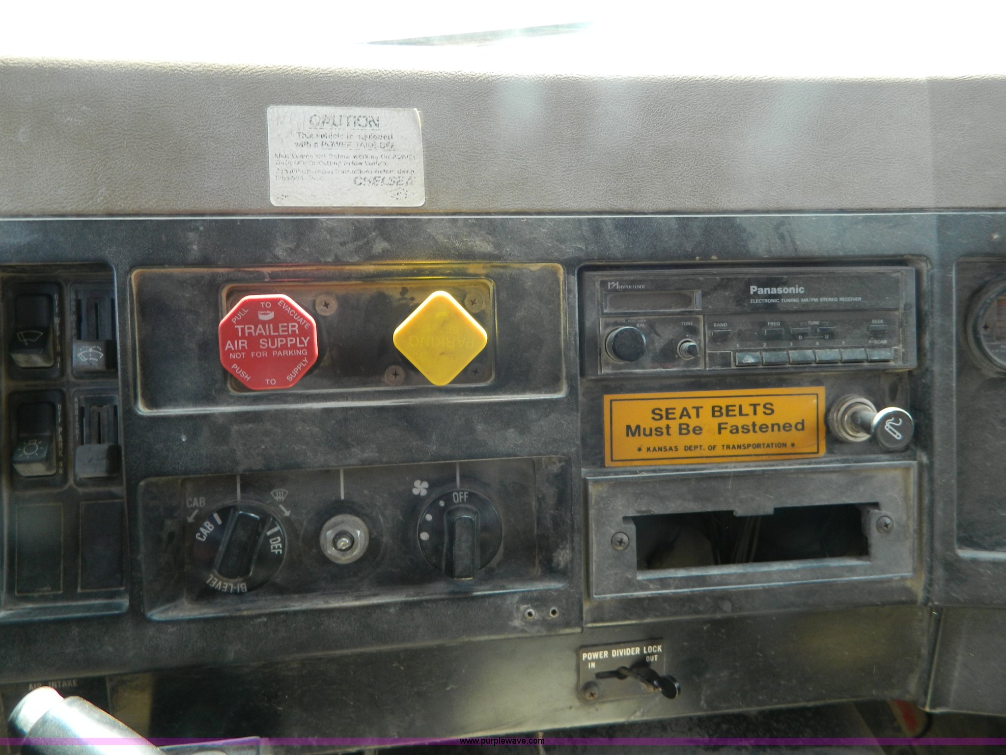 Purple Wave is selling a used Construction Dump Truck in Kansas. This item is a 1991 International 4900 dump truck with the following: 249,420 miles on odometer, International DT466 7.6L L6 diesel engine, Allison five speed automatic transmission, Power divider, Heat, AM/FM, Air suspension seat, 13' dump bed, Manual end gate, Two stage single ram, Schmidt 11' snow plow, Model L03-3120, Swenson stainless steel spreader, Model 721-3120, 7 yard capacity, Dual fuel tanks, Air brakes, 170" wheelbase, 10.00-20 tires, GVWR 46,000 lbs, Interior/exterior cosmetic damage, Rust