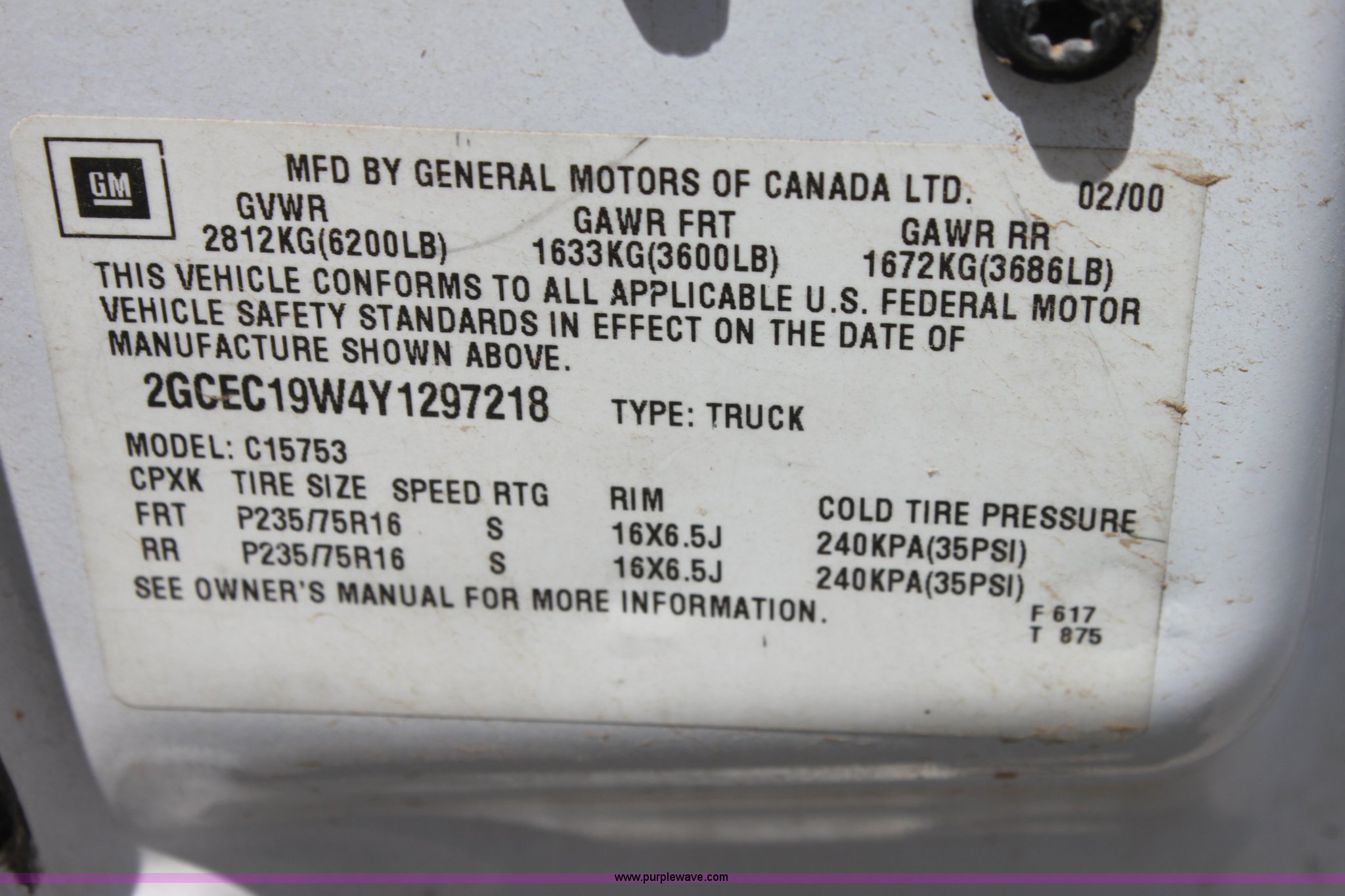 2000 Chevrolet Silverado 1500 Ext. Cab pickup truck. 163,704 miles on odometer, 4.3L V6 OHV 12V gas engine, Automatic transmission, AC and heat, AM/FM/CD, Manual windows and locks, Cloth interior, 265/70R17 tires, Interior/exterior cosmetic damage. 2GCEC19W4Y1297218. Shipping quotes available. Kiowa County Sheriff. Greensburg, KS 67054
