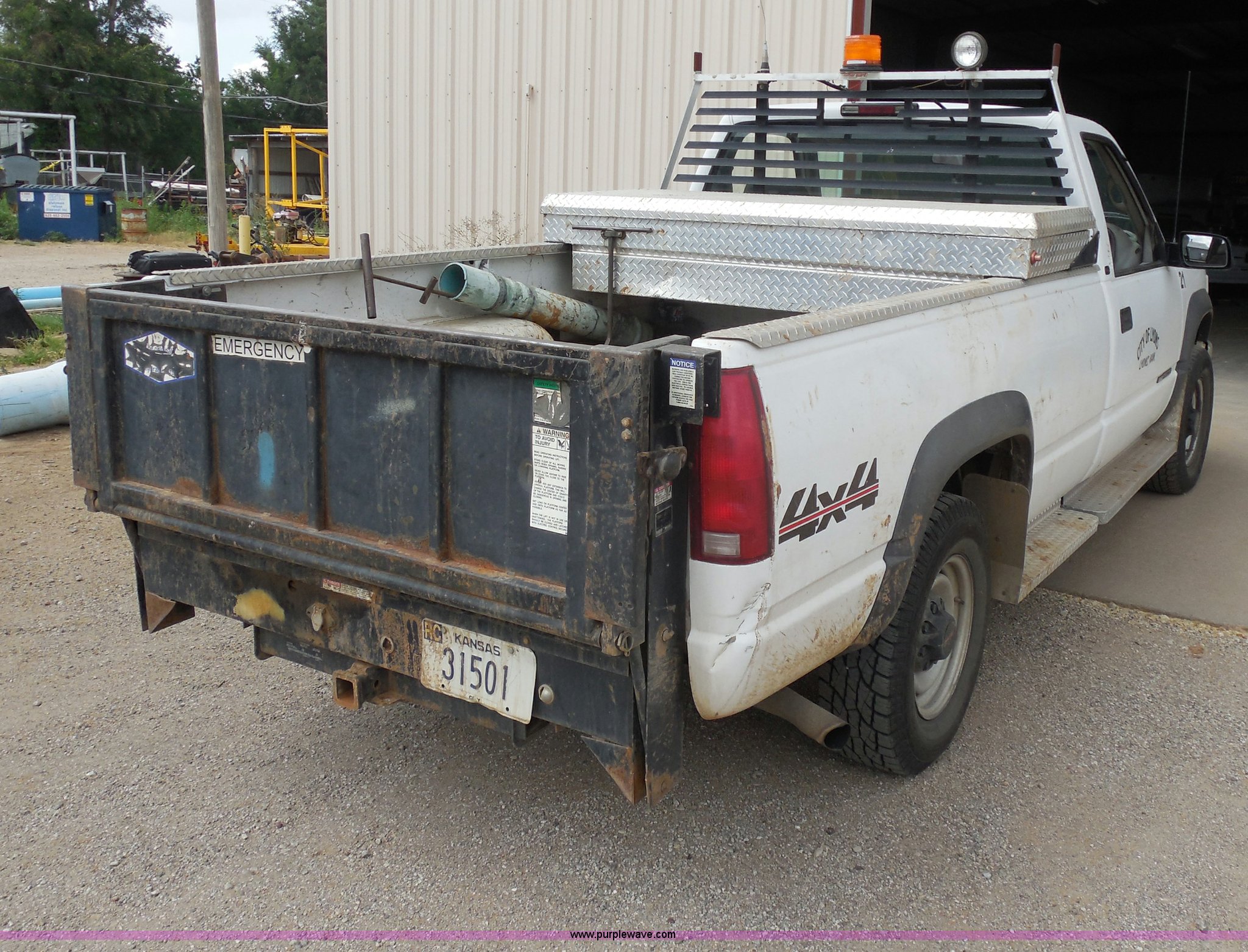 Purple Wave is selling a used Passenger Vehicle in Kansas. This item is a 1998 GMC Sierra 2500 pickup truck with the following: 81,628 miles on odometer, 5.7L V8 OHV 16V gas engine, Automatic transmission, Four wheel drive, AC and heat, Tilt, AM/FM/cassette, Manual windows and locks, Cloth interior, Toolbox, Headache rack, Tommy Gate lift gate, Model 601340, Serial M-80146, 245/75R16 tires, Driver's side door handle broken