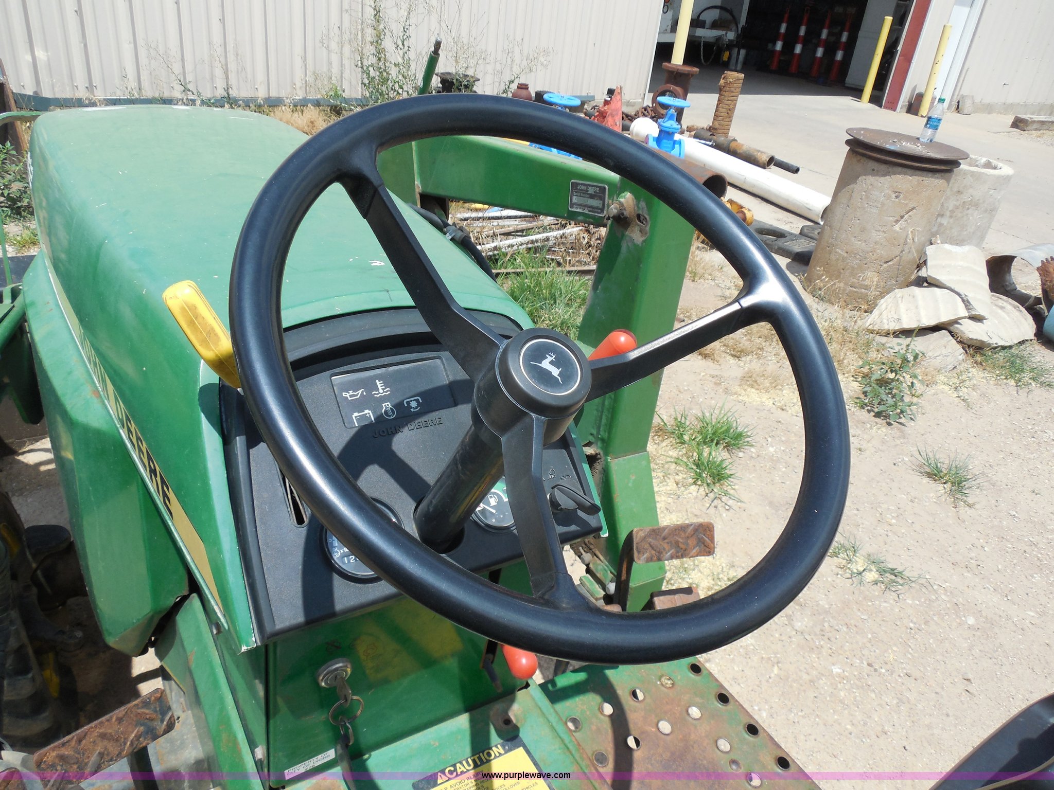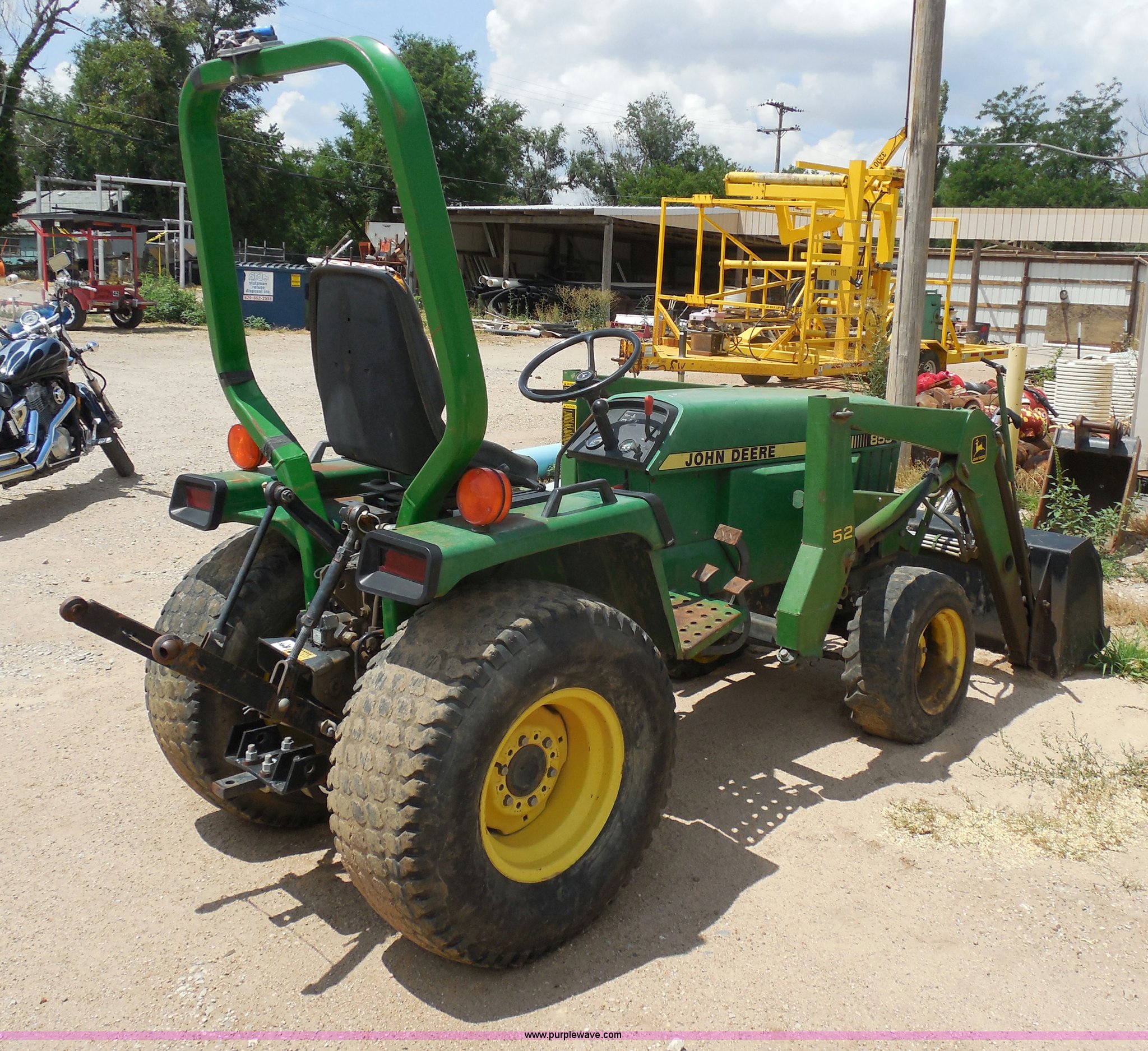 Purple Wave is selling a used Tractor in Kansas. This item is a John Deere 52 tractor with the following: 1,281 hours on meter, John Deere three cylinder diesel engine, Four speed transmission, 540 PTO, Three point, 4' loader bucket, Kelly backhoe attachment, Model B750, 18" bucket, Serial 220727-022725, 23x8.50-12 front tires, 33x12.50-15 rear tires, Four wheel drive inoperable, Serial TY0052A001583