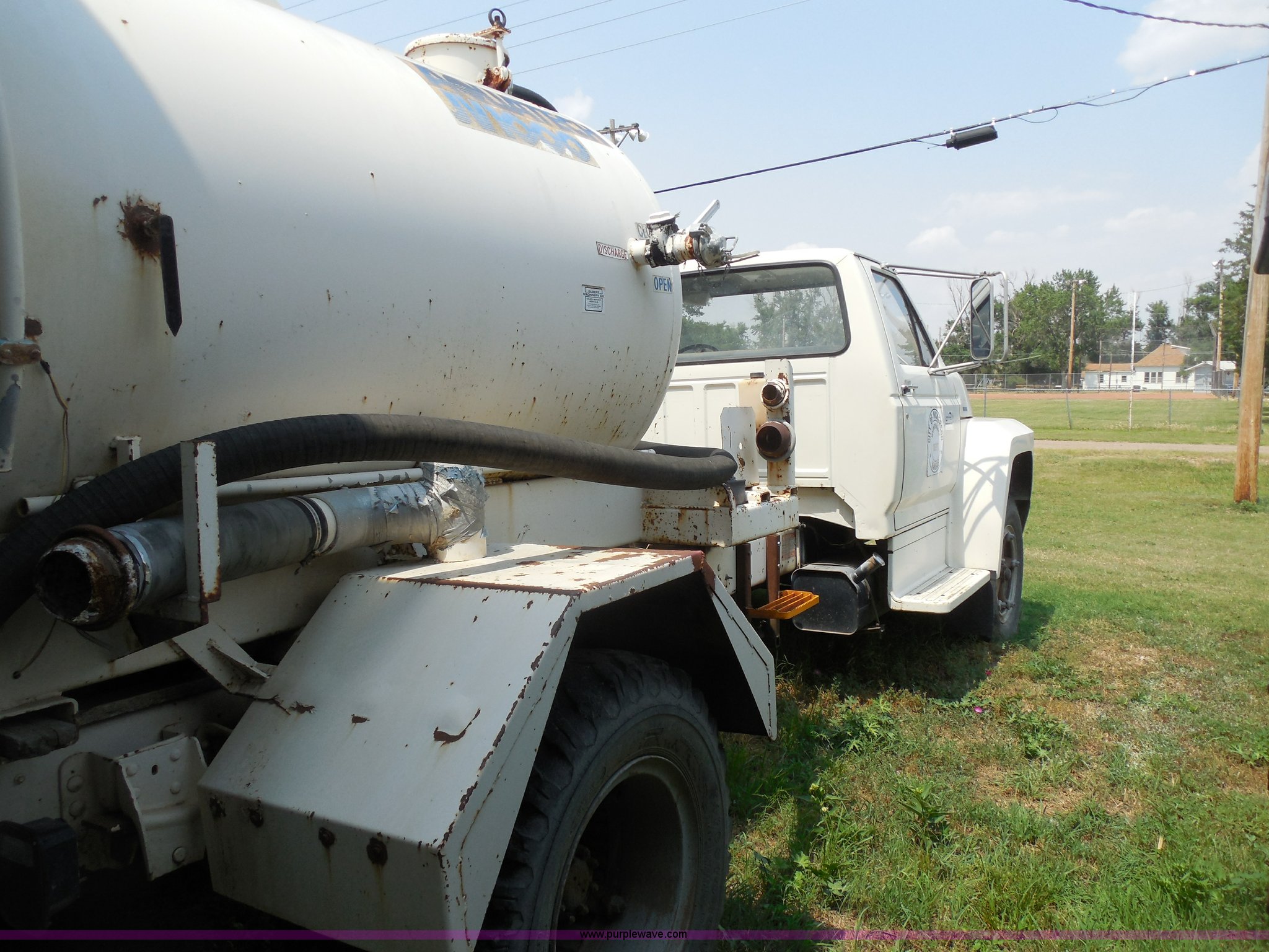 1980 Ford vacuum truck. 23,112 miles on odometer, 370 C.I.D. V8 gas engine, Five speed manual transmission, Heat, Manual windows and locks, Vinyl interior, Chelsea PTO, Aquateck JV100 tank 1,000 gallon capacity, Serial 80209115, Maspart rotary van vacuum pump Model HXL75DE2, Serial 105620, Duff Norton screw cylinder 250 lbs, 9.00-20 tires, Unknown running condition. F61HVJJ0433. Shipping quotes available. City of Nickerson. 15 N Nickerson Street. Nickerson, KS 67561