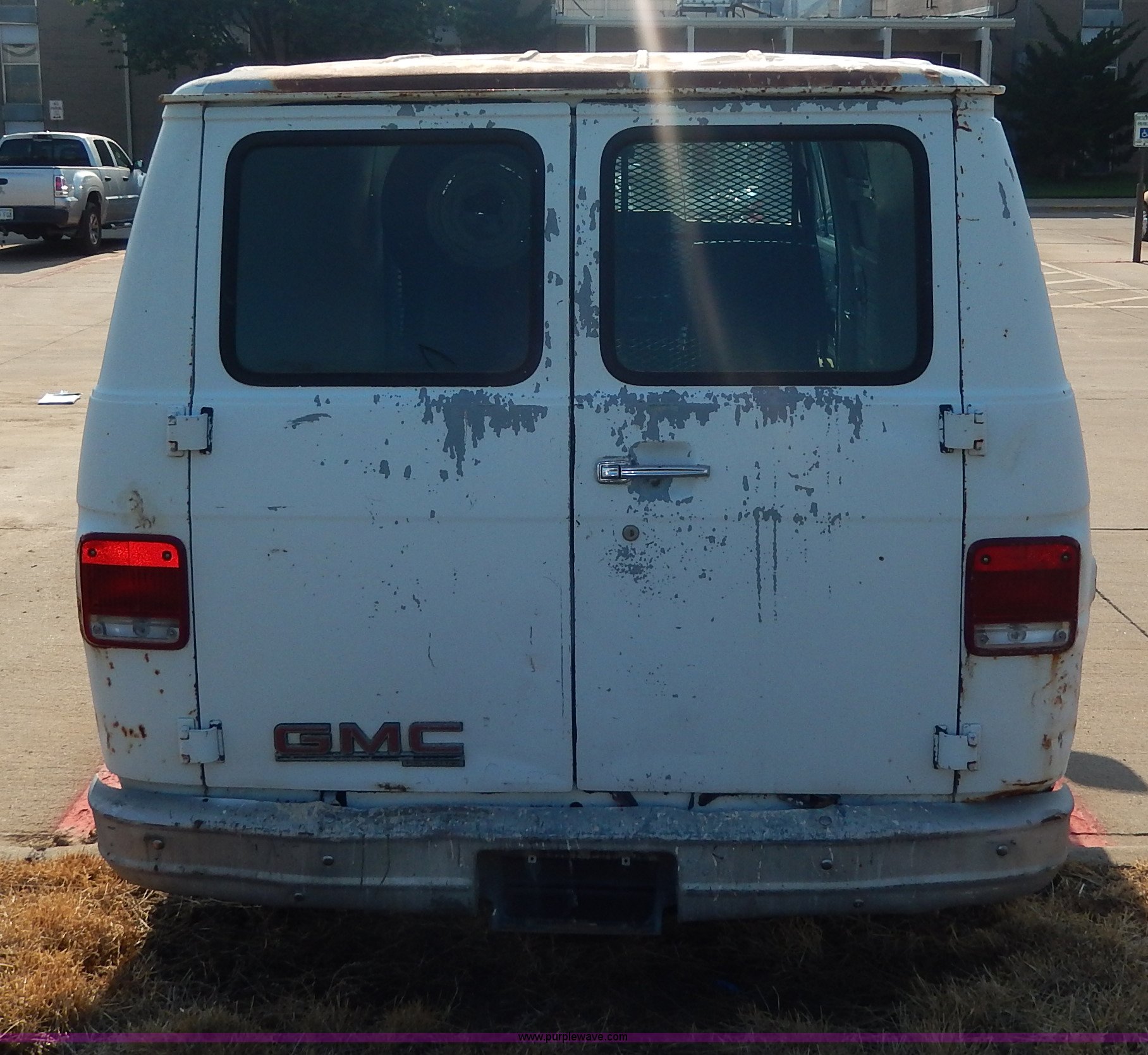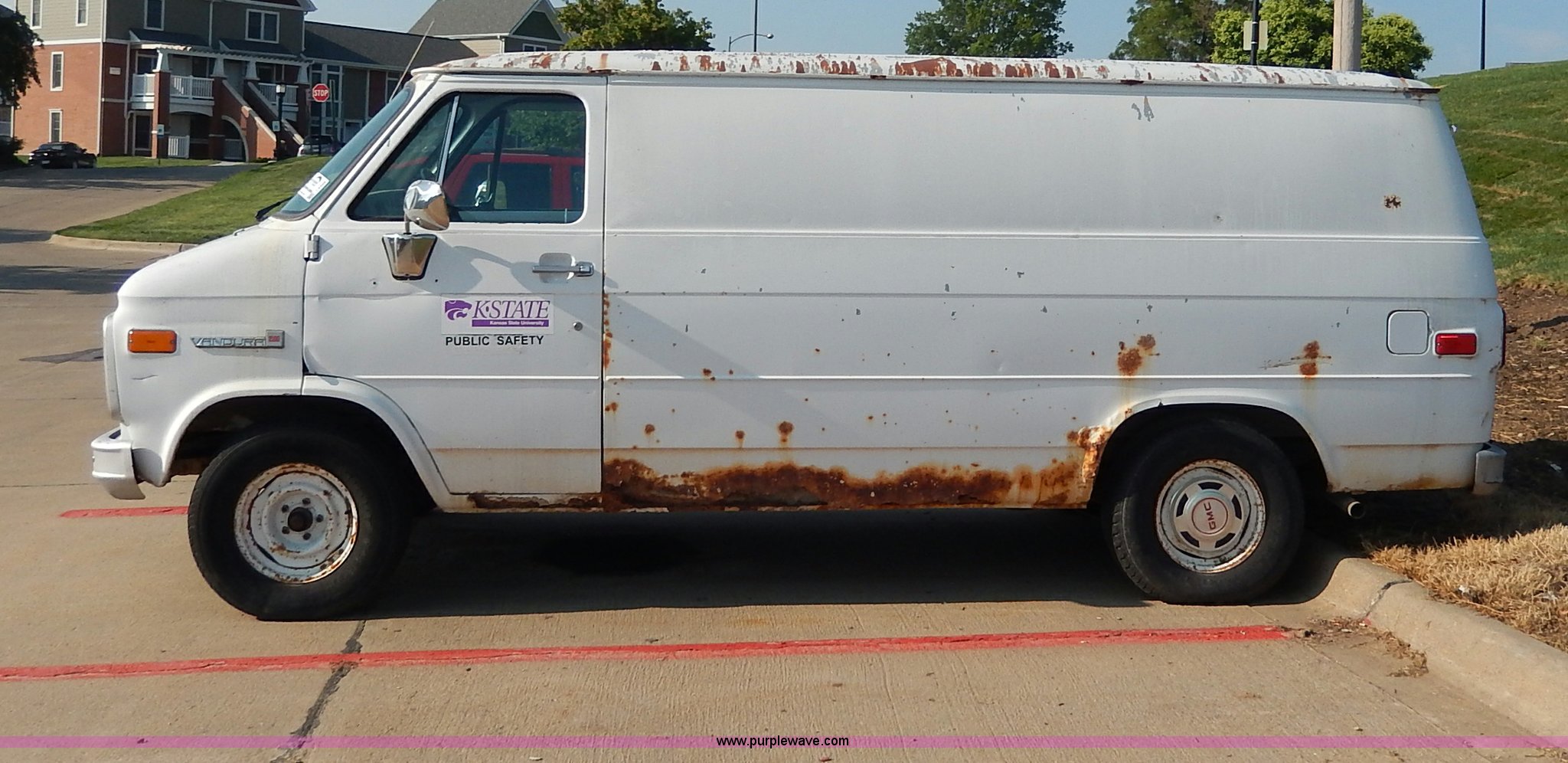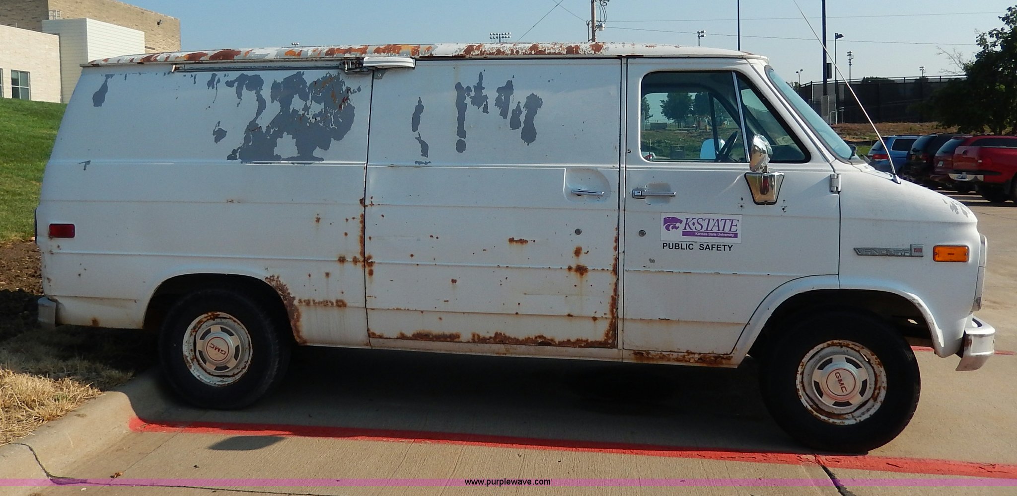 Purple Wave is selling a used Passenger Vehicle in Kansas. This item is a 1988 GMC Vandura G1500 van with the following: 51,769 actual miles, 4.3L V6 OHV 12V gas engine, Automatic transmission, Heat, AM/FM, Manual windows and locks, Vinyl interior, 235/75R15 tires, Intake gasket blown, Vehicle must be towed, Transmission leaks, Battery dead, Interior/exterior cosmetic damage, Rust, Paint peeling, Driver and passenger seats only, Unused spare tire
