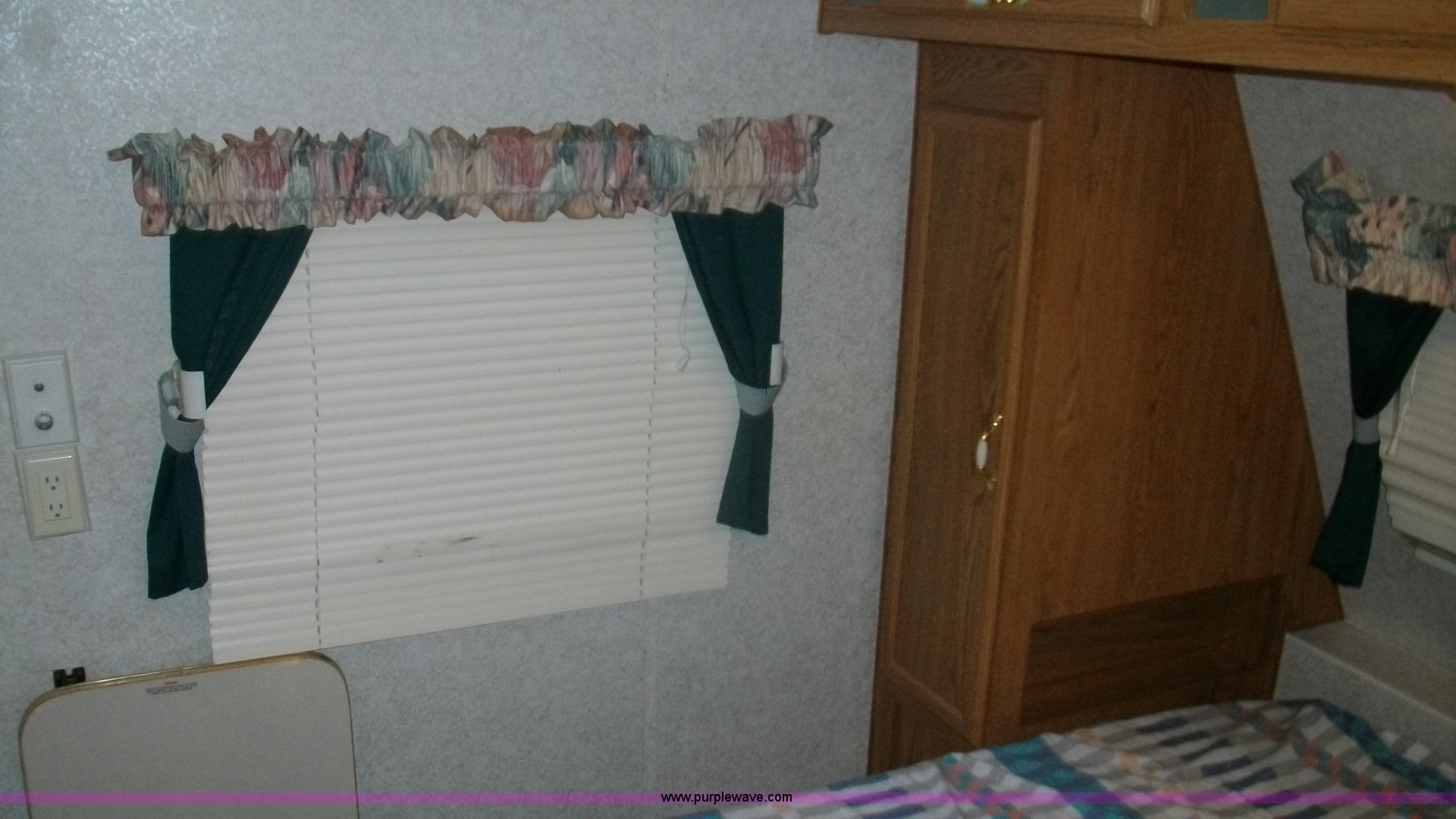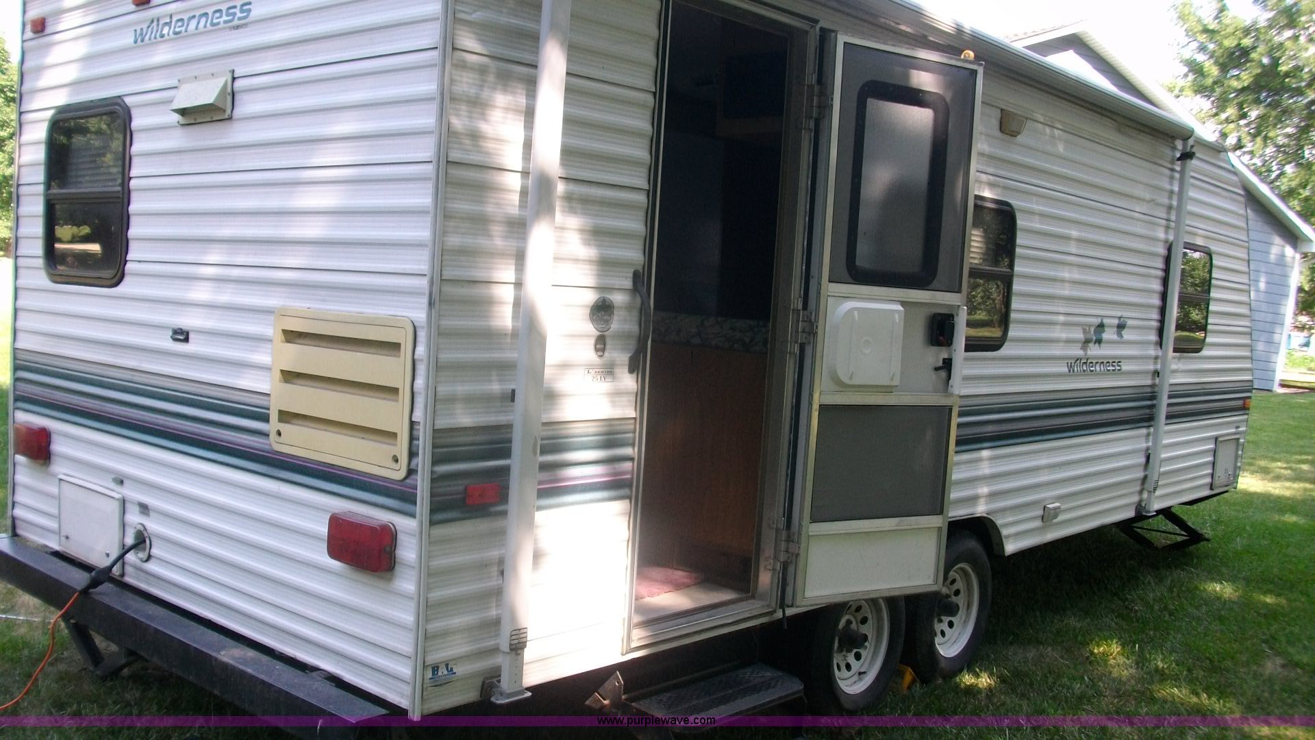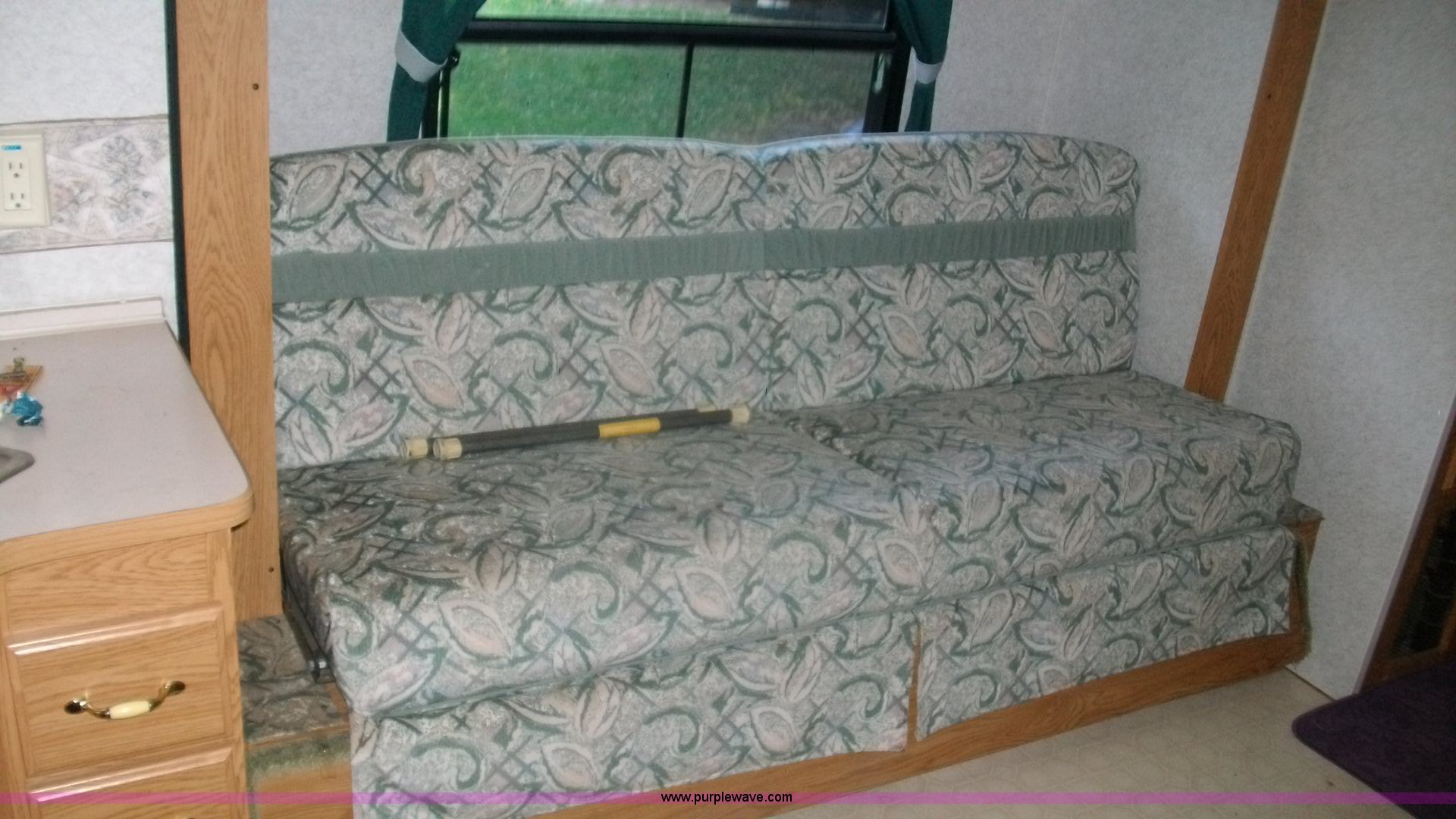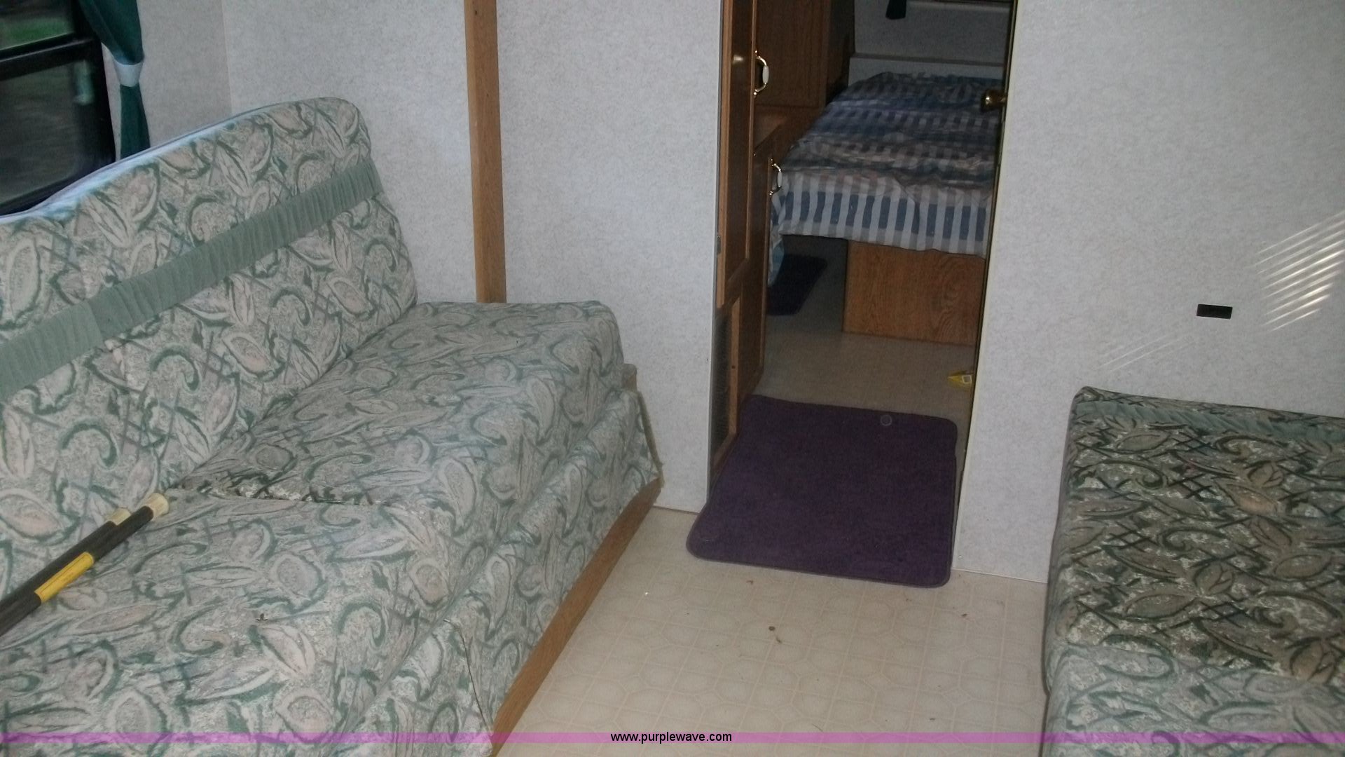 Purple Wave is selling a used RV in Kansas. This item is a 1997 Fleetwood LY Spearmint camper with the following: Slide-out, Sofa bed, Side dinette, Microwave oven compartment, Mini blinds, AC, 20M BTU forced air furnace, Tinted side windows, Double door refrigerator, Sink, Shower, Toilet, Stereo system, Rear sink and mirror, Island queen bed, Television shelf and cabinets with television, Oak frame cabinet door, Vinyl flooring covering, 40 gallon fresh water tank, (2) propane tanks, 2 5/16" ball hitch, Scissor jacks, Owner's manual, Spoke wheels, Awning needs to be replaced