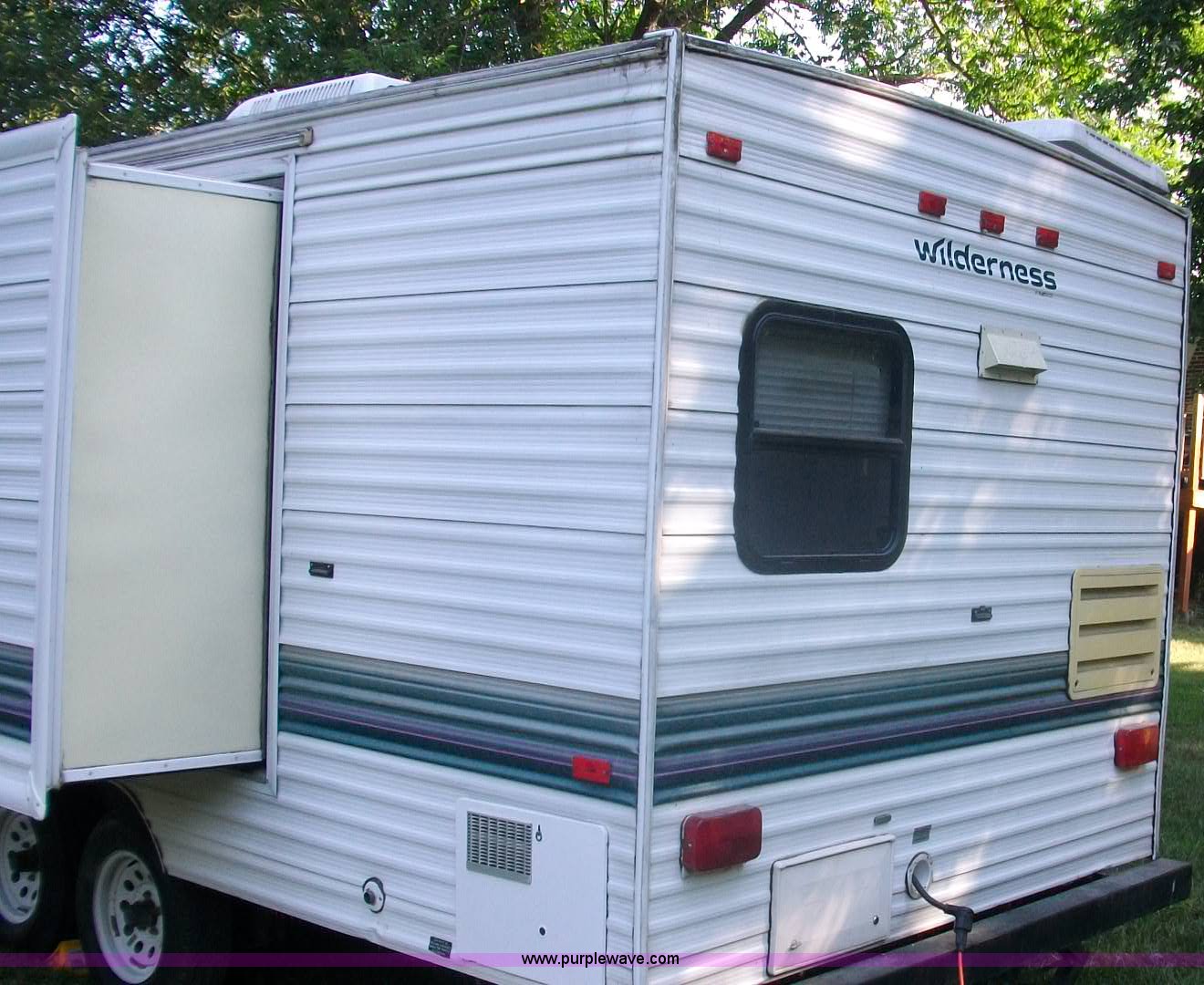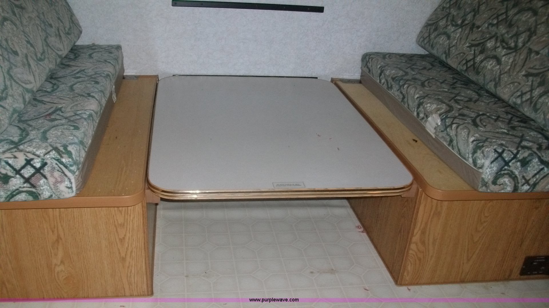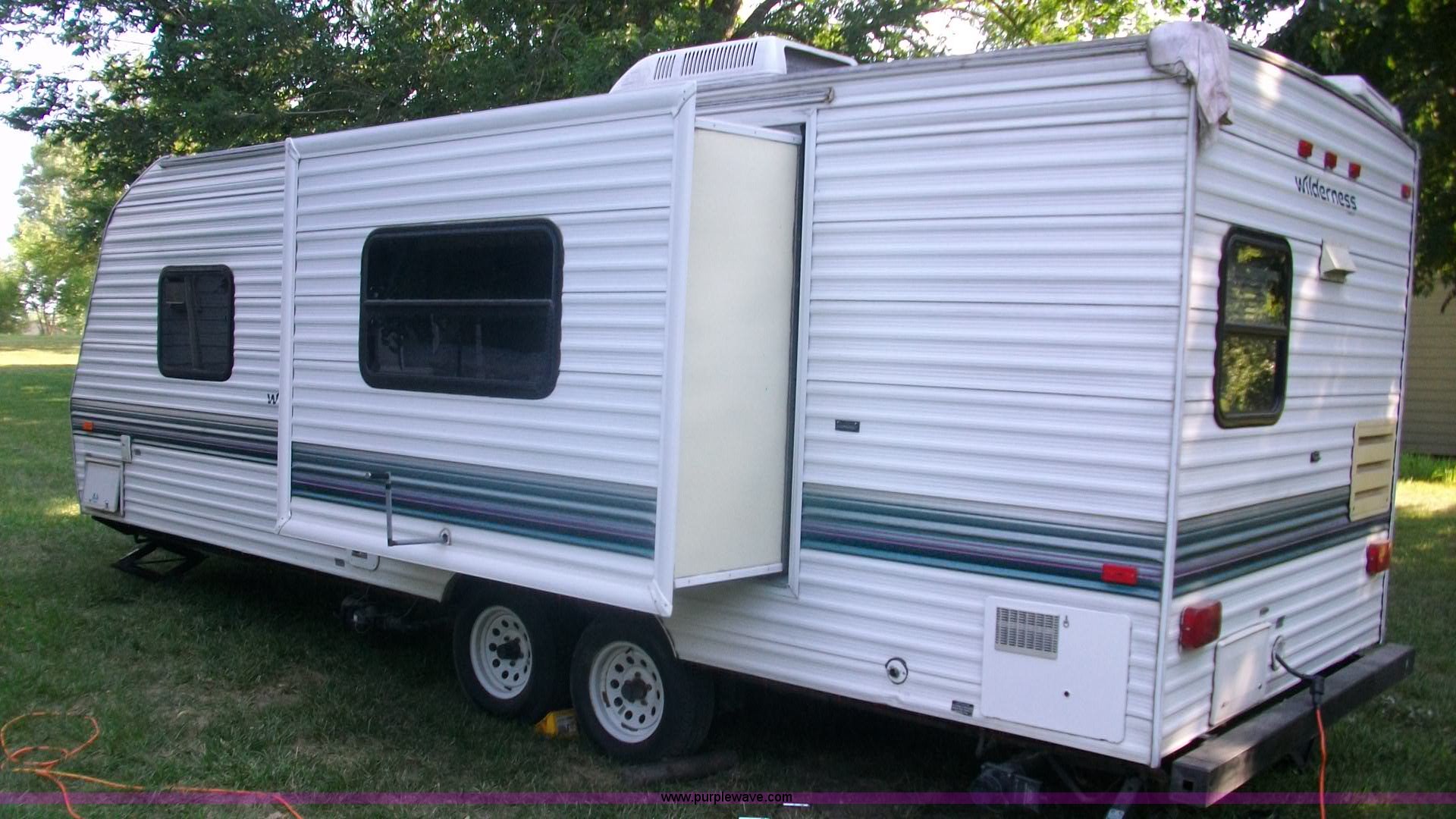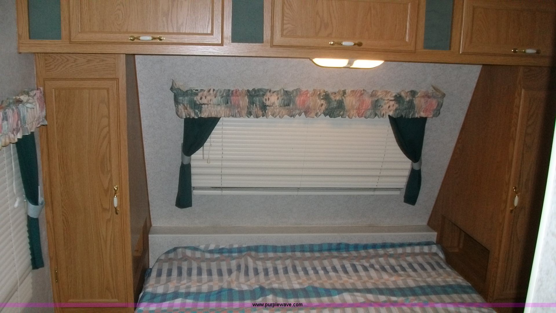 Purple Wave is selling a used RV in Kansas. This item is a 1997 Fleetwood LY Spearmint camper with the following: Slide-out, Sofa bed, Side dinette, Microwave oven compartment, Mini blinds, AC, 20M BTU forced air furnace, Tinted side windows, Double door refrigerator, Sink, Shower, Toilet, Stereo system, Rear sink and mirror, Island queen bed, Television shelf and cabinets with television, Oak frame cabinet door, Vinyl flooring covering, 40 gallon fresh water tank, (2) propane tanks, 2 5/16" ball hitch, Scissor jacks, Owner's manual, Spoke wheels, Awning needs to be replaced