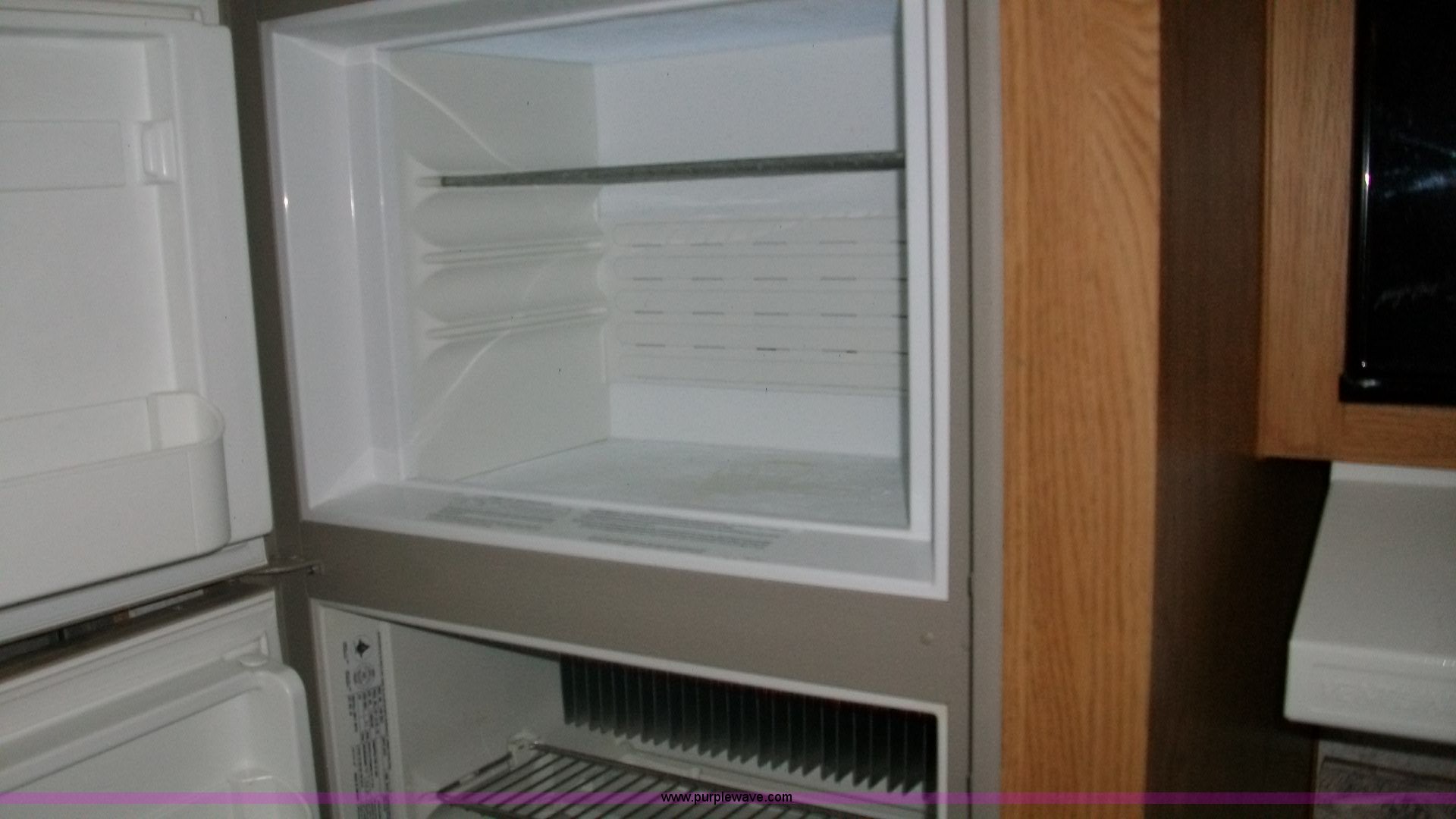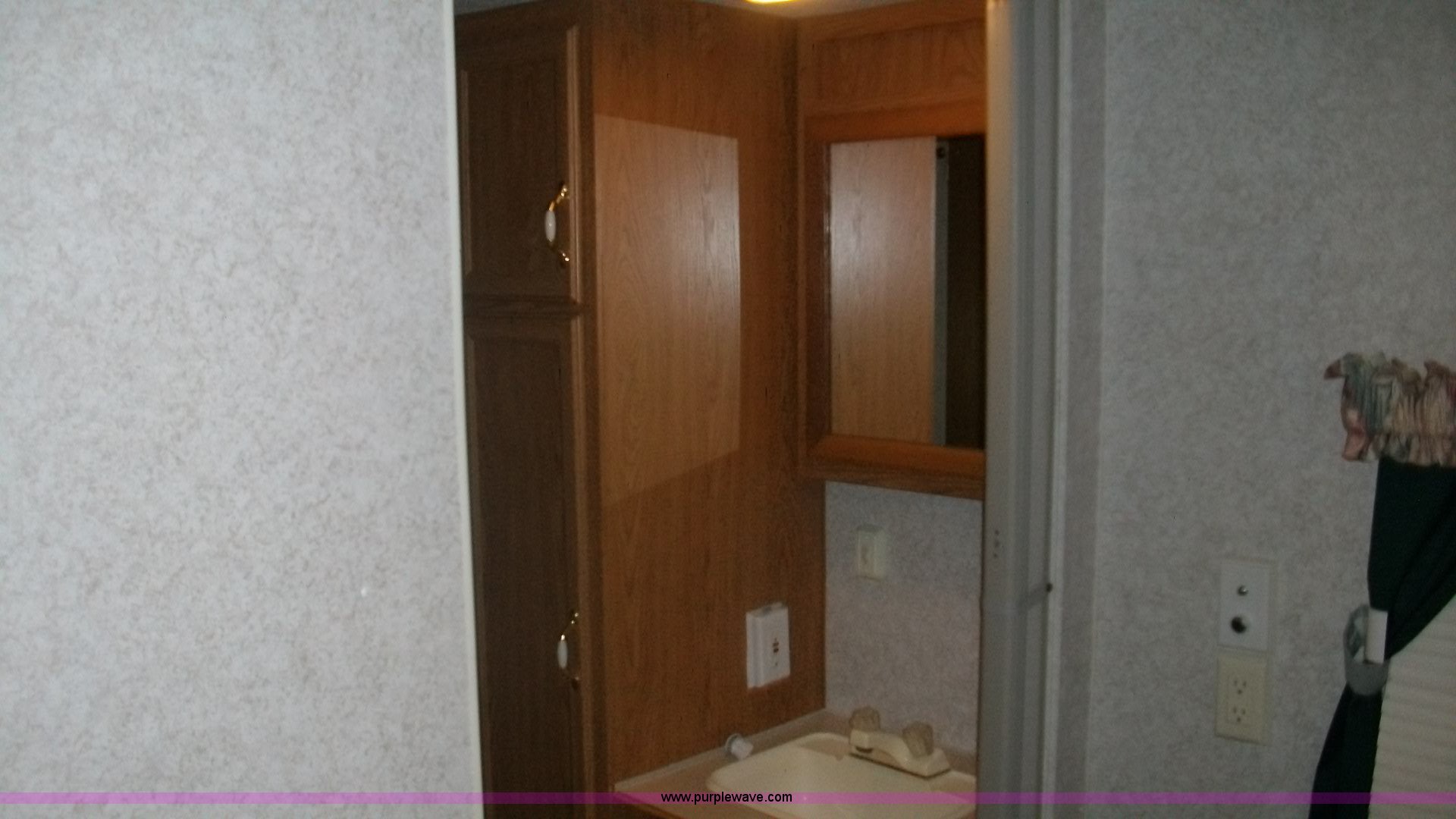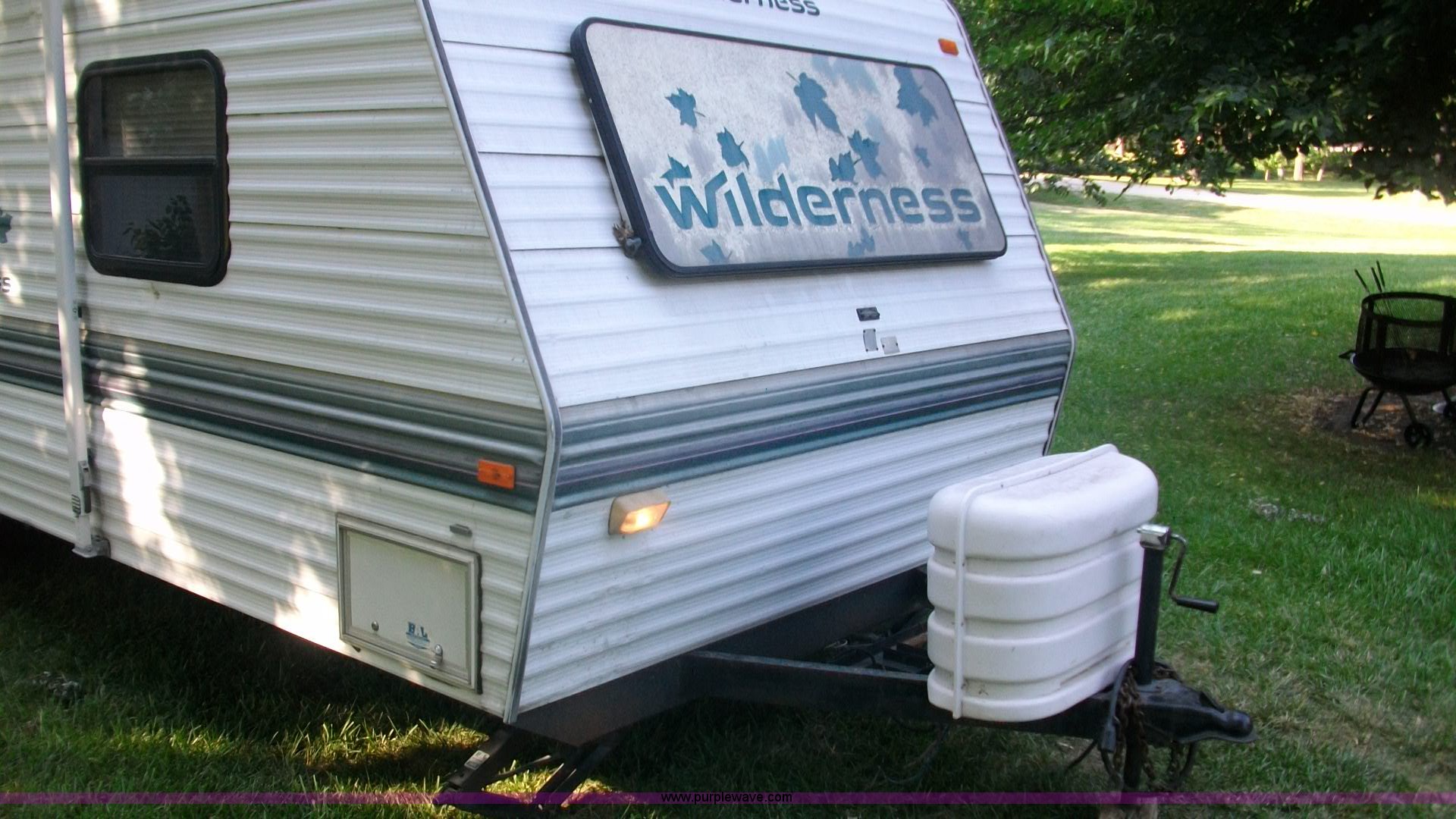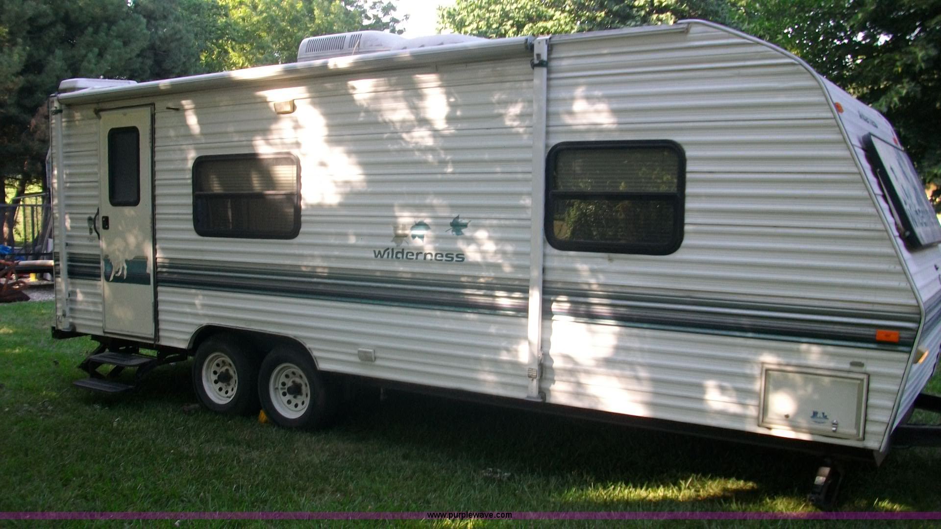Purple Wave is selling a used RV in Kansas. This item is a 1997 Fleetwood LY Spearmint camper with the following: Slide-out, Sofa bed, Side dinette, Microwave oven compartment, Mini blinds, AC, 20M BTU forced air furnace, Tinted side windows, Double door refrigerator, Sink, Shower, Toilet, Stereo system, Rear sink and mirror, Island queen bed, Television shelf and cabinets with television, Oak frame cabinet door, Vinyl flooring covering, 40 gallon fresh water tank, (2) propane tanks, 2 5/16" ball hitch, Scissor jacks, Owner's manual, Spoke wheels, Awning needs to be replaced