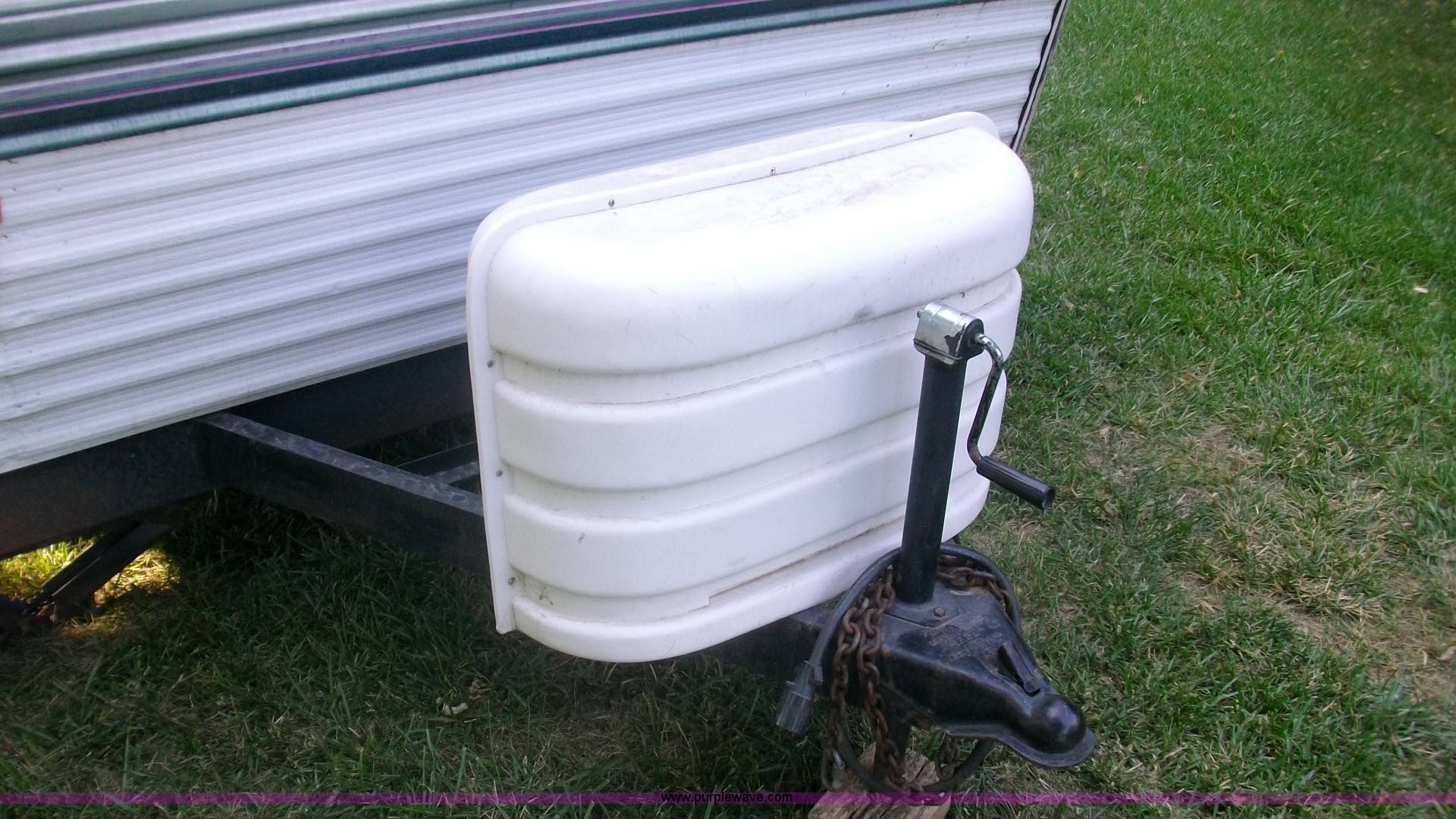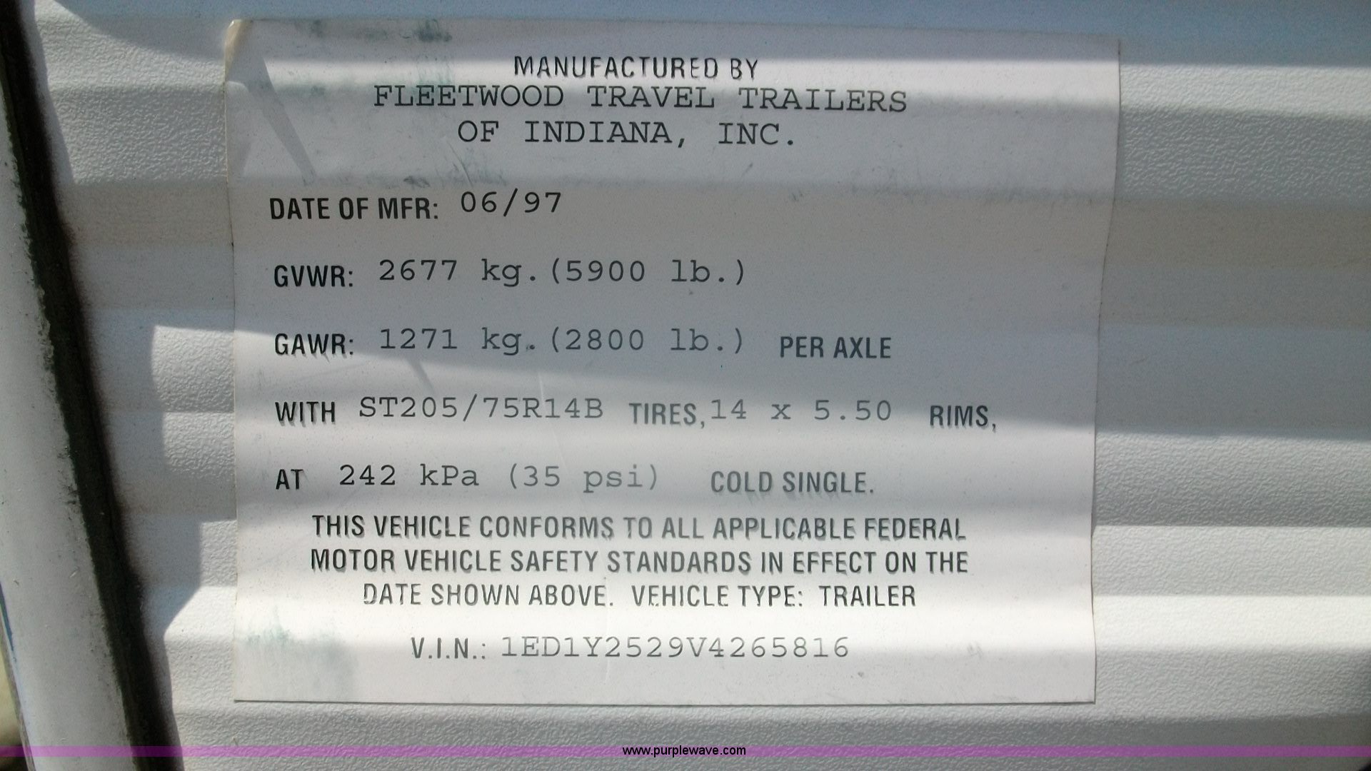 1997 Fleetwood LY Spearmint camper. Slide-out, Sofa bed, Side dinette, Microwave oven compartment, Mini blinds, AC, 20M BTU forced air furnace, Tinted side windows, Double door refrigerator, Sink, Shower, Toilet, Stereo system, Rear sink and mirror, Island queen bed, Television shelf and cabinets with television, Oak frame cabinet door, Vinyl flooring covering, 40 gallon fresh water tank, (2) propane tanks, 2 5/16" ball hitch, Scissor jacks, Owner's manual, Spoke wheels, Awning needs to be replaced. 1ED1Y2529V4265816. Shipping quotes available. Wamego, KS 66547