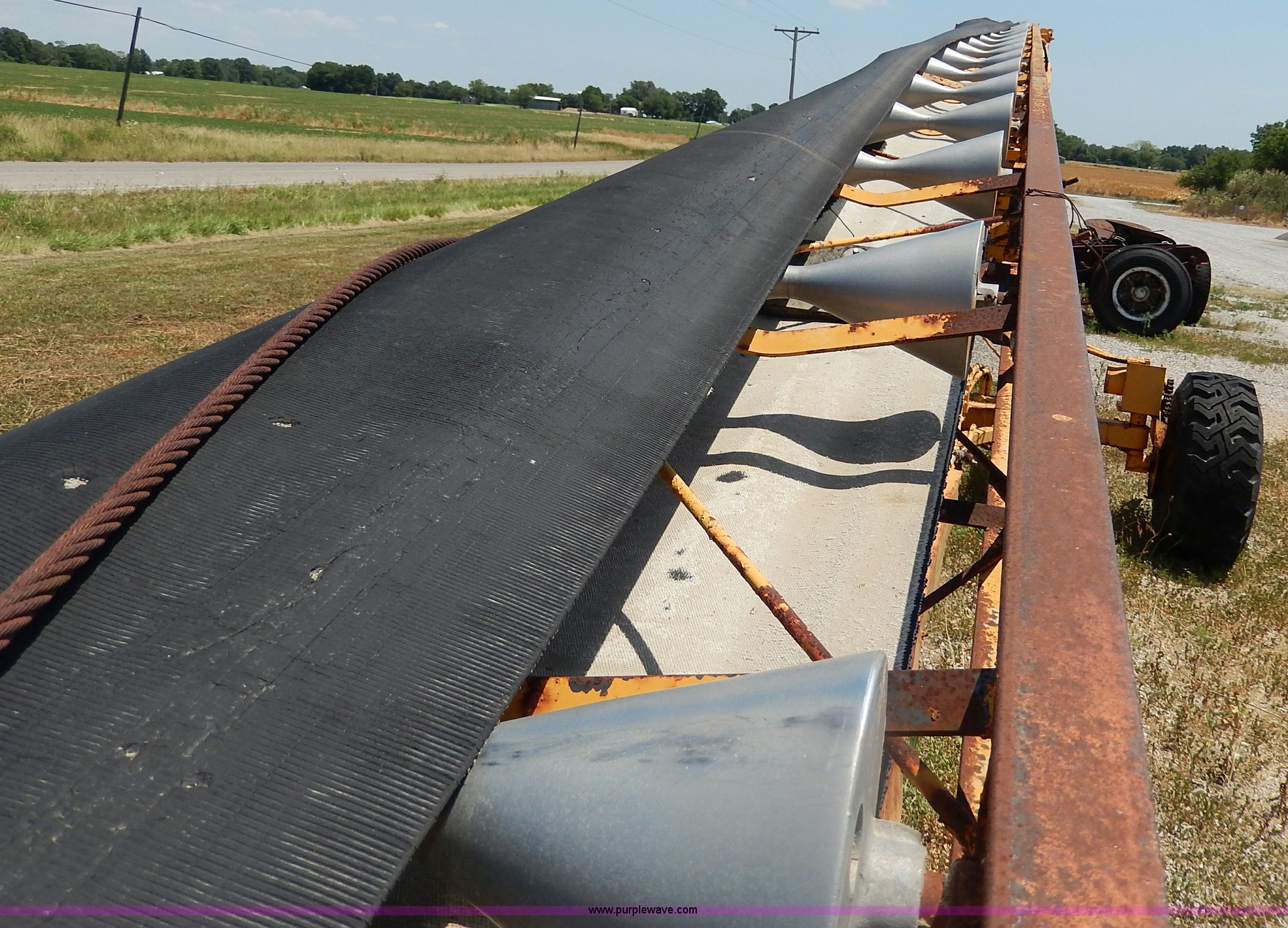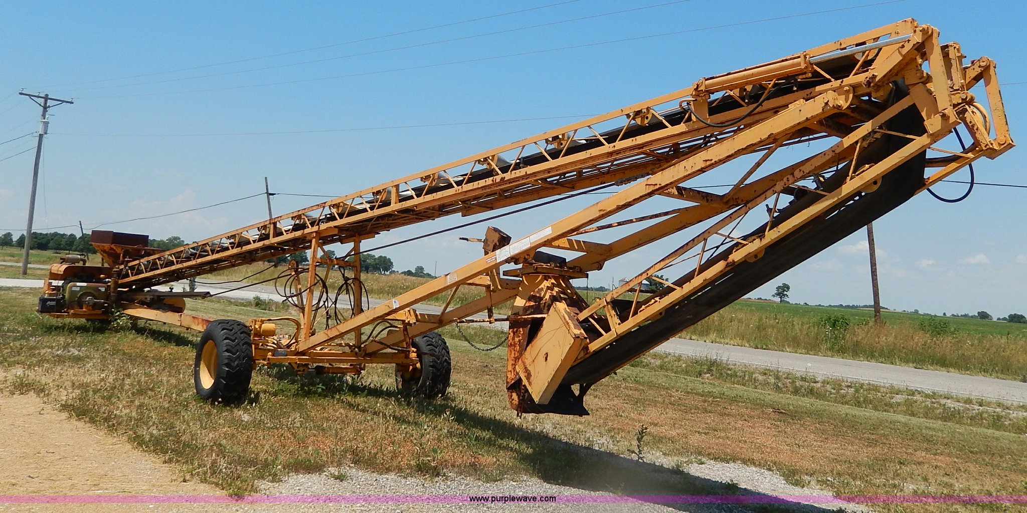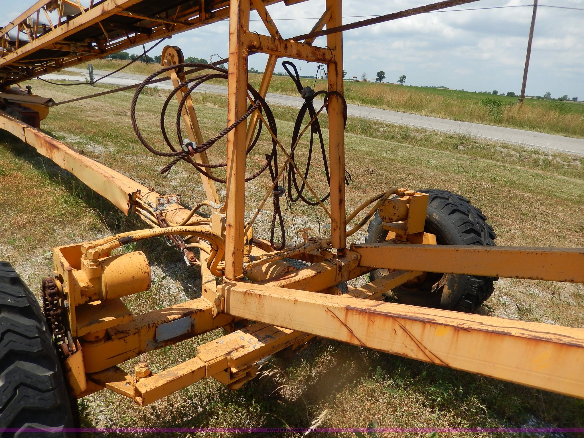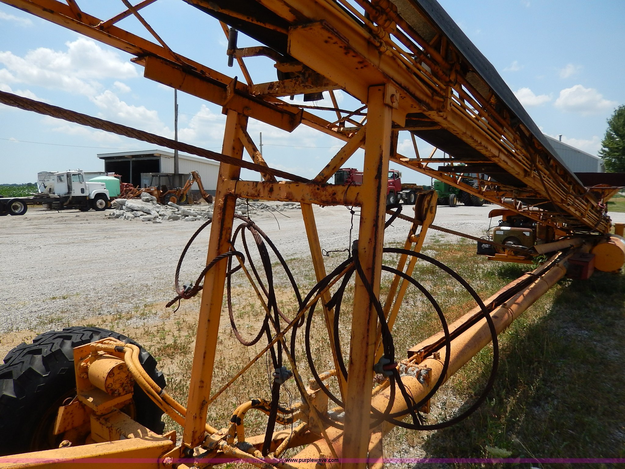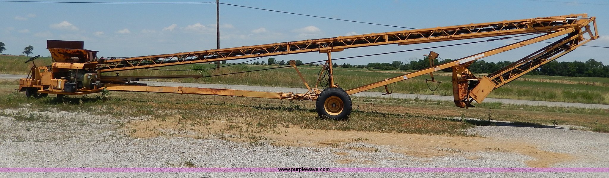 Purple Wave is selling a used Auger or Conveyor in Missouri. This item is a Morgan concrete conveyor with the following: 55'L, 10'L articulating boom, 65' overall length, 16"W belt, Gas engine, Unknown running condition, Pintle hitch, Hydraulics, 12-16.5 tires, Spare tire