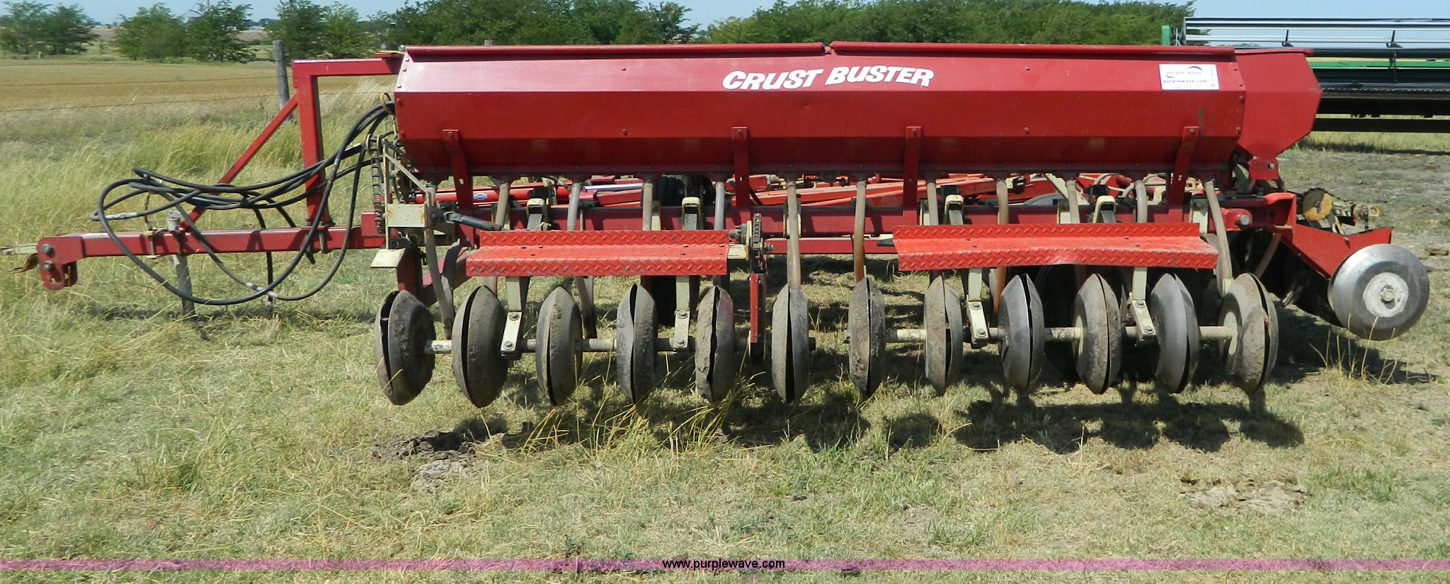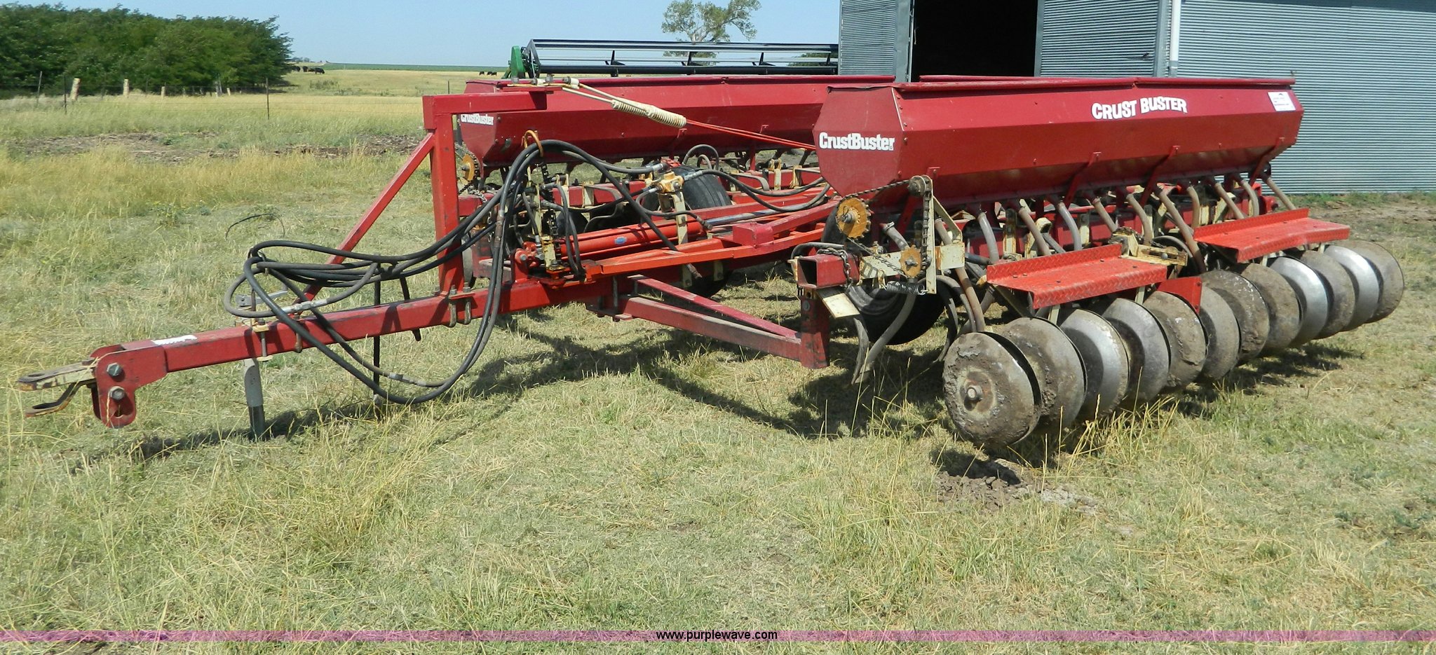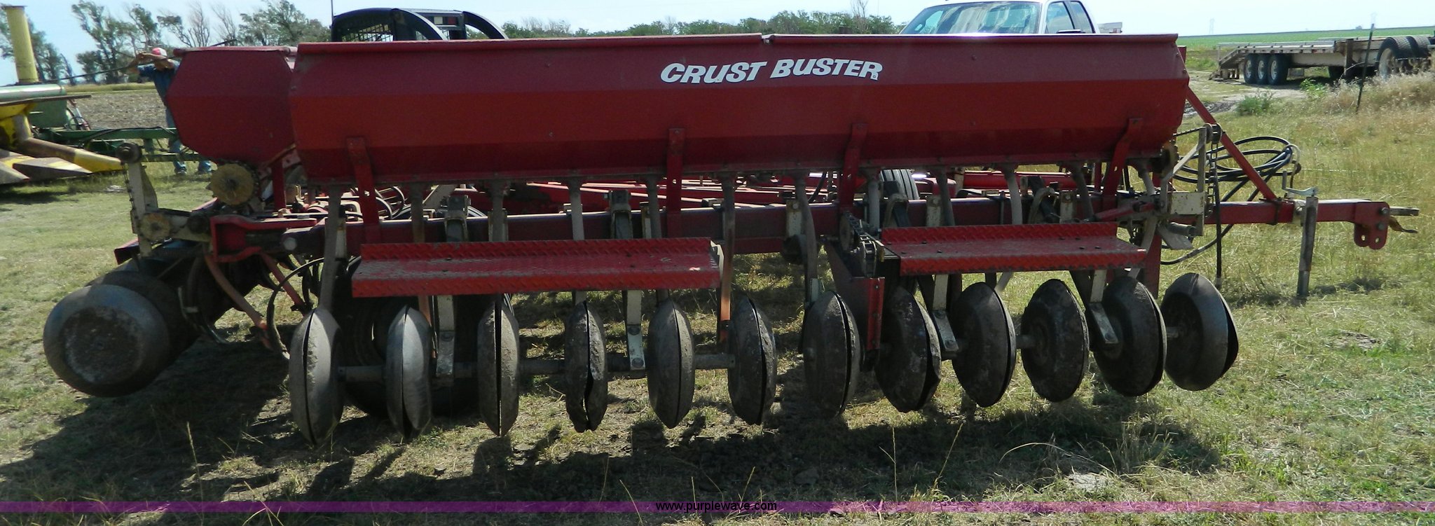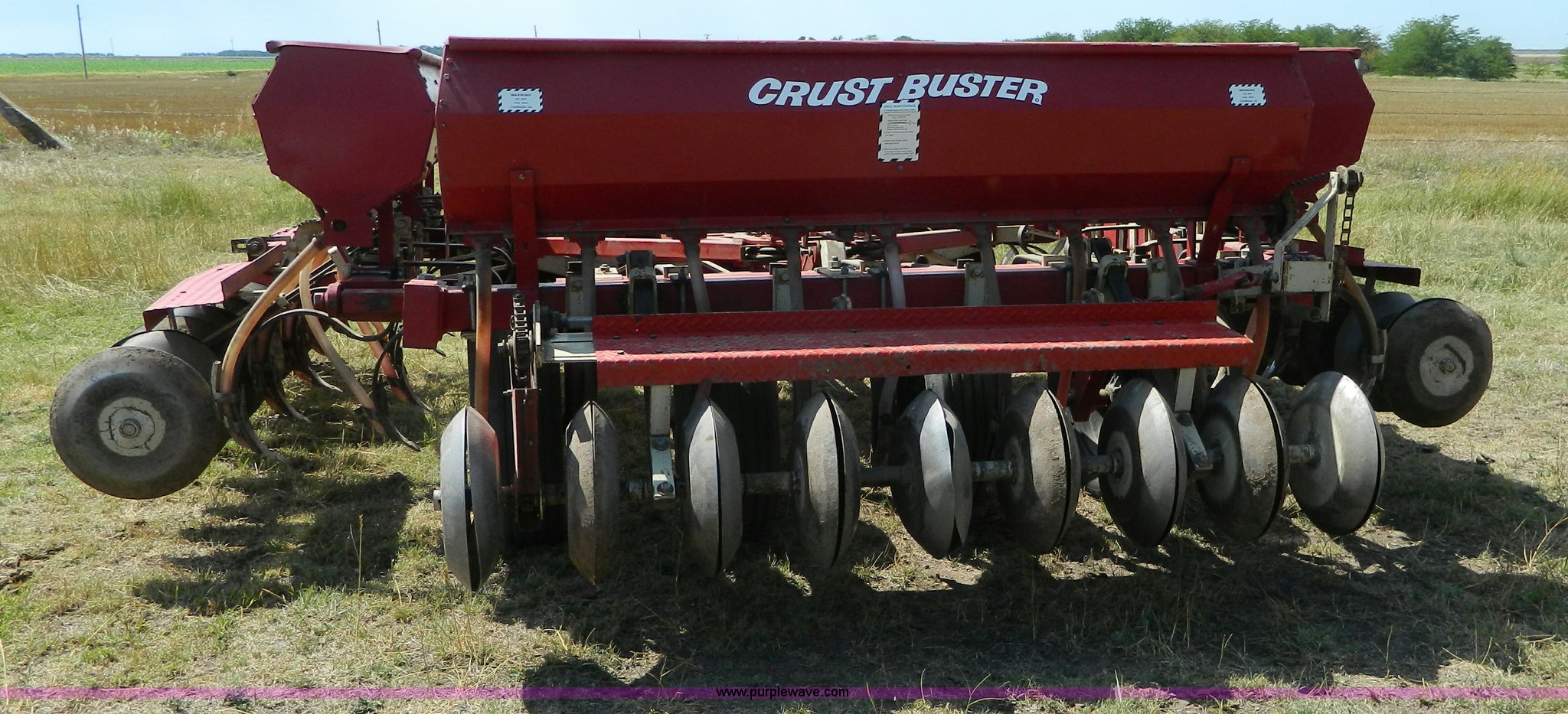 Purple Wave is selling a used Grain Drill or Seeder in Kansas. This item is a CrustBuster grain drill with the following: 10" spacing, Chisel points, Steel press wheels, Rubber delivery tubes, 6.70-15 implement tires, Stored inside