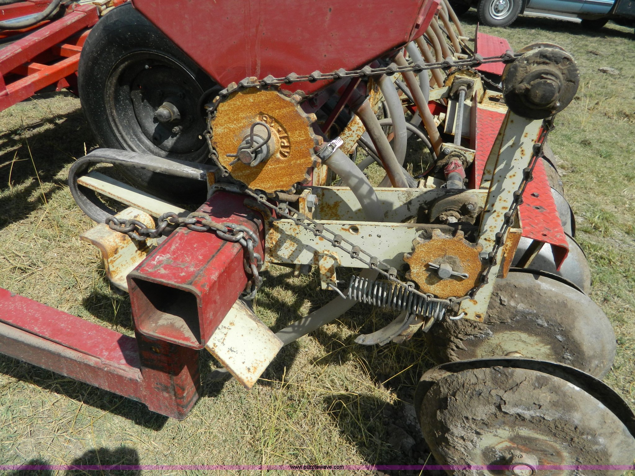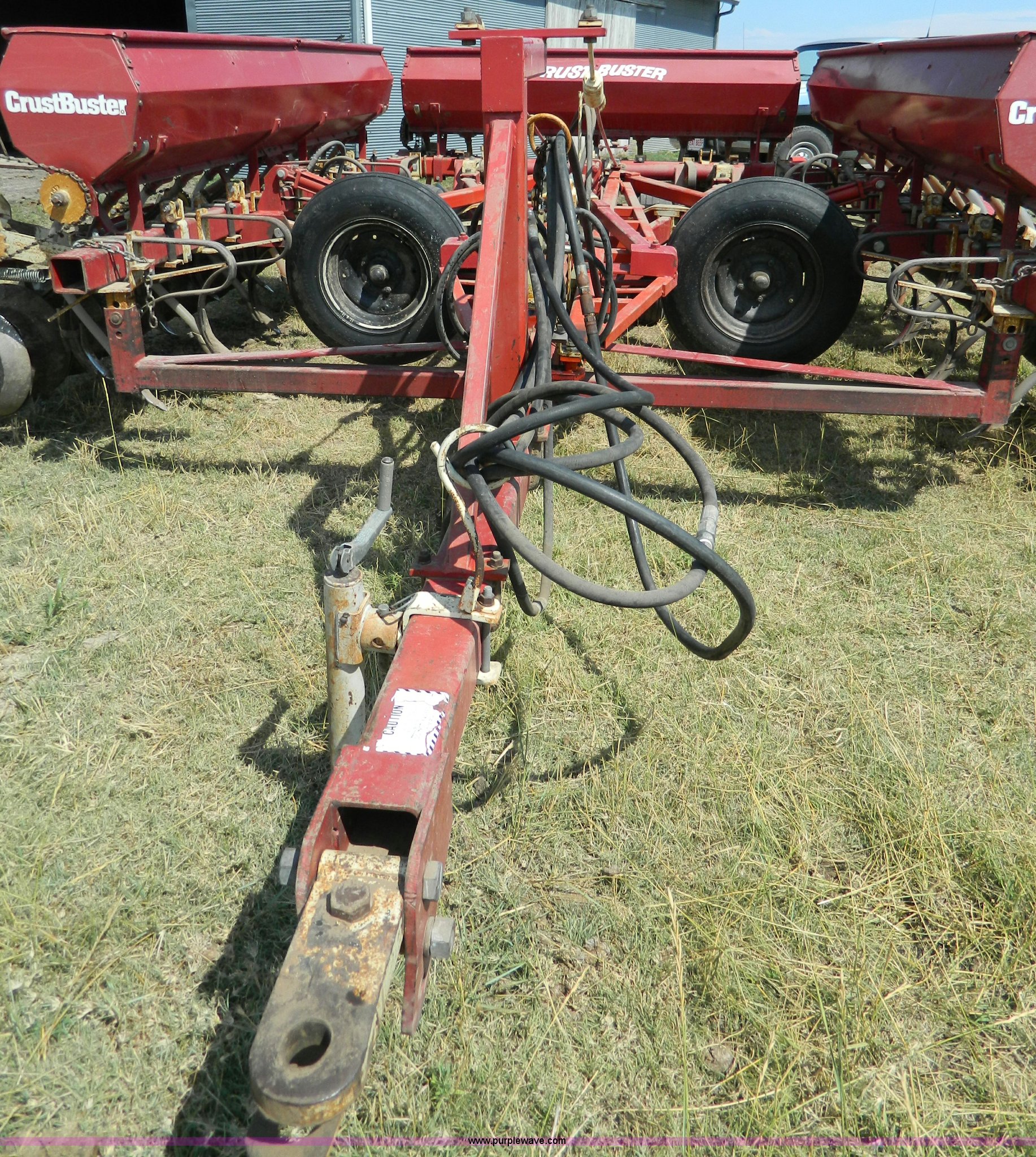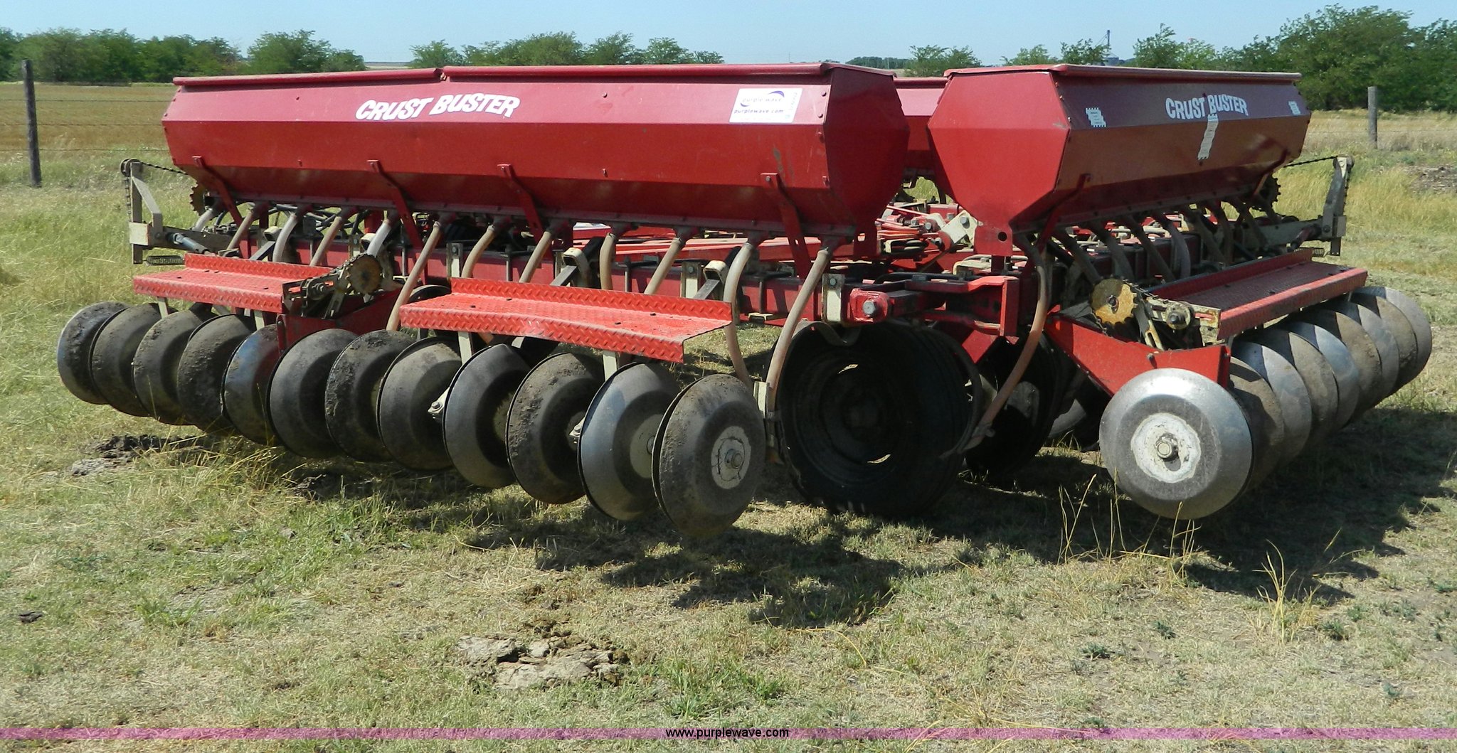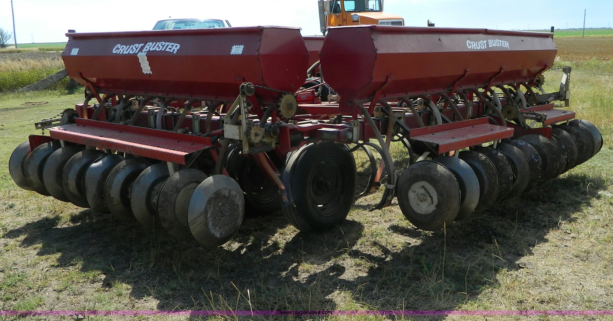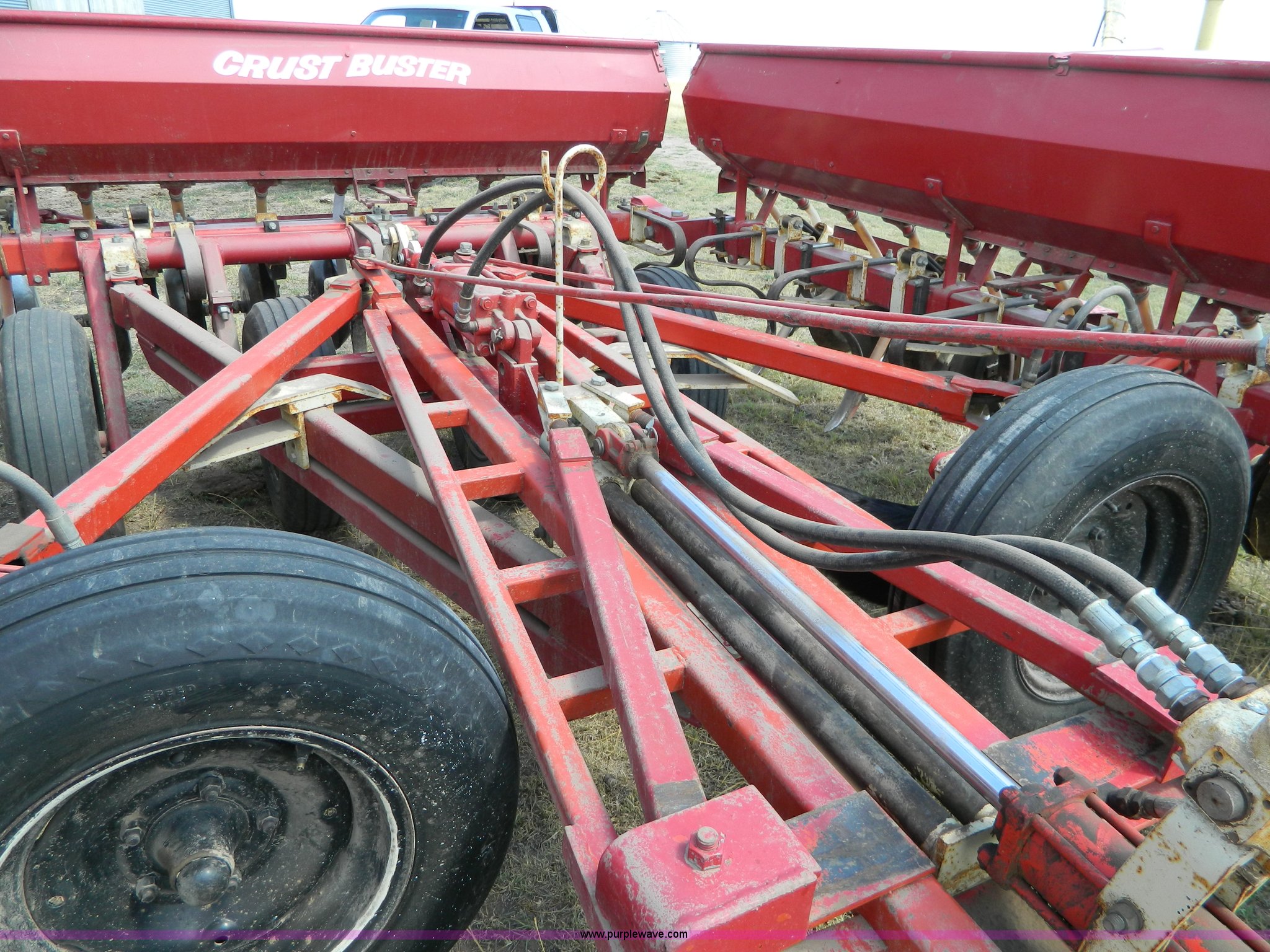 Purple Wave is selling a used Grain Drill or Seeder in Kansas. This item is a CrustBuster grain drill with the following: 10" spacing, Chisel points, Steel press wheels, Rubber delivery tubes, 6.70-15 implement tires, Stored inside