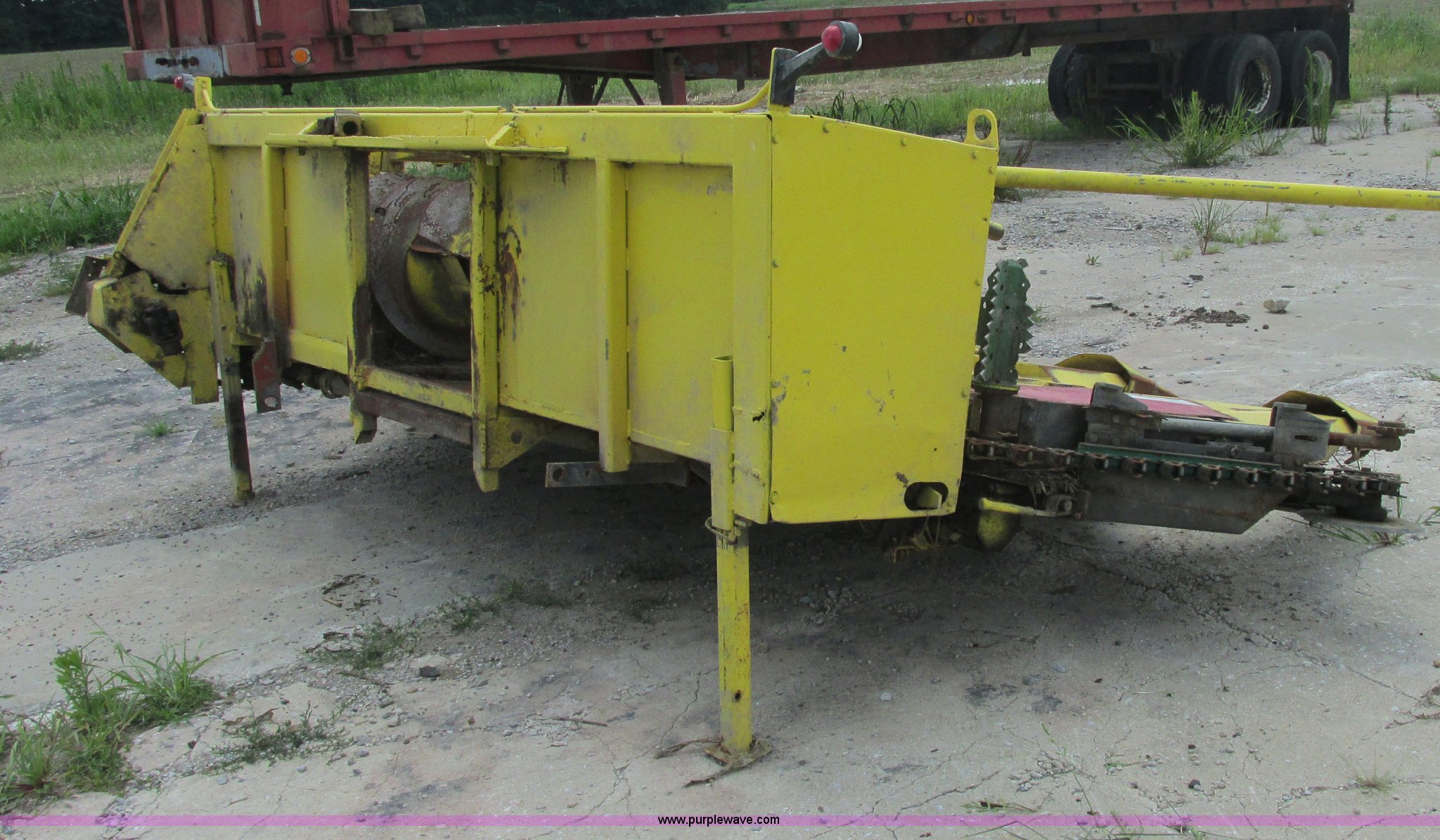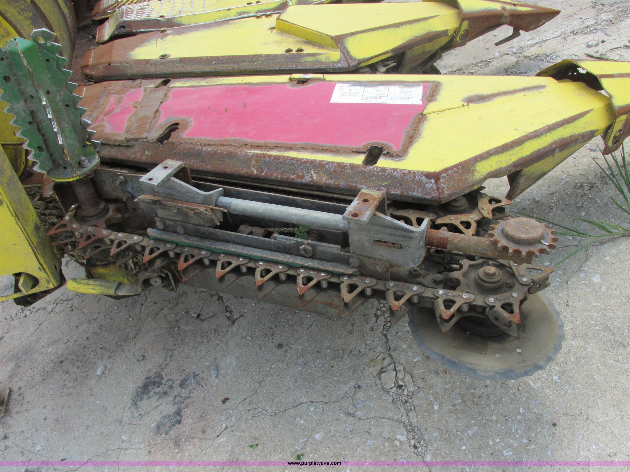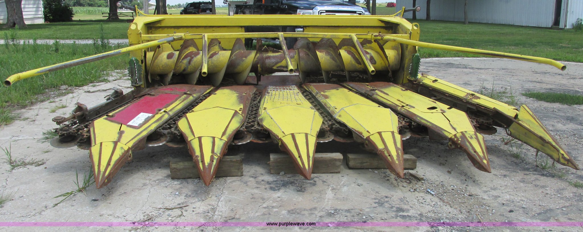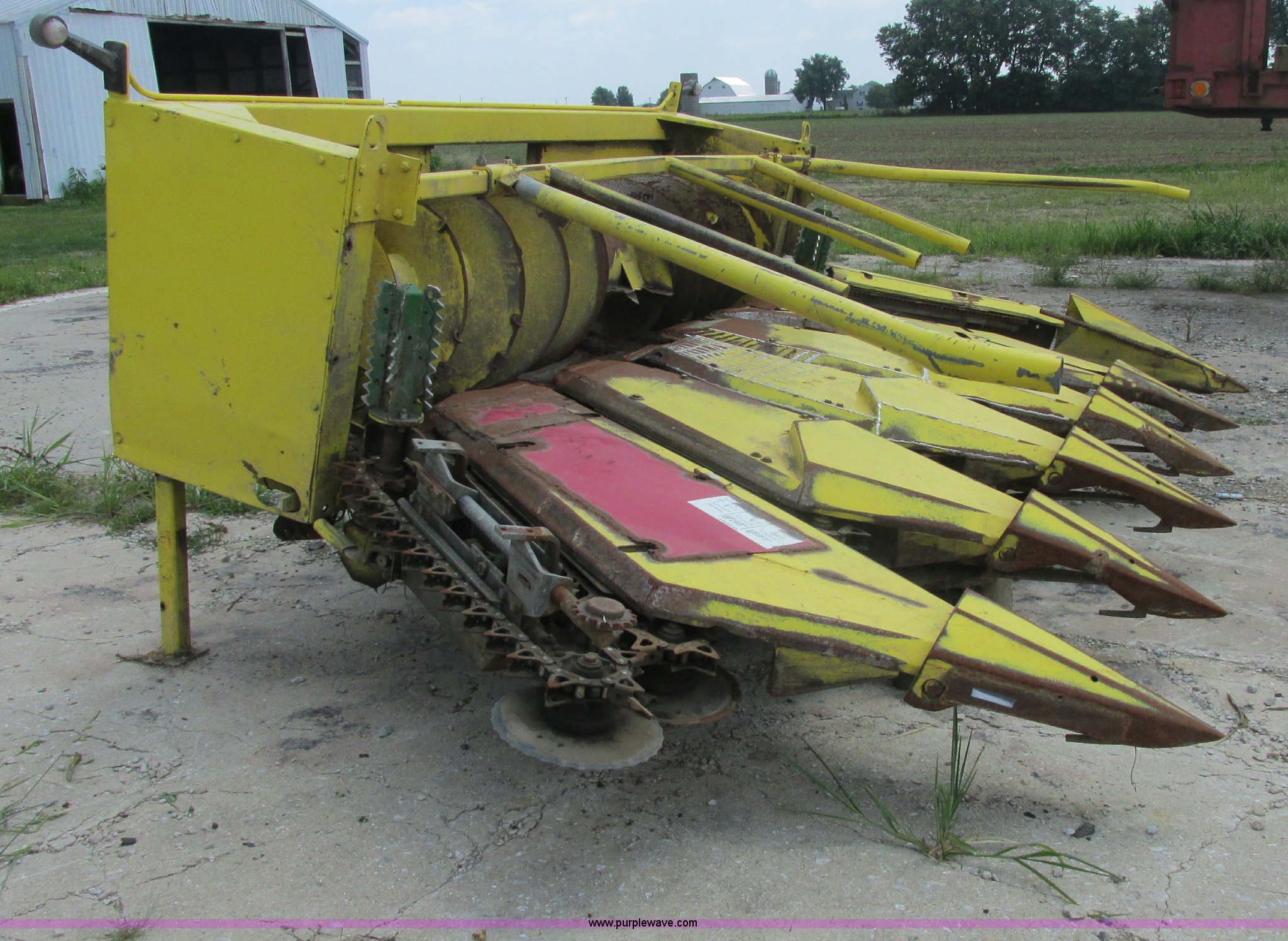 Purple Wave is selling a used Forage Head or Silage Handling in Illinois. This item is a 1990 John Deere 666 forage harvester row crop head with the following: 14' overall width, Six row cut, Self sharpening blades, Detach stands in rear, Missing one shield, Serial 004368