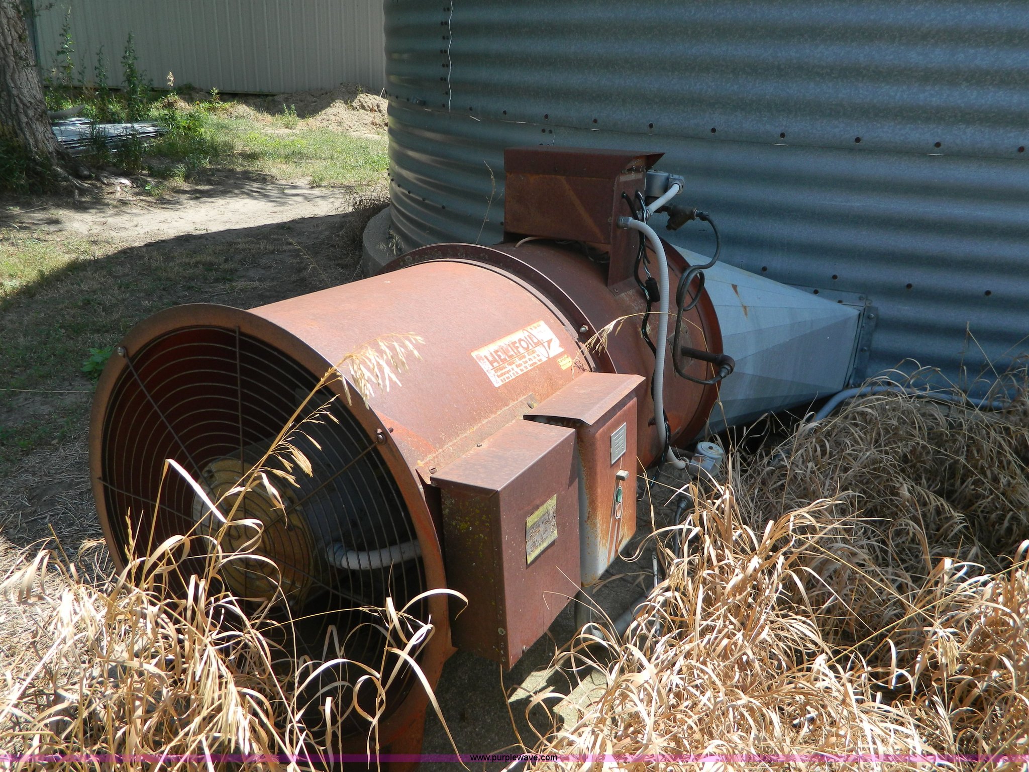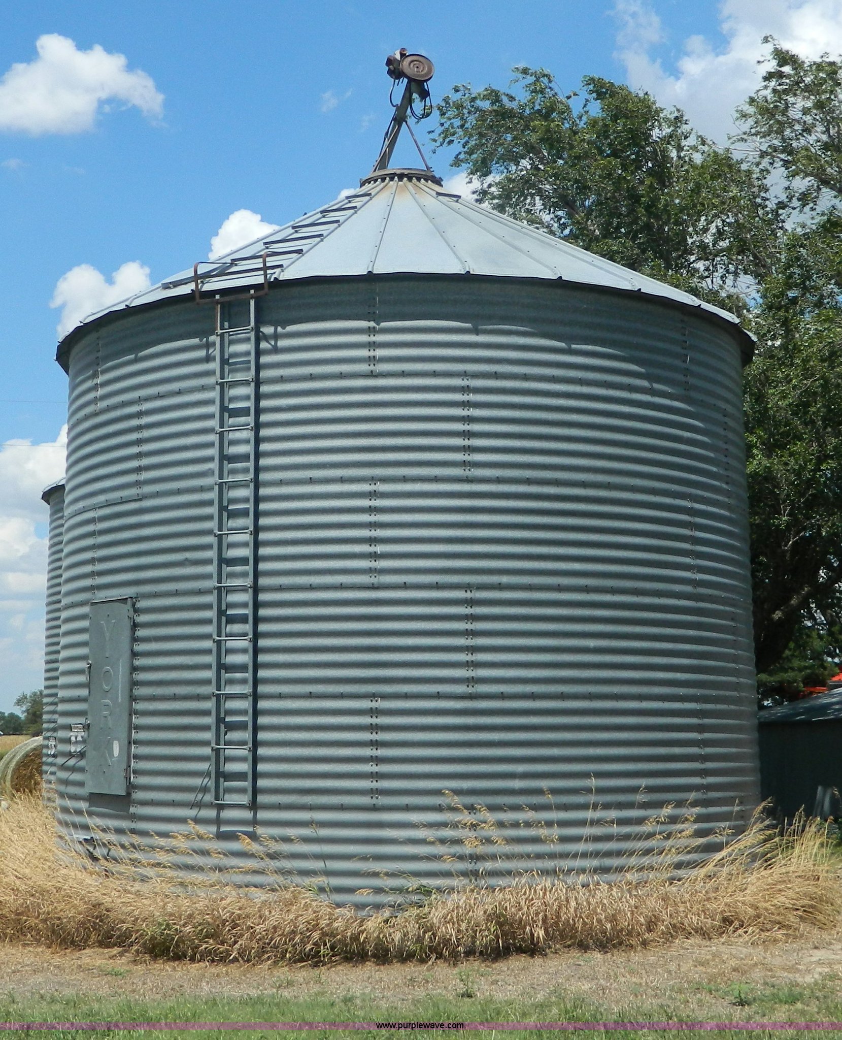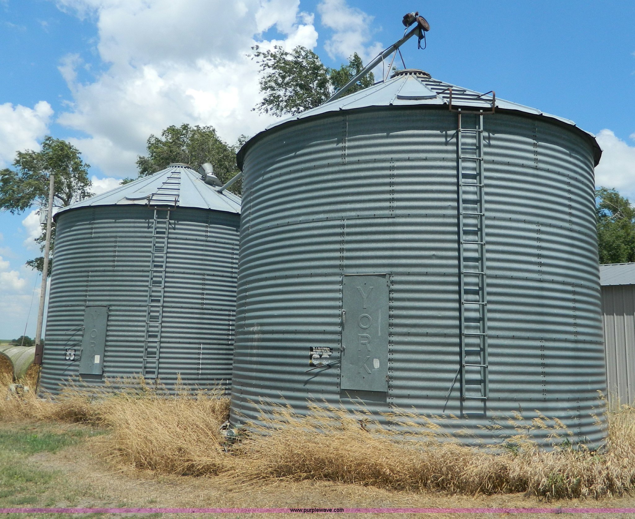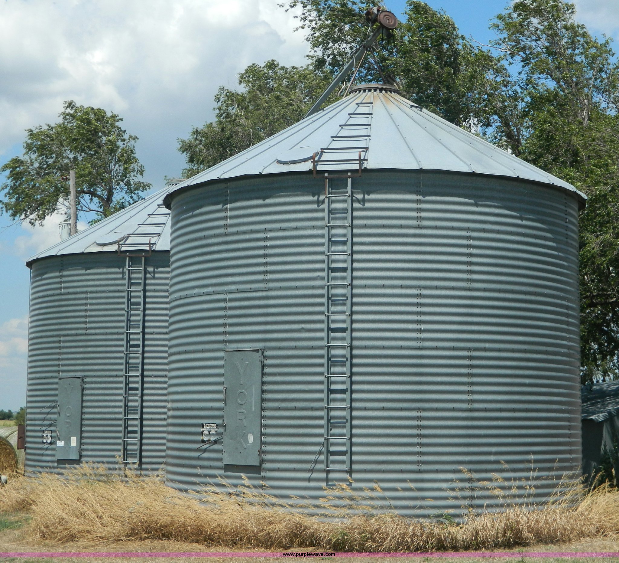Purple Wave is selling a used Other Grain or Fertilizer Handling in Kansas. This item is a (2) York galvanized grain bins with the following: Six rings, 21 1/2 diameter, 17'H to bottom of dome cone, Approximately 5,500 bushel wheat capacity per bin, Augers, Electrical blower, Dryer and components