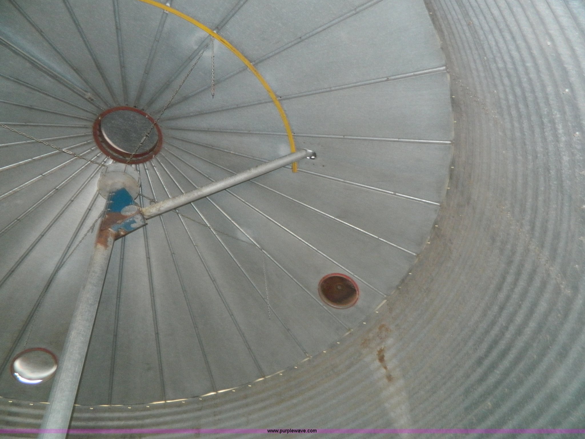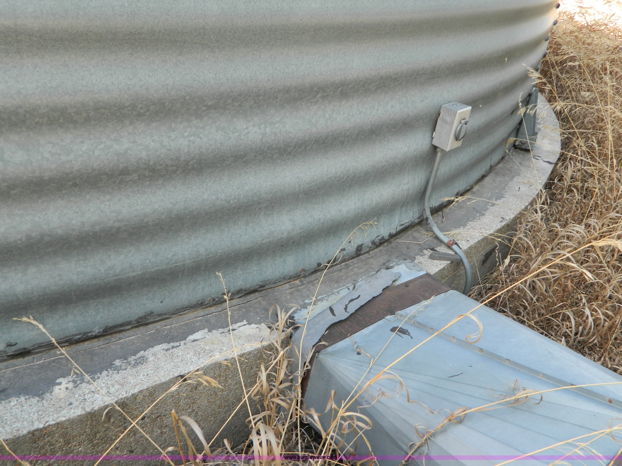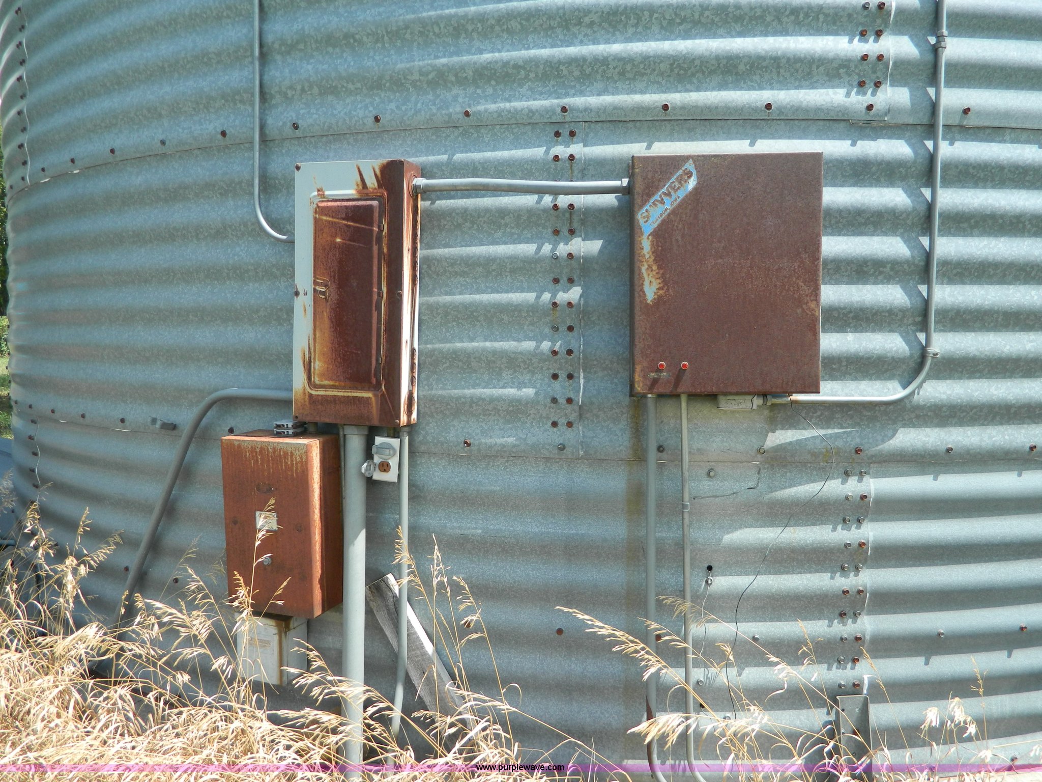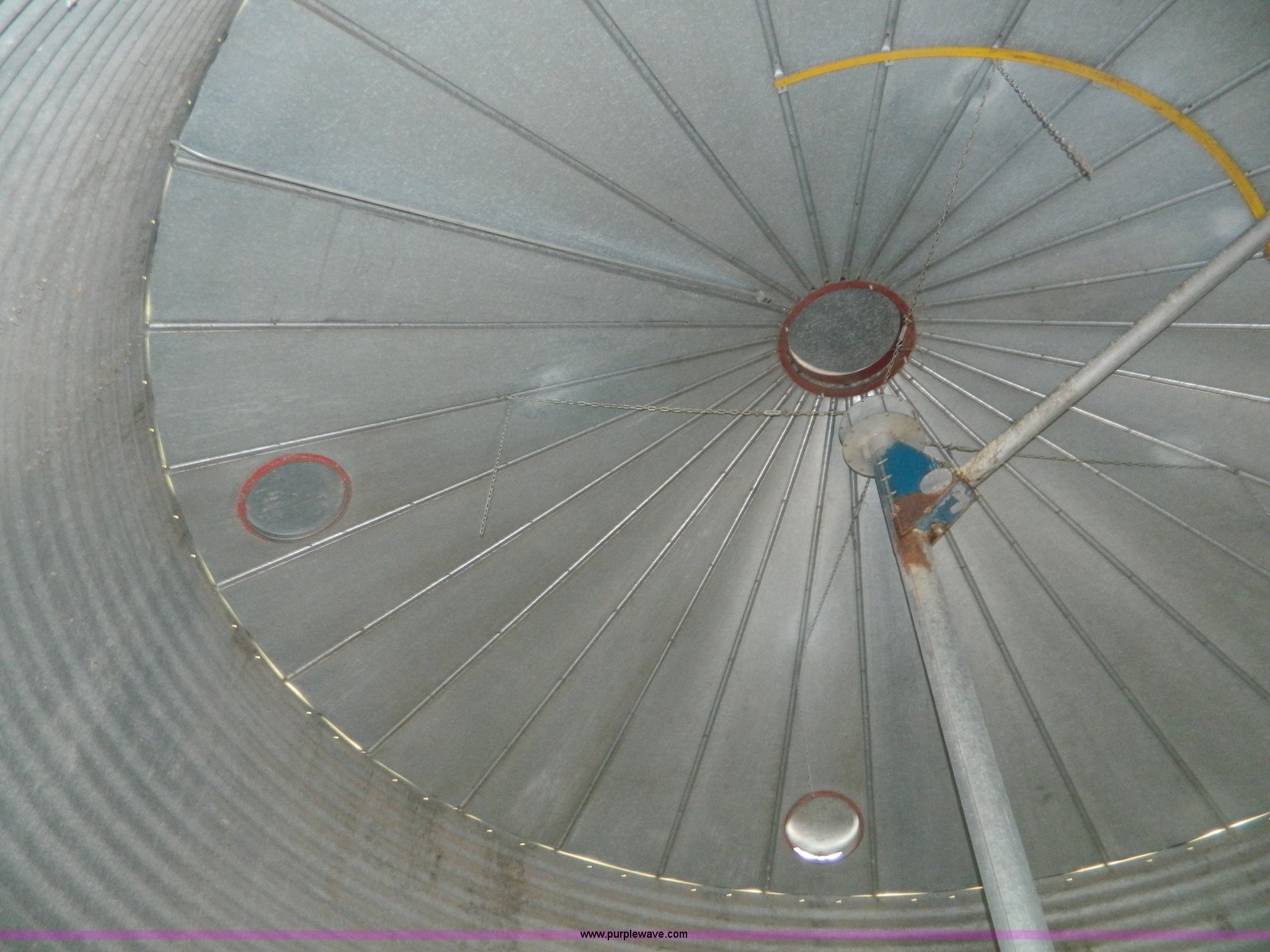 Purple Wave is selling a used Other Grain or Fertilizer Handling in Kansas. This item is a (2) York galvanized grain bins with the following: Six rings, 21 1/2 diameter, 17'H to bottom of dome cone, Approximately 5,500 bushel wheat capacity per bin, Augers, Electrical blower, Dryer and components