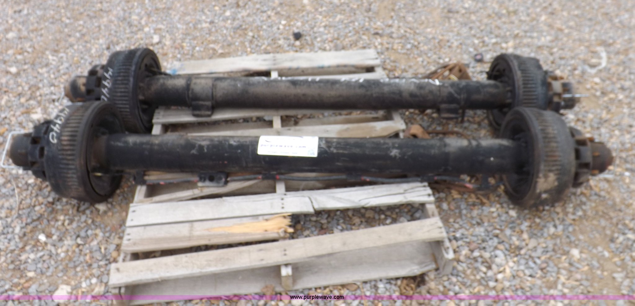 Purple Wave is selling a used Automotive Parts or Acces. in Kansas. This item is a (2) Dexter 10,000 lbs axles with the following: 75.5" hub face to hub face, Electric brakes, Eight bolt pilot hub wheels, Oil bath bearings, Mounting hardware, (2) broken studs