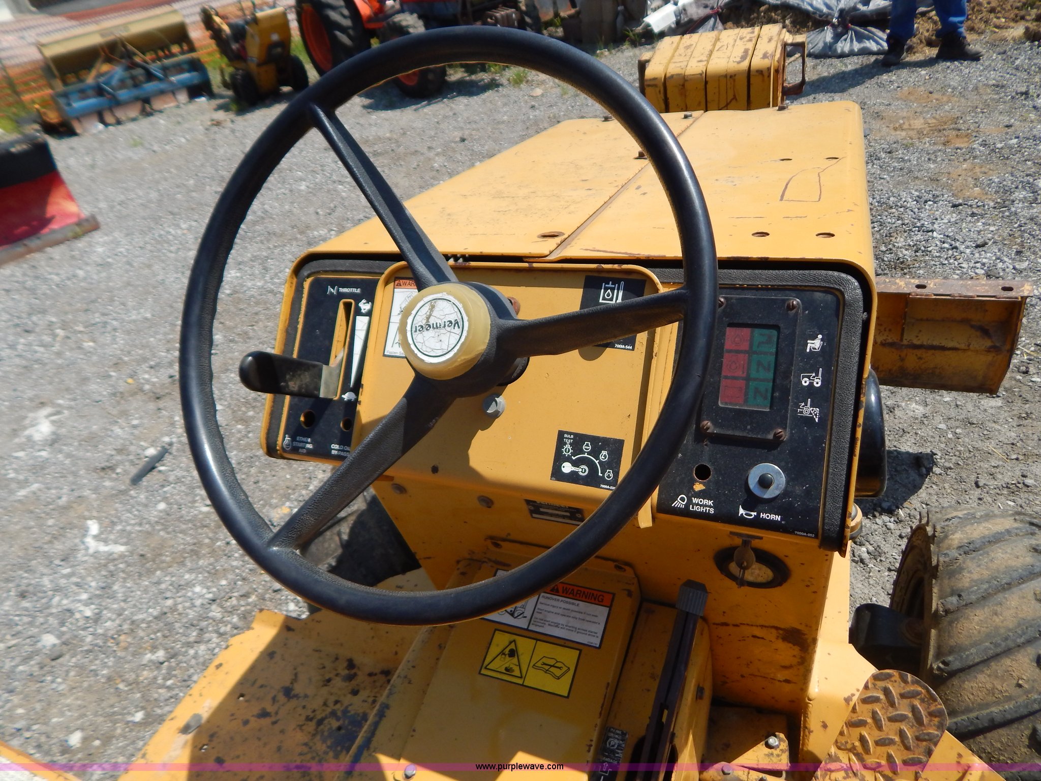 Purple Wave is selling a used Trencher or Rock Saw in Missouri. This item is a 1995 Vermeer V3550 trencher with the following: 1,379 hours on meter, Deutz F3L-1011 diesel engine, Vermeer V3550TR trencher bar, 4'L x 4"W trencher bar, Serial 1VRM050DXS1000263, 54"W blade, Front weights, 26x12x12 tires, 4,350 lbs. base operating weight, Serial 1VRF072U3S1000266