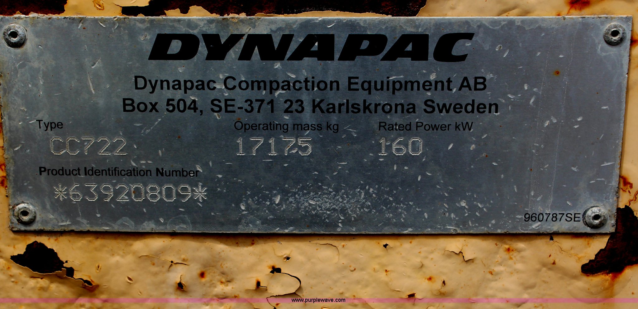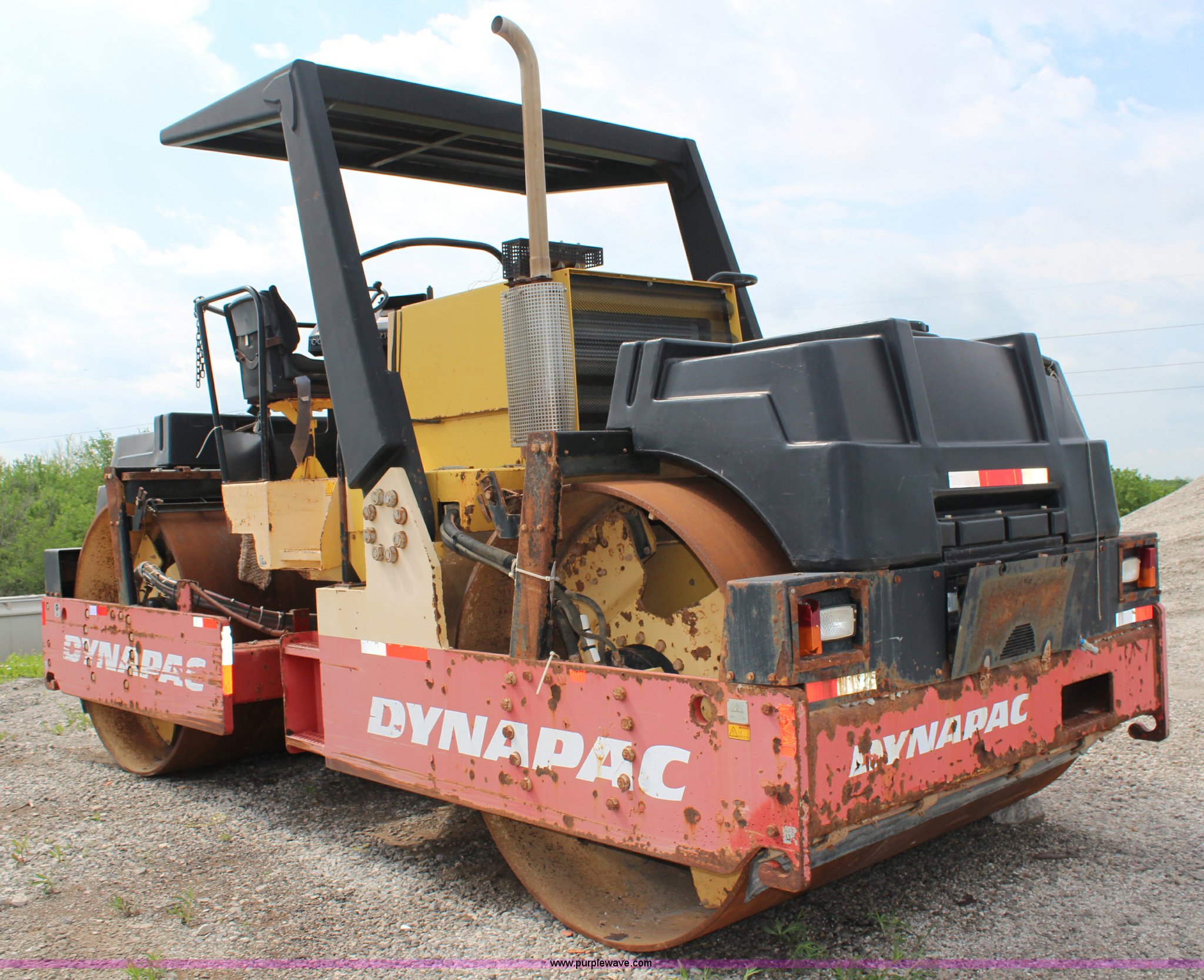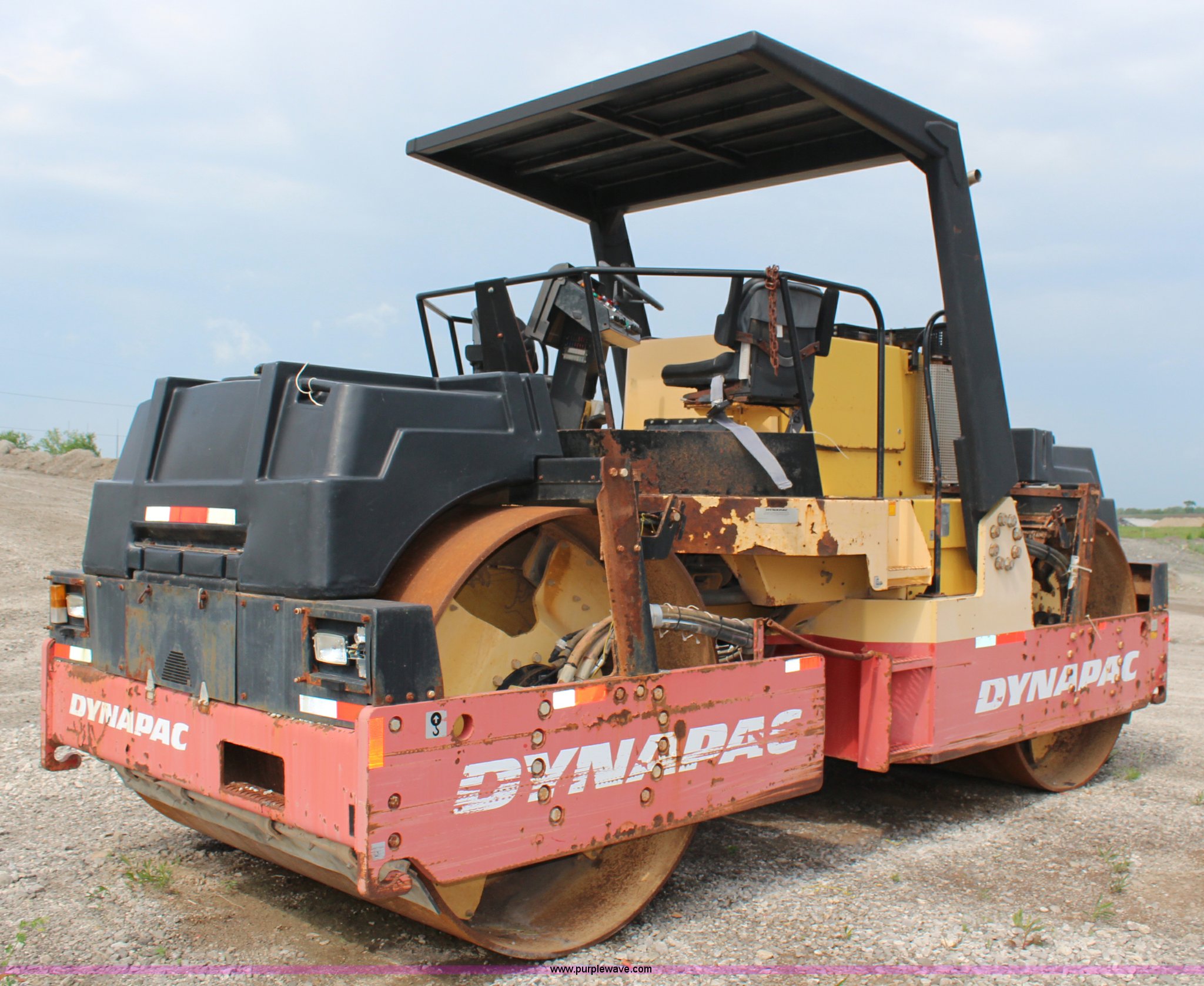 Purple Wave is selling a used Double Drum Roller Compactor in Kansas. This item is a 2005 Dynapac CC722 vibratory roller with the following: 1,934 hours on meter, Cummins six cylinder diesel engine, Hydrostatic transmission, Double drum, 7'W x 5' diameter, Spray bar, Water tanks, Dual seats, Swivel control, 37,864 lbs. base operating weight, Serial 63920809