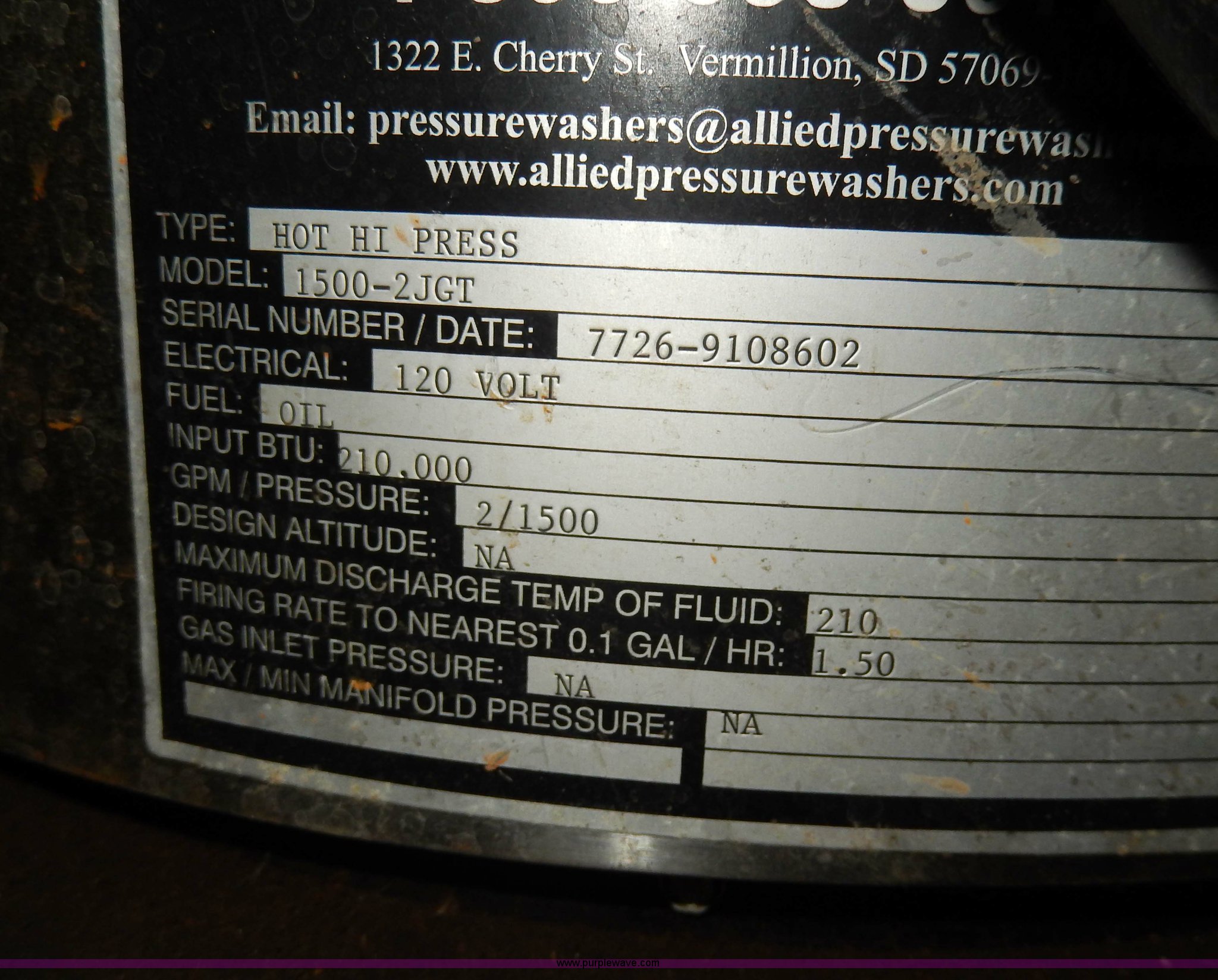 Purple Wave is selling a used Tools in South Dakota. This item is a Allied pressure washer with the following: Type Hot Hi Press, Model 1500-2JGT, Baldor 2 HP motor, Fuel: Diesel fuel / kerosene, 120V, 210,000 BTU input, 1,500 gpm, 210 degree max temperature, Hose and wand, New pump included