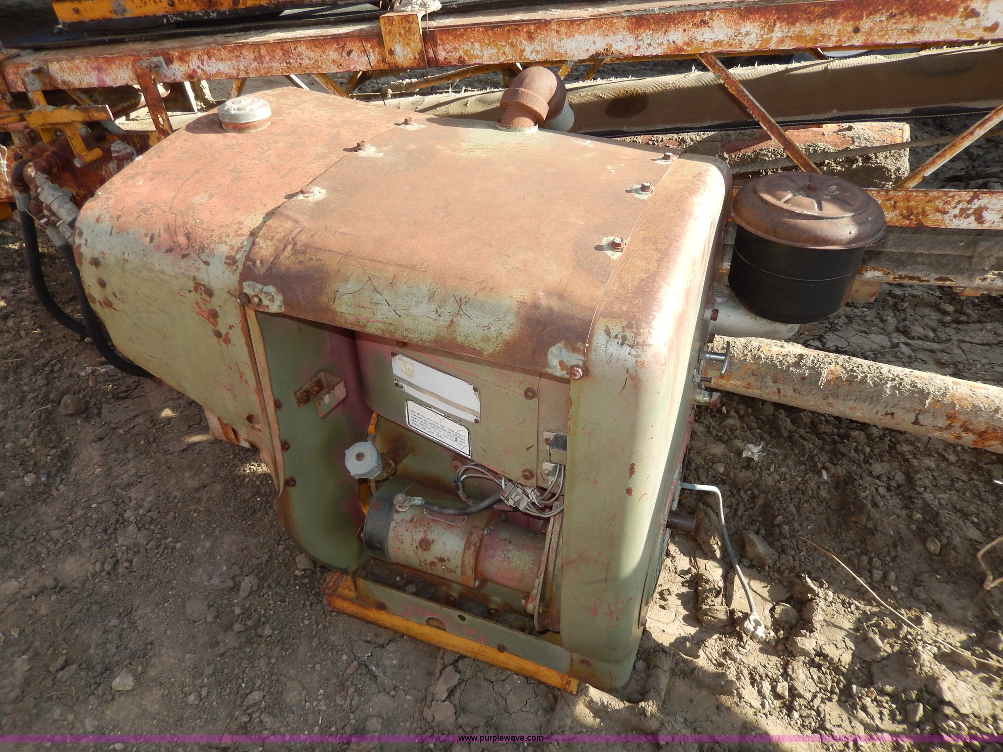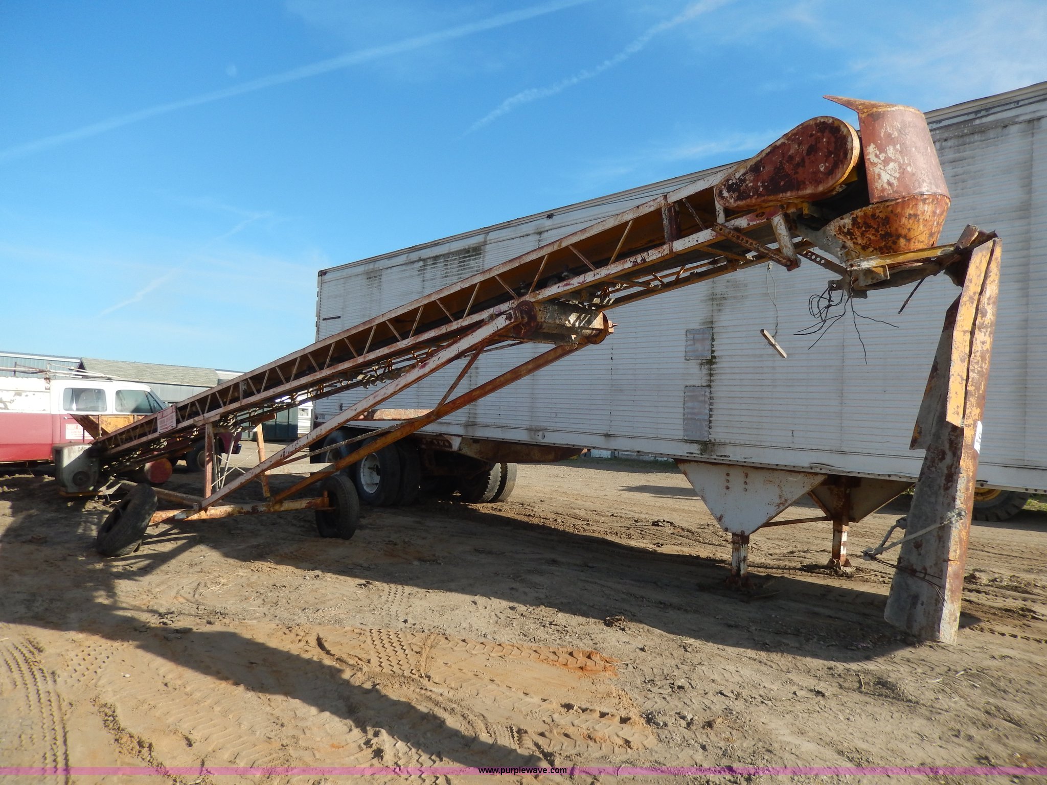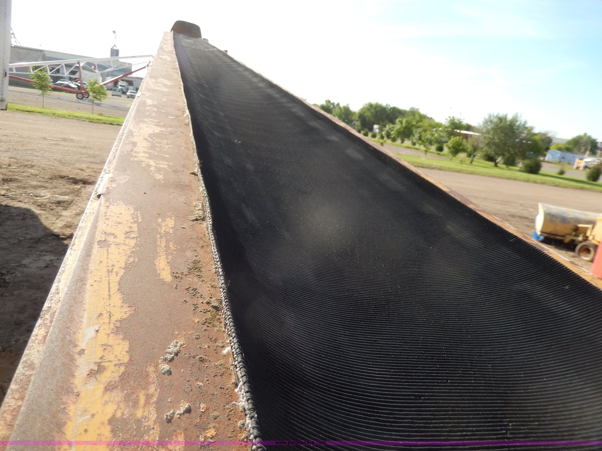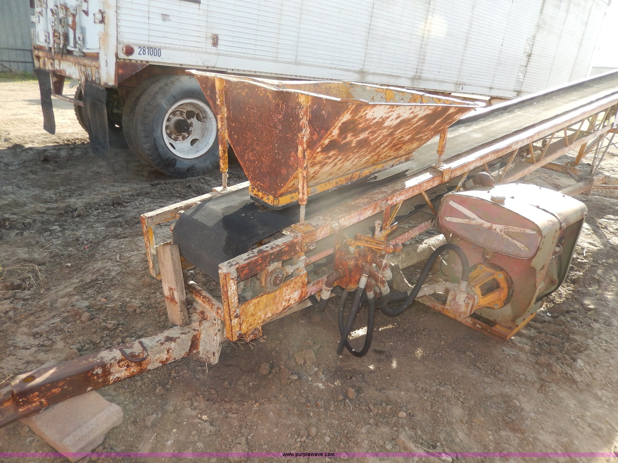 Purple Wave is selling a used Auger or Conveyor in South Dakota. This item is a Construction conveyor with the following: Wisconsin engine, Engine inoperable, 40'L, 15"W belt, End spout with extension, Pin hitch, Side manual controls, 7.00-15 tires, Bad tire will be replaced with a used tire
