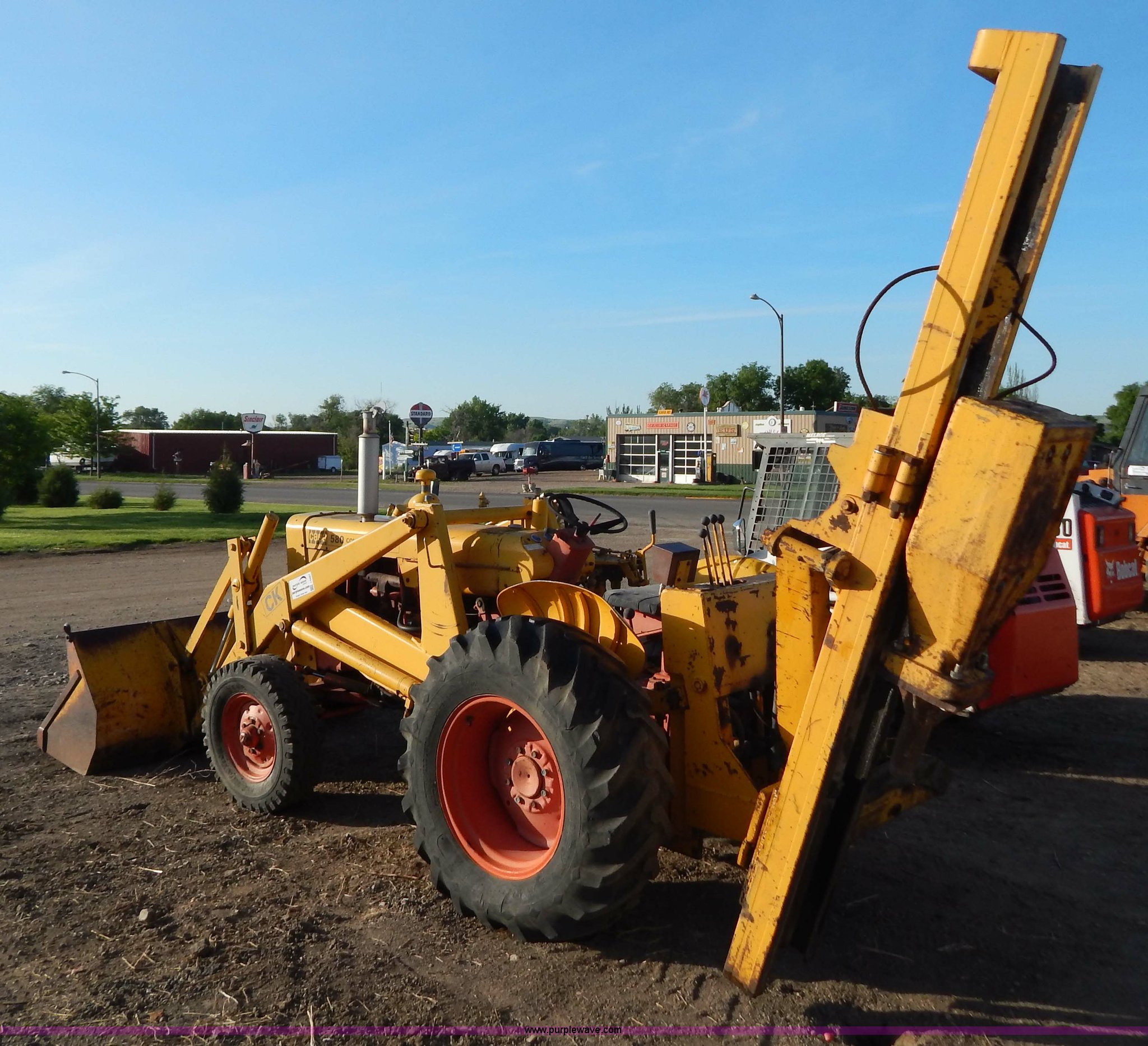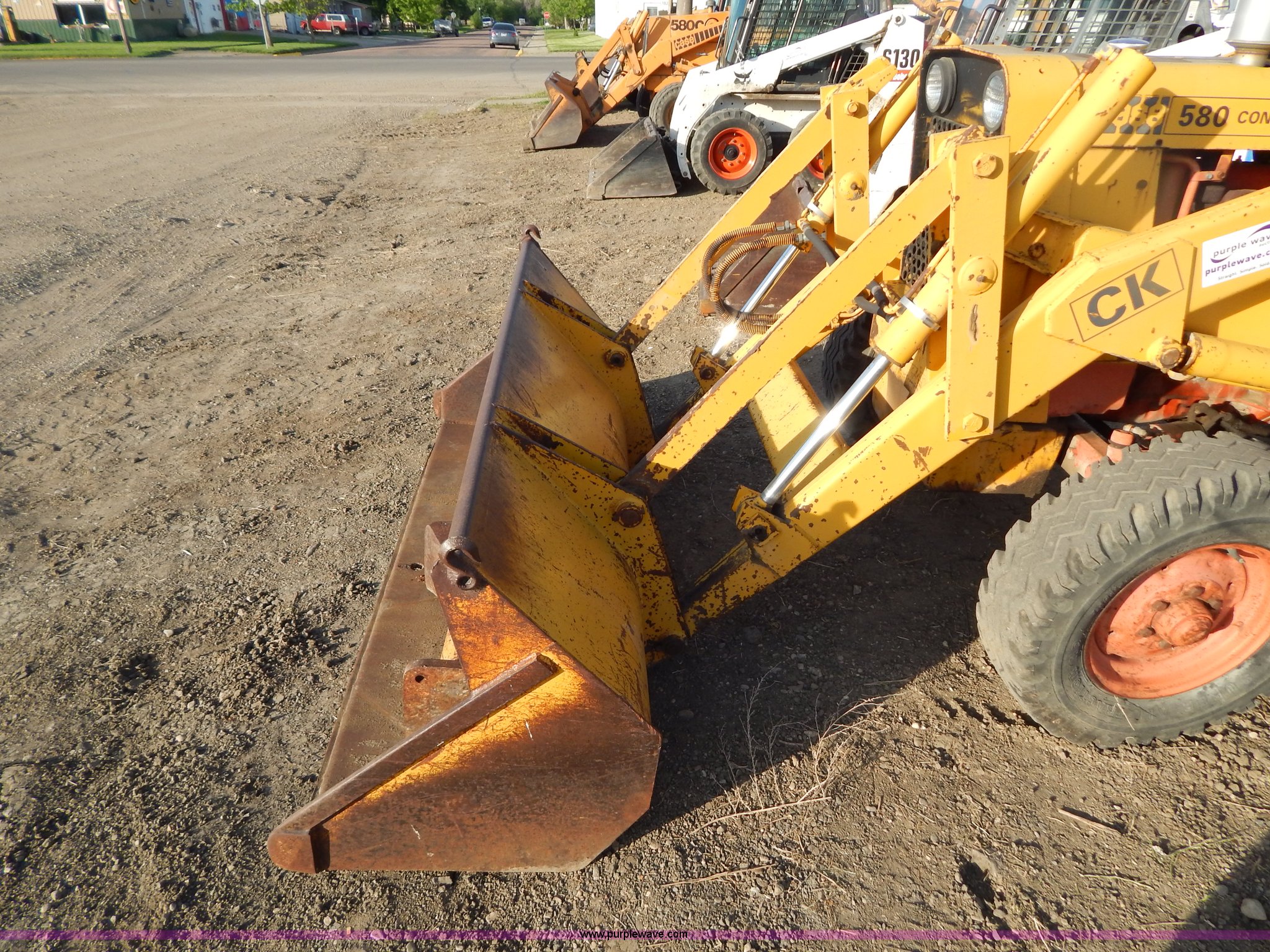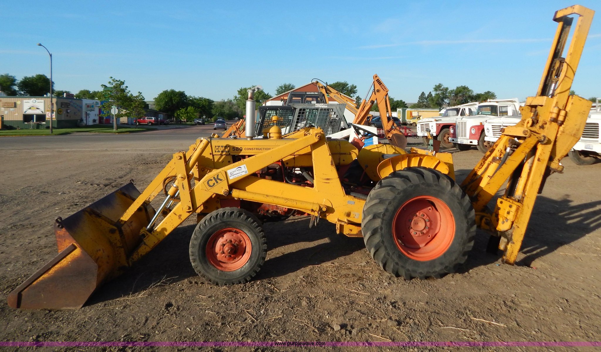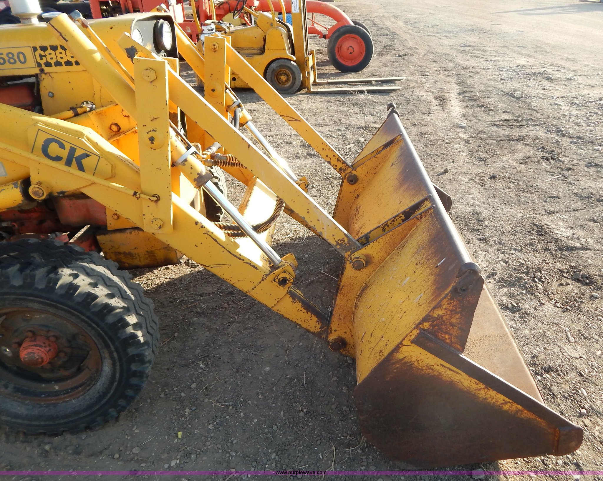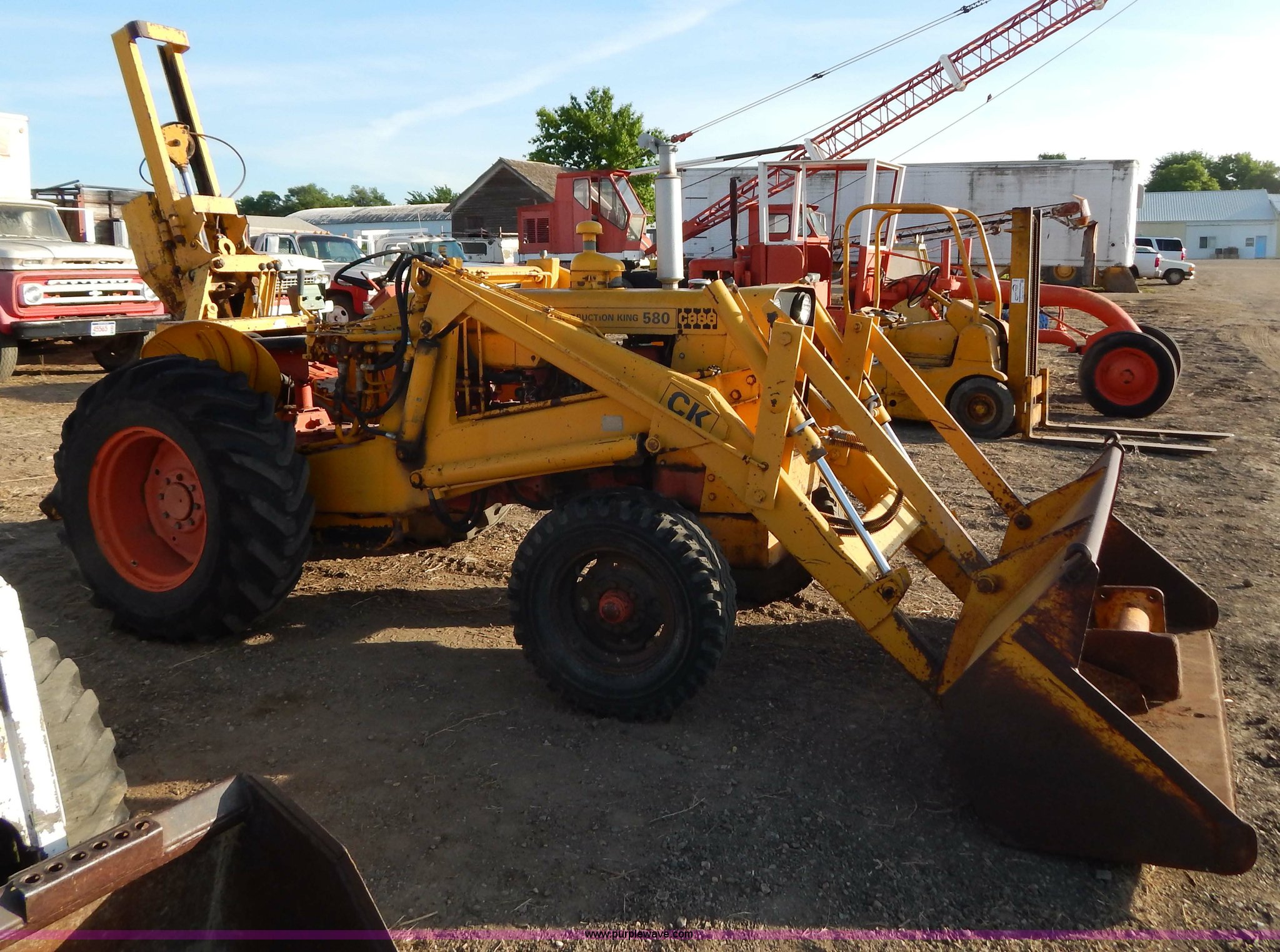 Purple Wave is selling a used Tractor in South Dakota. This item is a 1970 Case 580 Construction King tractor with the following: Four cylinder gas engine, Model G159B, 5F-1R gears, Hammer attachment, Serial 4155580, Auxiliary hydraulics, Lever controls, Height adjustment, Manual or automatic, (2) hammers, Construction King 33 loader, 78.5" x 32" x 30" smooth edge bucket, Serial 4199925, 7.50-16 front tires, 14.9-24 rear tires, 5,175 lbs. base operating weight, Battery dead, Hour meter inoperable, Serial 8659301