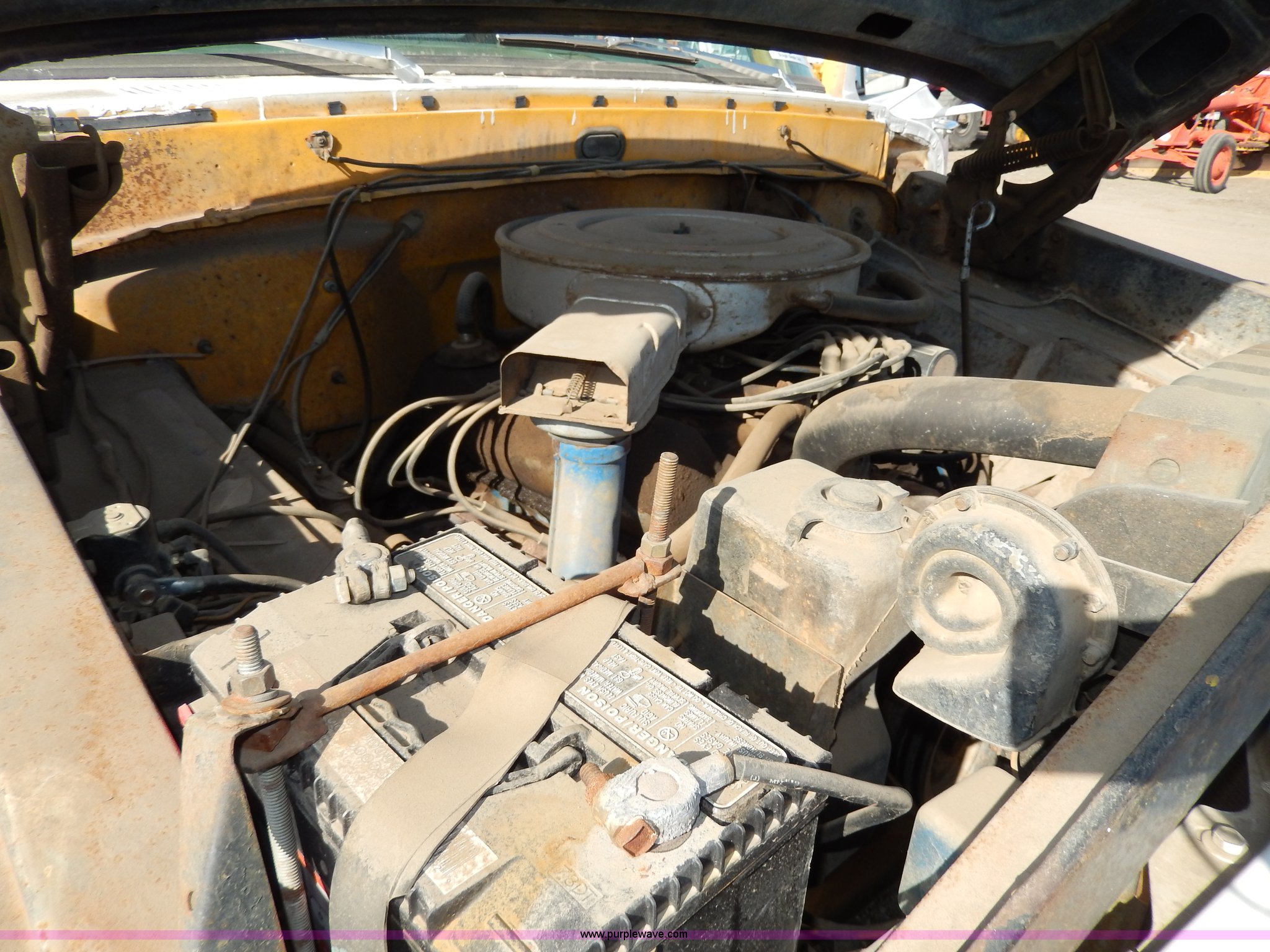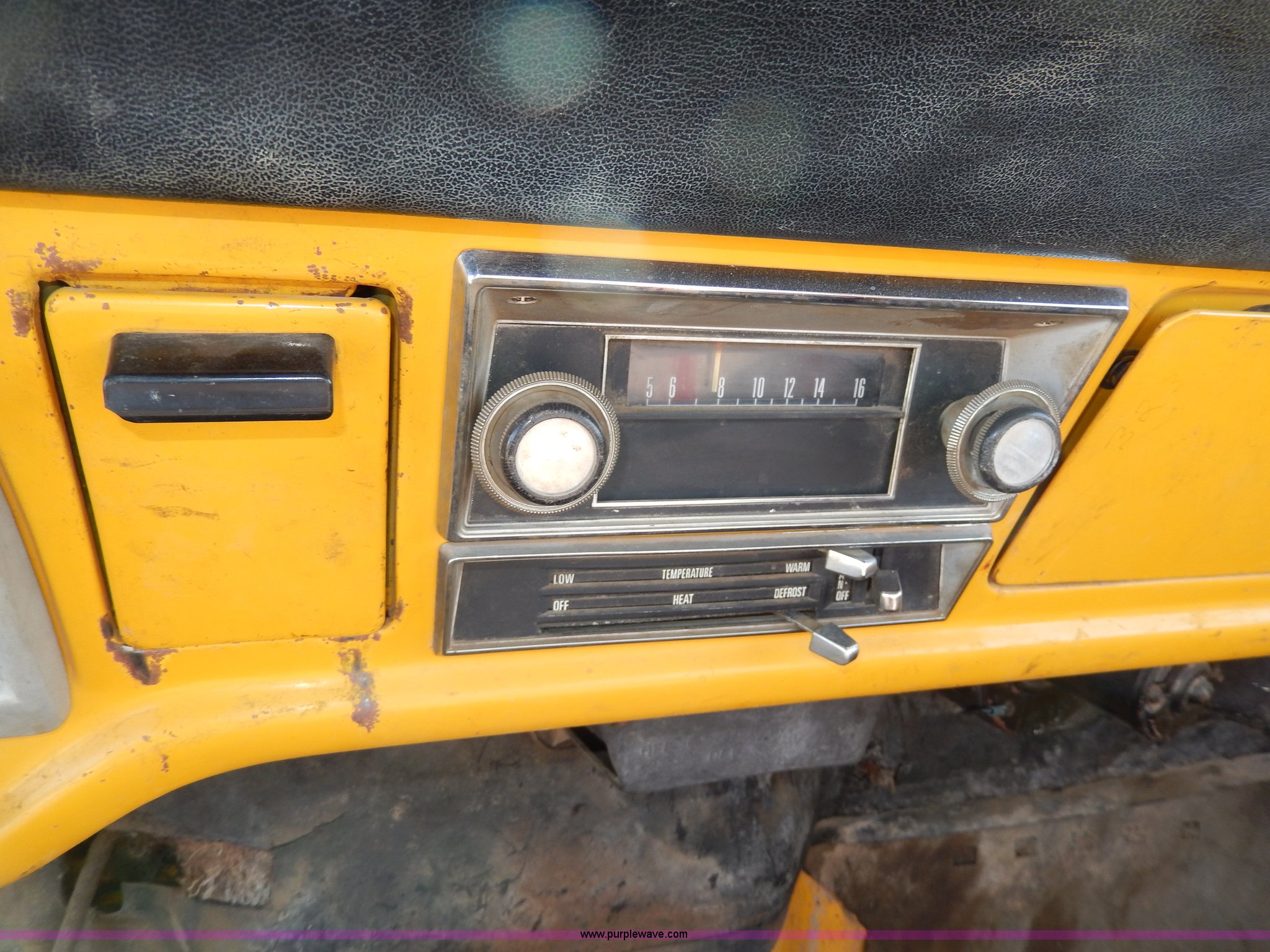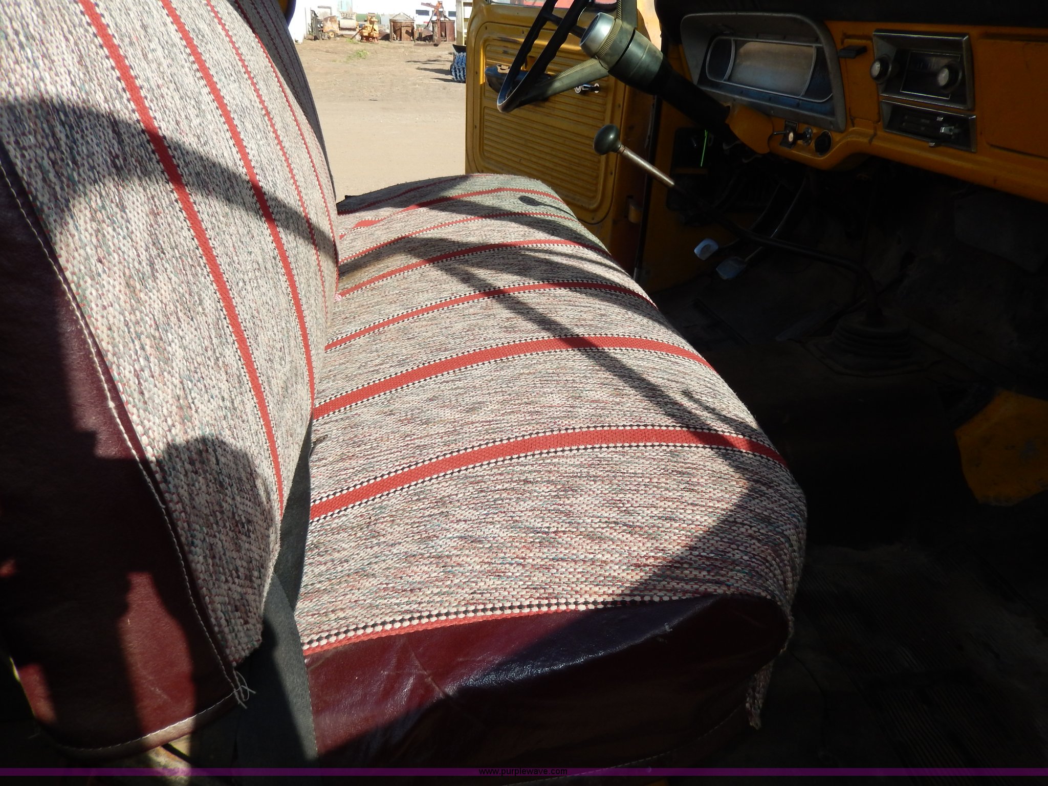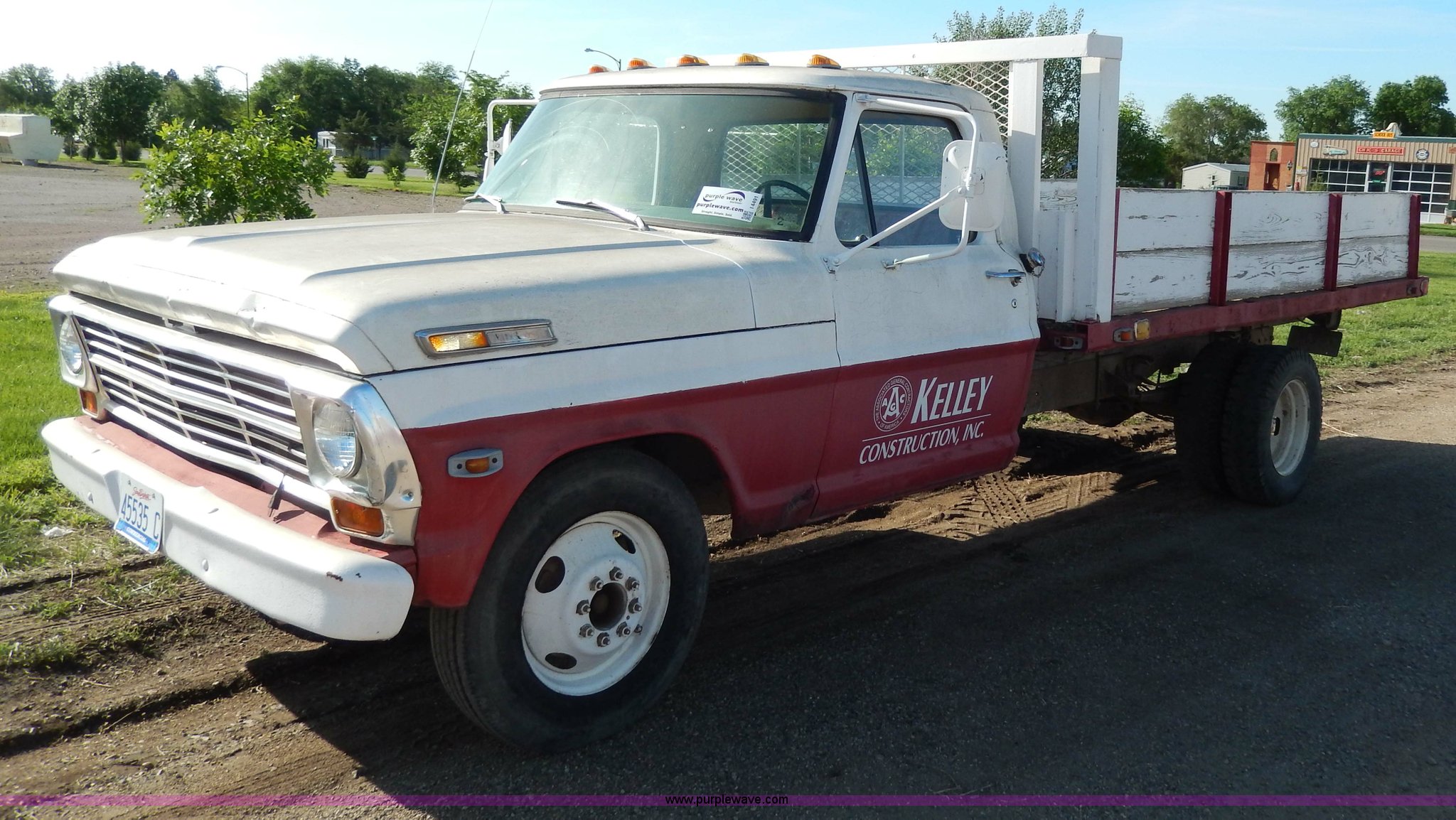 Purple Wave is selling a used Passenger Vehicle in South Dakota. This item is a 1969 Ford F350 pickup truck with the following: 82,459 miles on odometer, Eight cylinder gas engine, Four speed manual transmission, Heat, AM/FM, Manual windows and locks, 12' x 7' long bed, Ball hitch, 8R17.5 tires, Interior/exterior cosmetic damage, Paint chipped, Cracked windshield