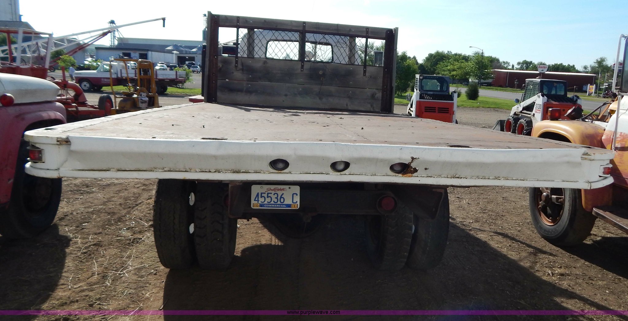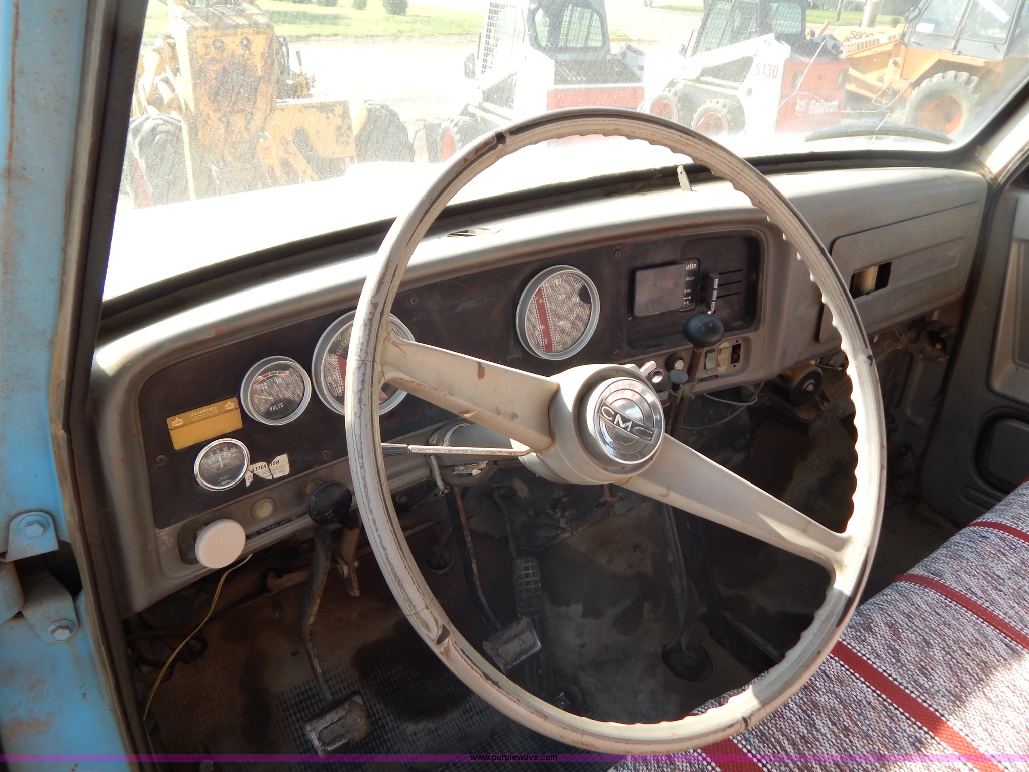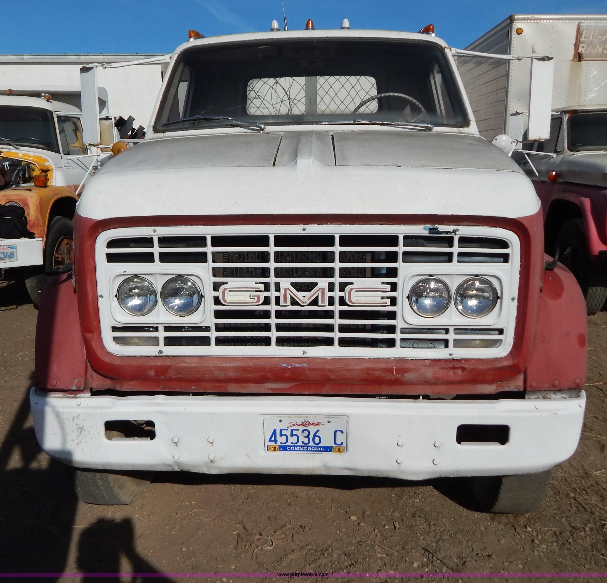 Purple Wave is selling a used Construction Dump Truck in South Dakota. This item is a 1967 GMC flatbed dump truck with the following: 50,706 miles on odometer, Six cylinder gas engine, Four speed manual transmission, Two speed rear end, Heat, 14' x 8' flatbed, 30 gallon fuel tank, PTO, 9.00-20 tires, GVWR 19,500 lbs, Interior/exterior cosmetic damage, Rust, Paint faded, Dead battery, Cracked windshield