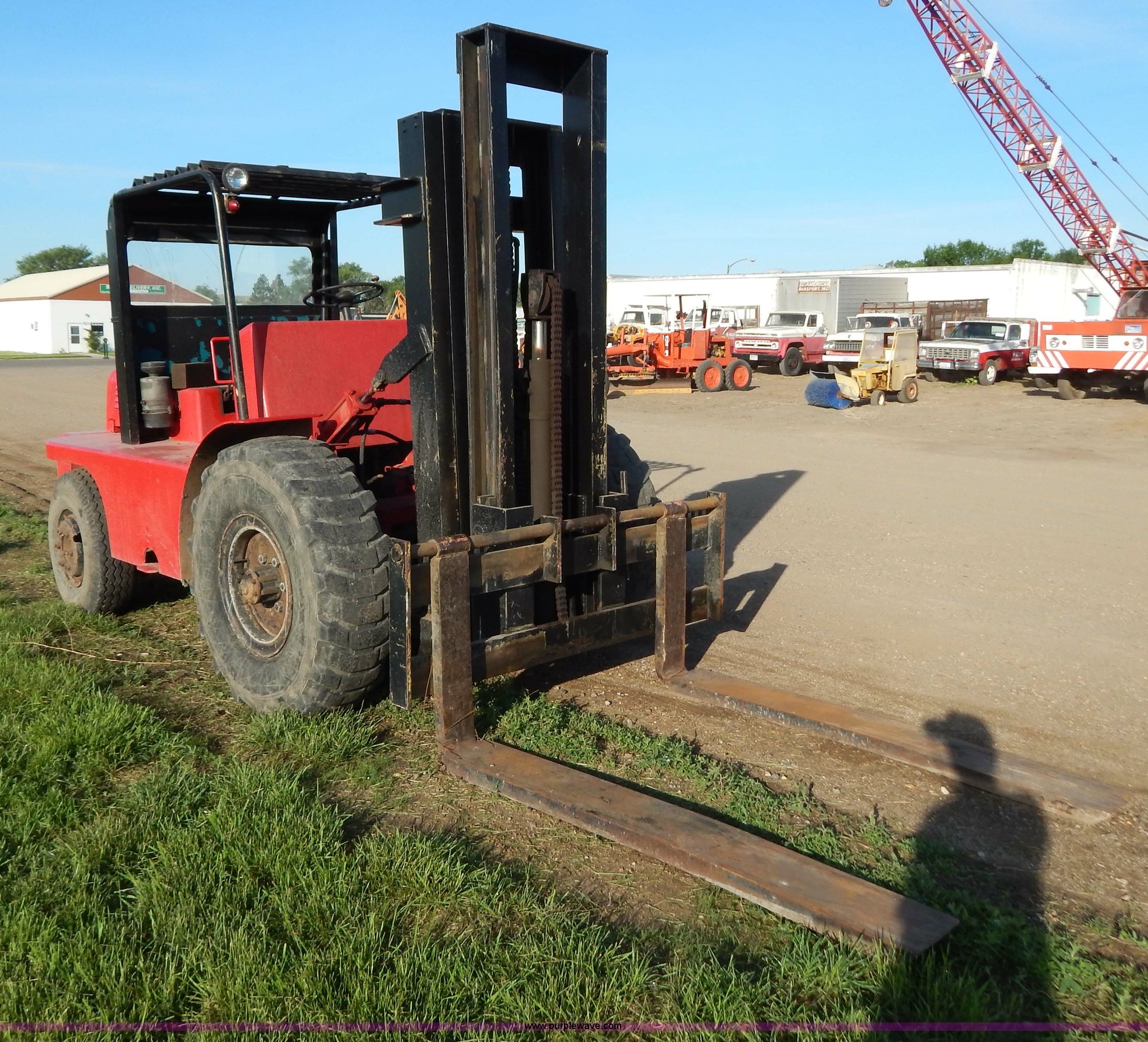 Rinson 4HLS forklift. 3,756 hours on meter, Continental six cylinder gas engine Type 5245, Serial F245-8139-267338, 4F-4R gears, Block heater, Mico Lever lock, 46" x 6" x 2" forks Manual width adjustment, 72" x 9" x 2.5" fork extensions, 8,000 lbs maximum lift capacity, 24' maximum lift height, 14R20 front tires, 10.00-15 rear tires, Rear windshield cracked, Serial 2070. Unit will be utilized during the removal process. Item will not be available for removal until August 1, 2013. View equipment video. Shipping quotes available. Kelley Construction. 1812 E Dakota Avenue. Pierre, SD 57501