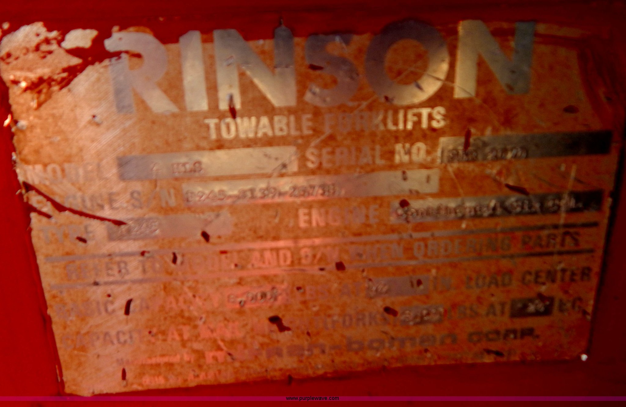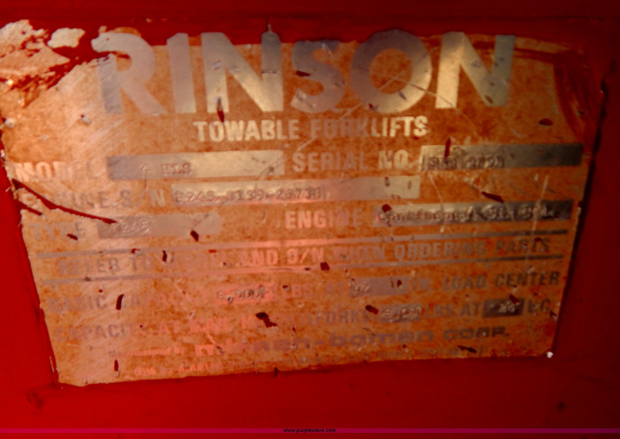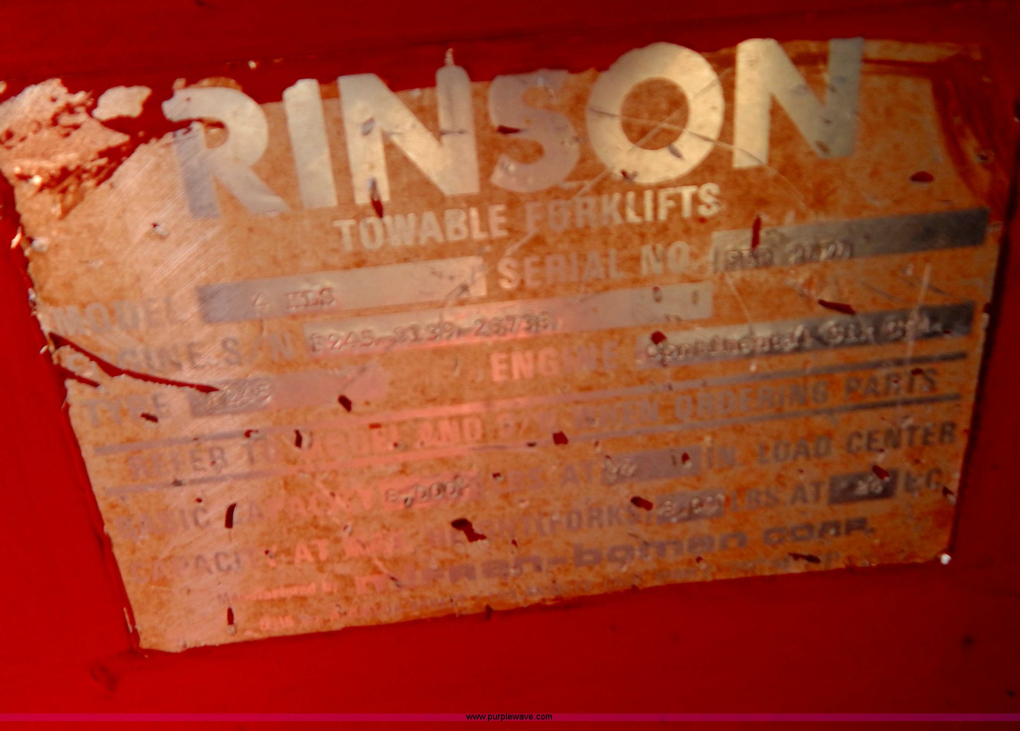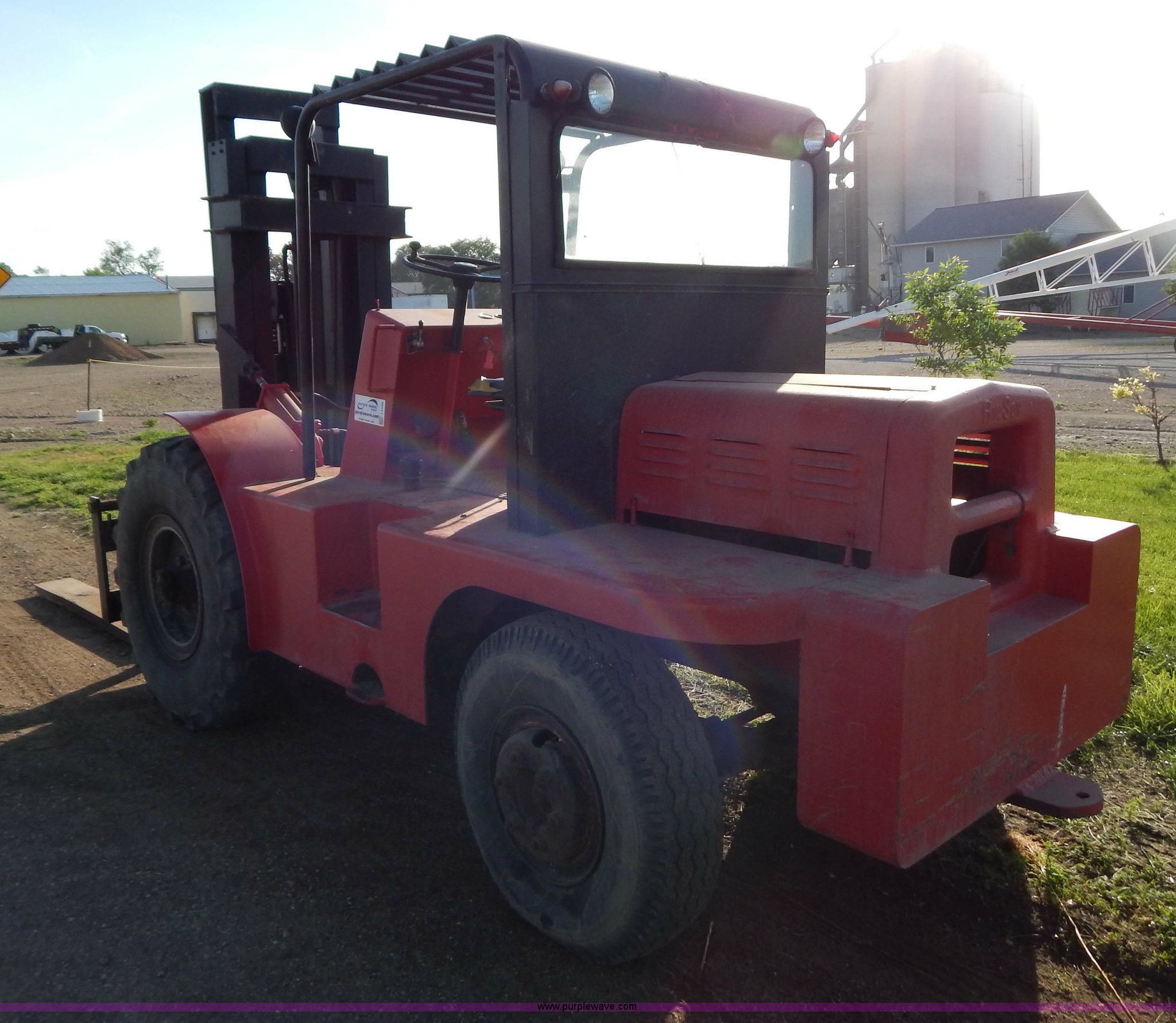 Purple Wave is selling a used Strt. Mast Rough Terr. Forklift in South Dakota. This item is a Rinson 4HLS forklift with the following: 3,756 hours on meter, Continental six cylinder gas engine, Type 5245, Serial F245-8139-267338, 4F-4R gears, Block heater, Mico Lever lock, 46" x 6" x 2" forks, Manual width adjustment, 72" x 9" x 2.5" fork extensions, 8,000 lbs maximum lift capacity, 24' maximum lift height, 14R20 front tires, 10.00-15 rear tires, Rear windshield cracked, Serial 2070