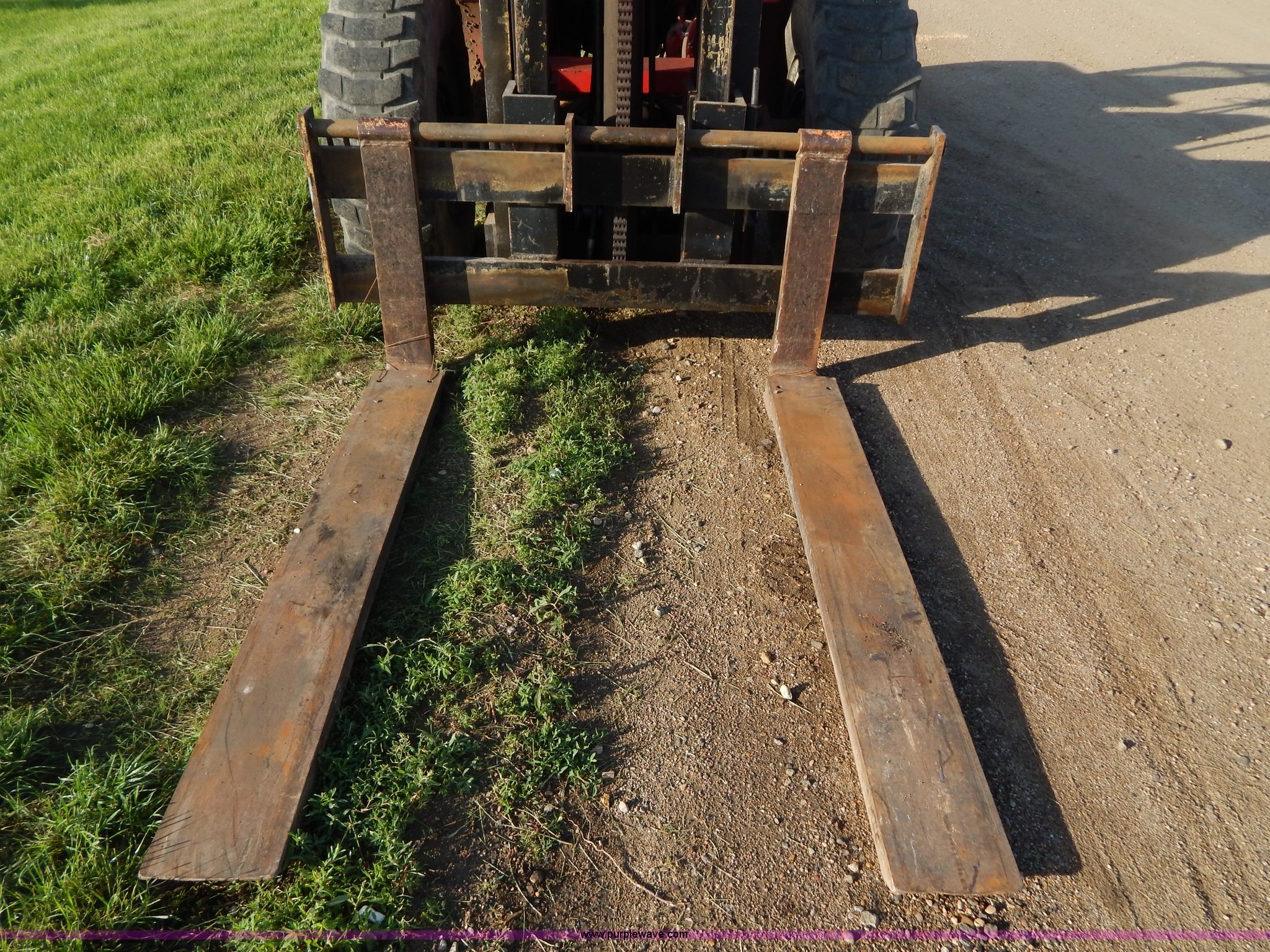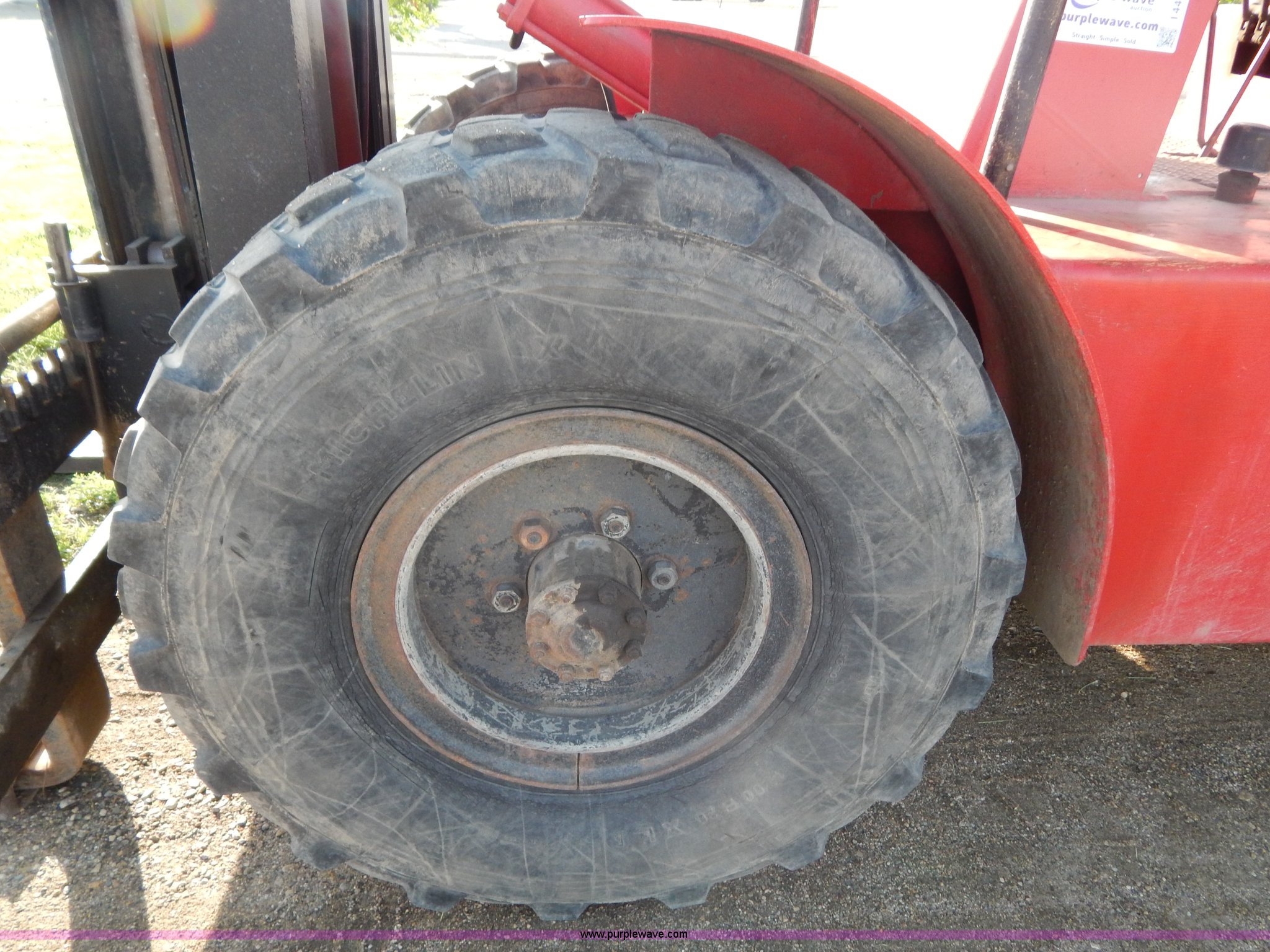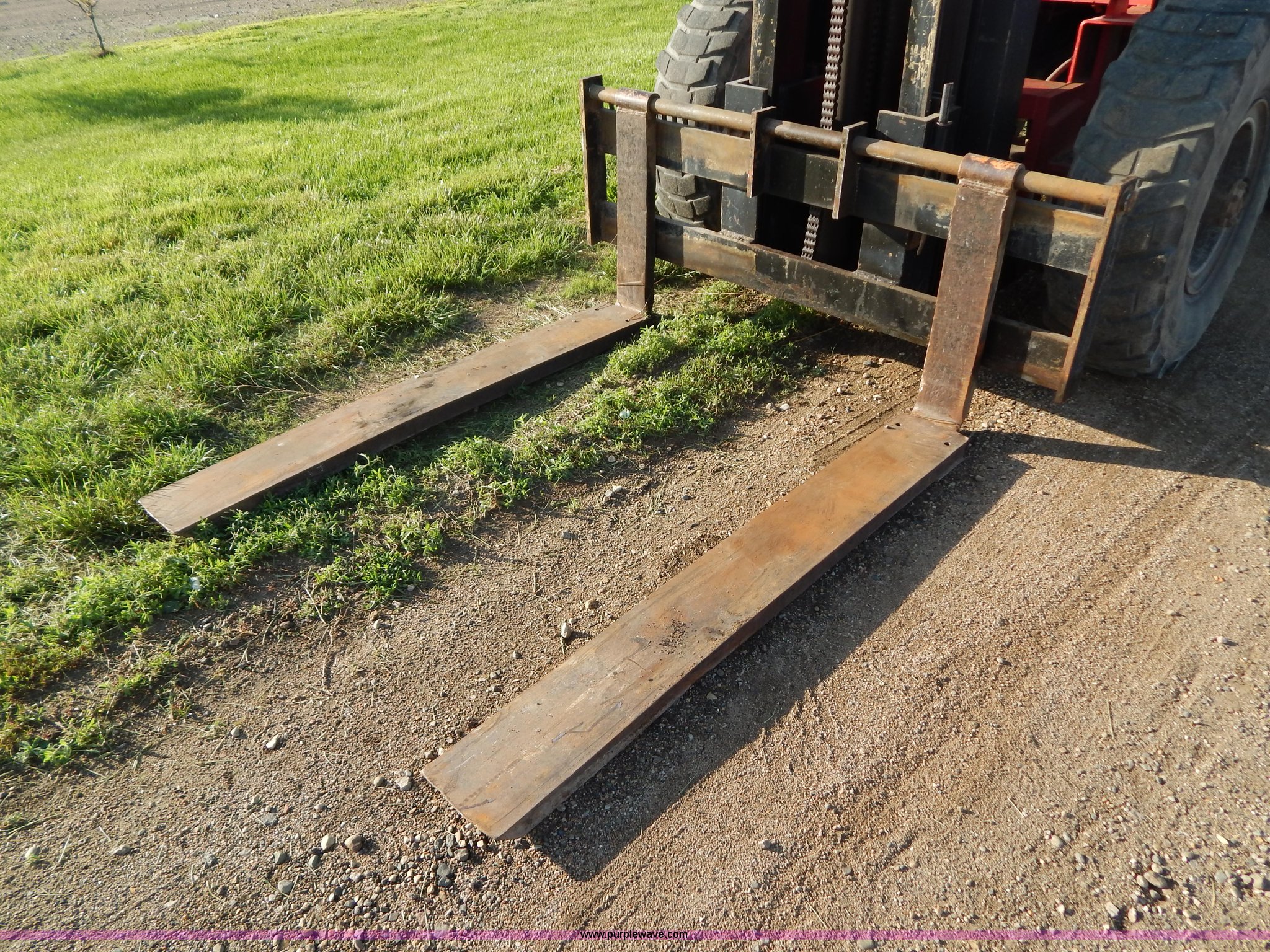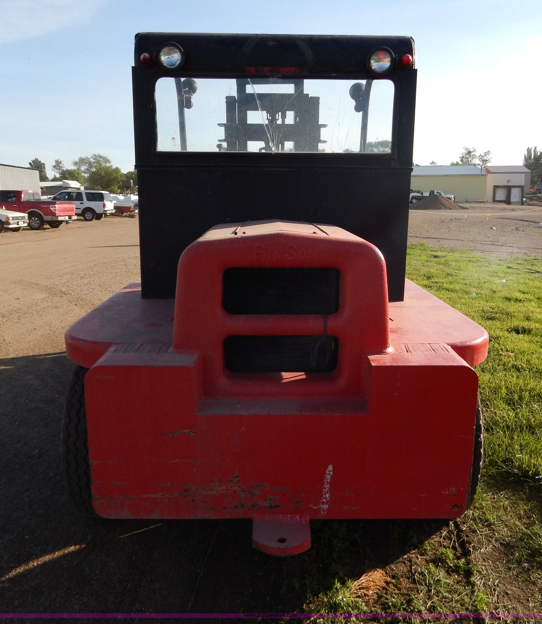 Purple Wave is selling a used Strt. Mast Rough Terr. Forklift in South Dakota. This item is a Rinson 4HLS forklift with the following: 3,756 hours on meter, Continental six cylinder gas engine, Type 5245, Serial F245-8139-267338, 4F-4R gears, Block heater, Mico Lever lock, 46" x 6" x 2" forks, Manual width adjustment, 72" x 9" x 2.5" fork extensions, 8,000 lbs maximum lift capacity, 24' maximum lift height, 14R20 front tires, 10.00-15 rear tires, Rear windshield cracked, Serial 2070