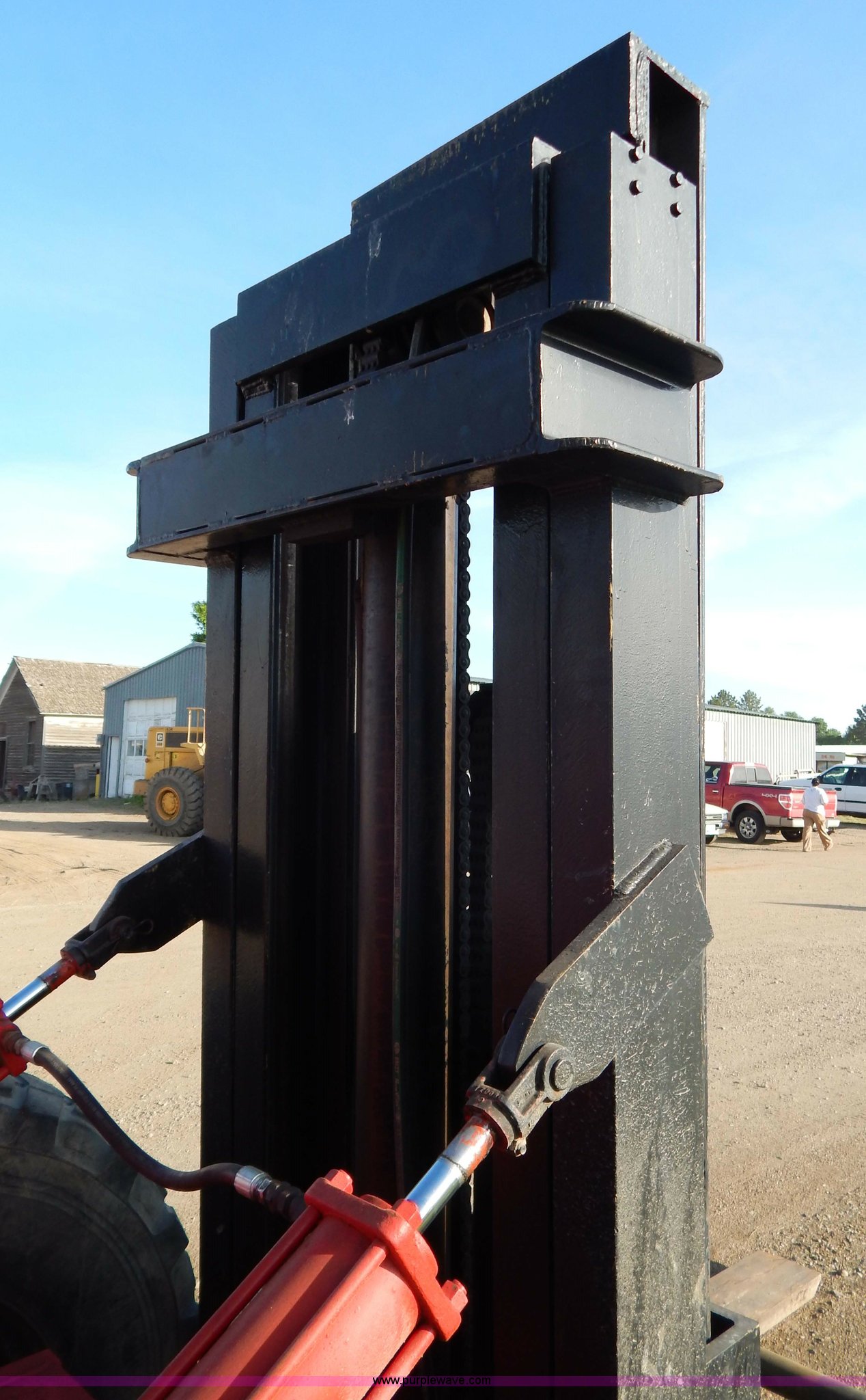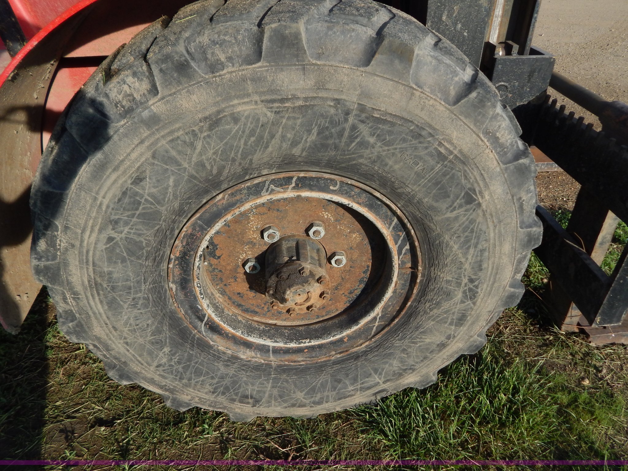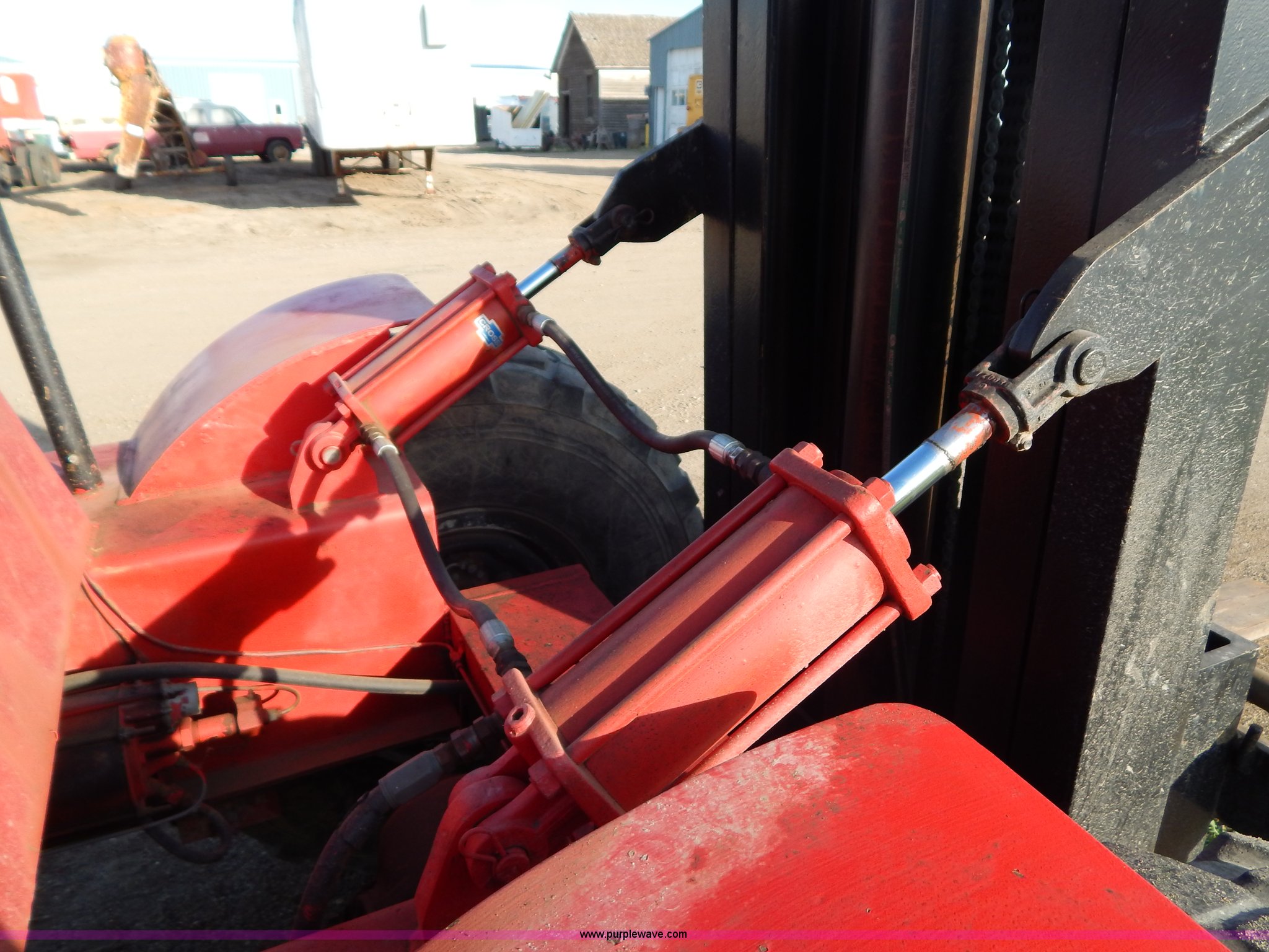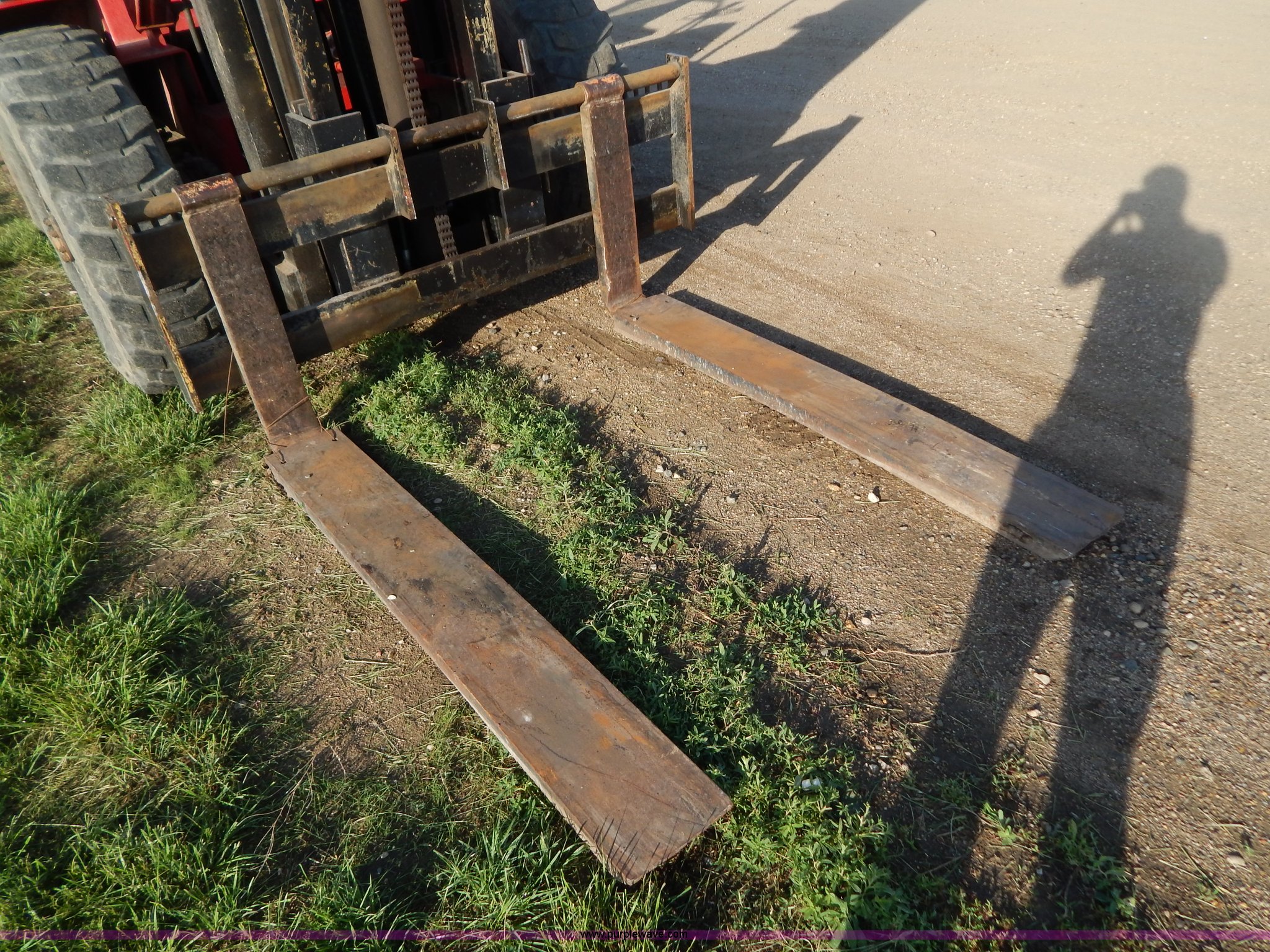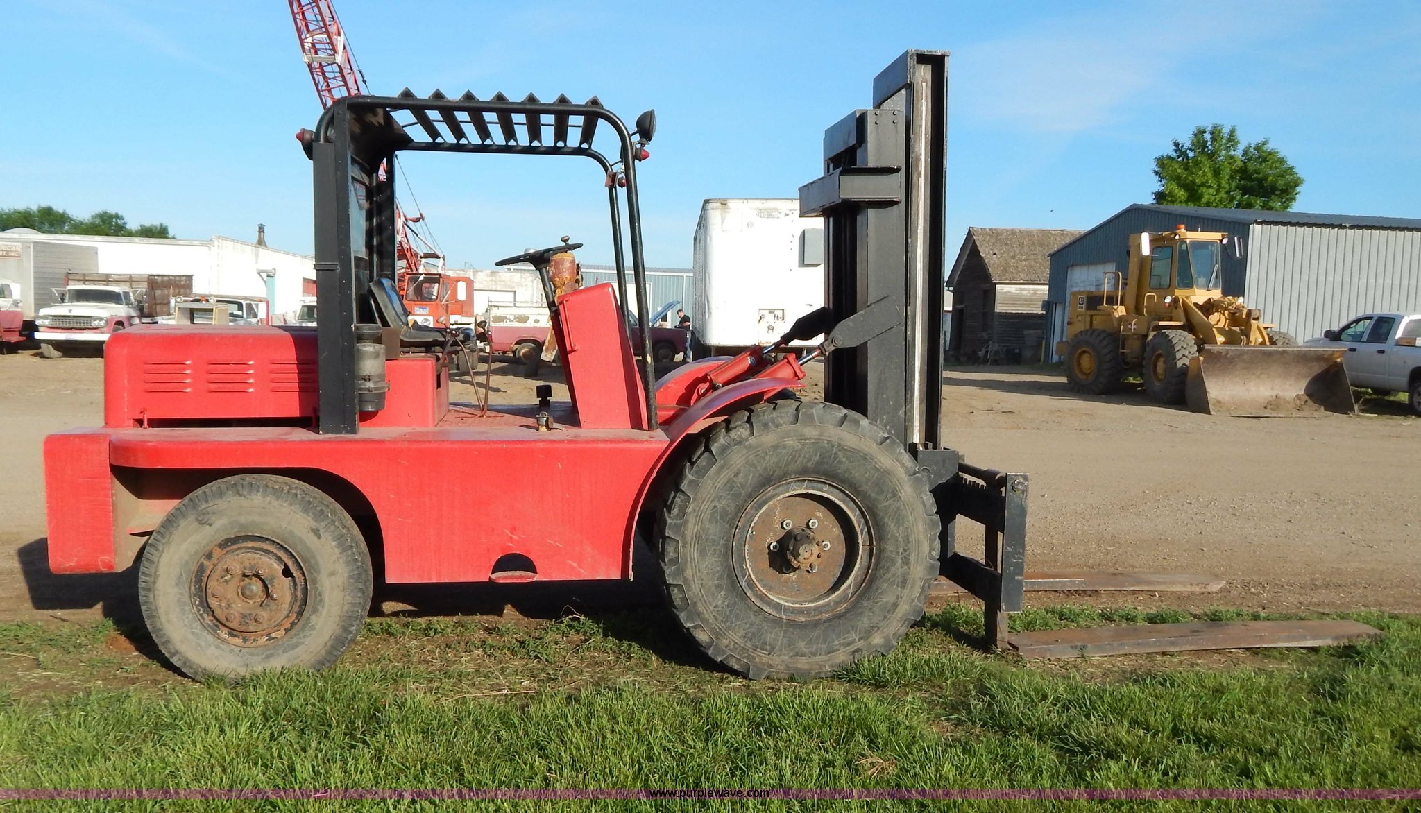 Purple Wave is selling a used Strt. Mast Rough Terr. Forklift in South Dakota. This item is a Rinson 4HLS forklift with the following: 3,756 hours on meter, Continental six cylinder gas engine, Type 5245, Serial F245-8139-267338, 4F-4R gears, Block heater, Mico Lever lock, 46" x 6" x 2" forks, Manual width adjustment, 72" x 9" x 2.5" fork extensions, 8,000 lbs maximum lift capacity, 24' maximum lift height, 14R20 front tires, 10.00-15 rear tires, Rear windshield cracked, Serial 2070