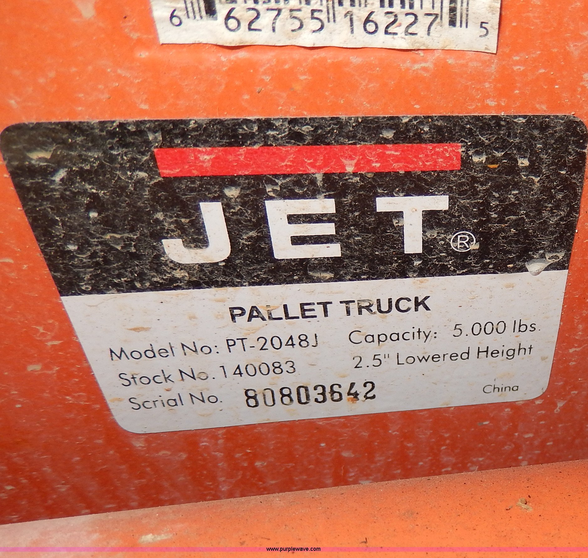 Purple Wave is selling a used Tools in Missouri. This item is a Jet pallet jack with the following: Model PT-2048J, 5,000 lbs capacity, Serial 80803642