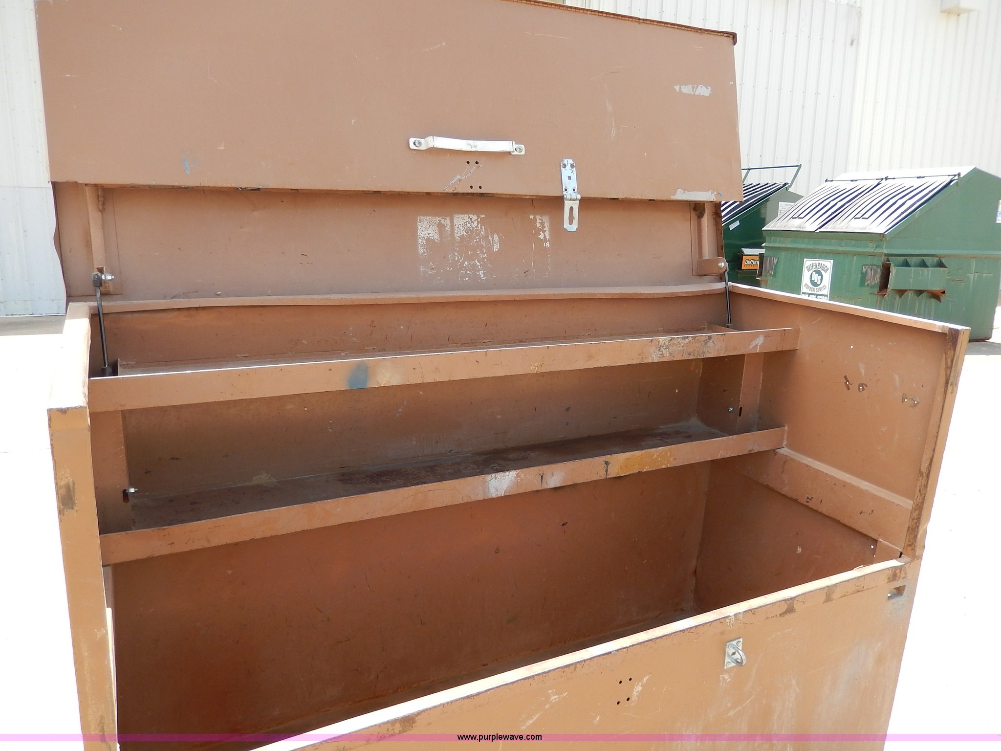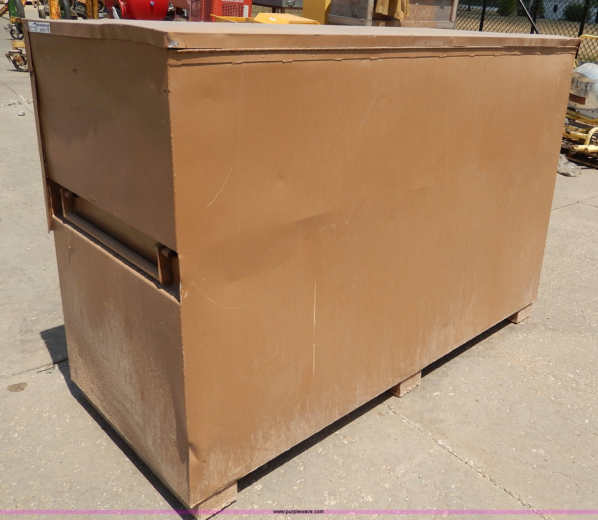 Purple Wave is selling a used Tools in Missouri. This item is a Job site box on skids with the following: 73" x 30" x 50"