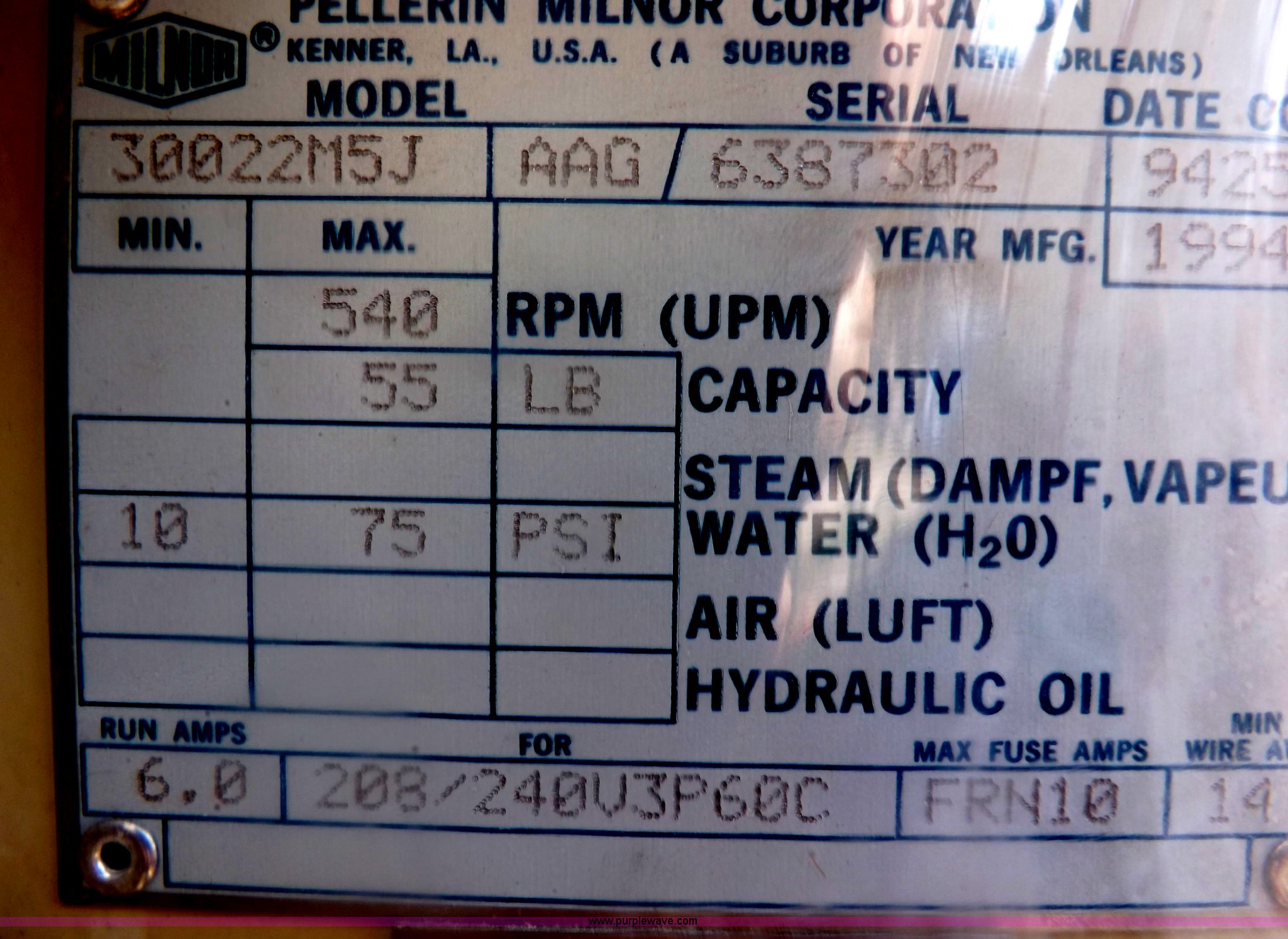 Purple Wave is selling a used Appliances in Kansas. This item is a 1994 Pellerin Milnor commercial washing machine with the following: Model 30022M5J, 208/240V, 55 lb capacity, 3/4" hot and cold water inlets, 1.5" suds overflow outlet, 3" drain, Manuals, Operational when removed from service, Serial 6387302