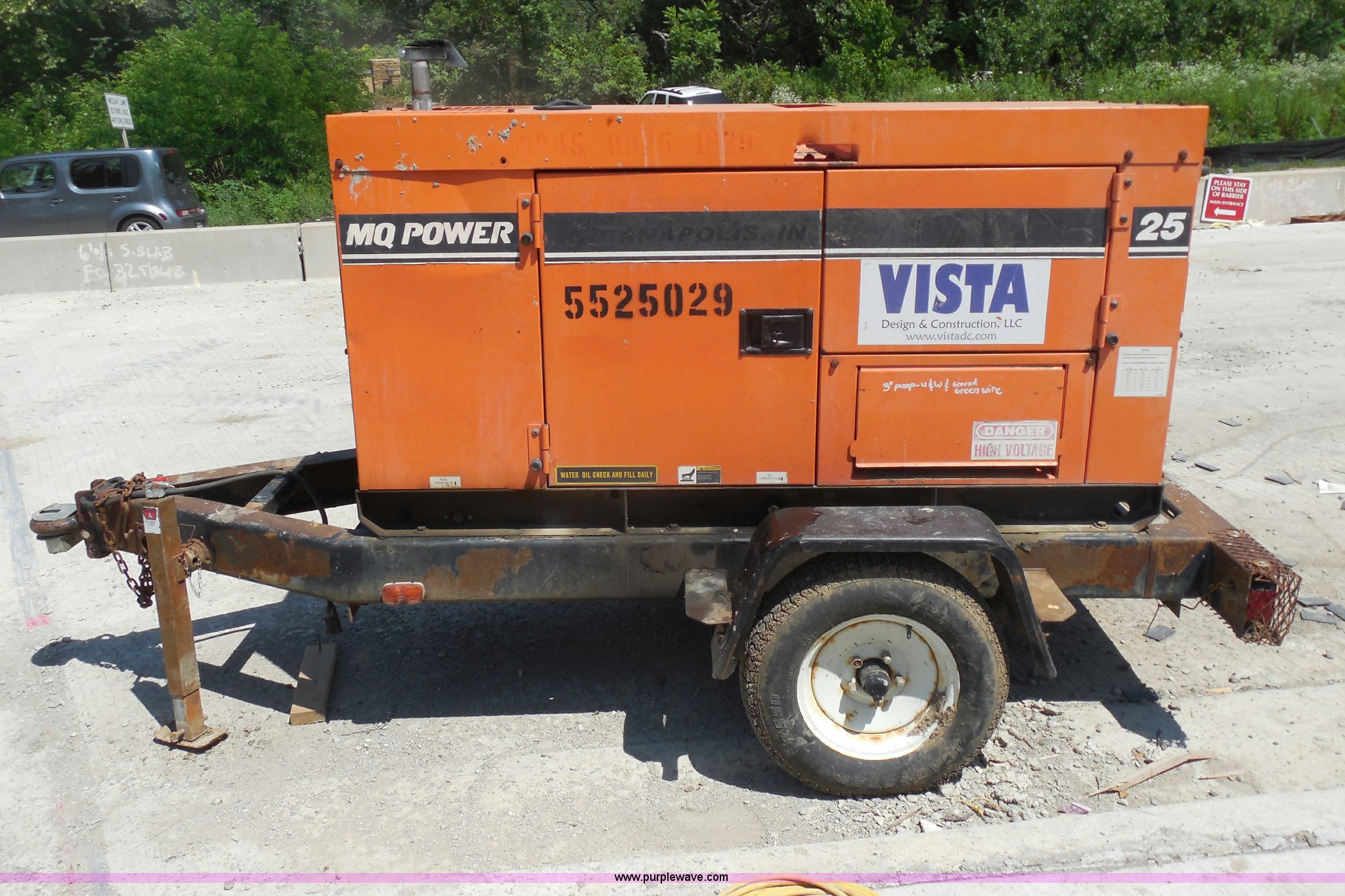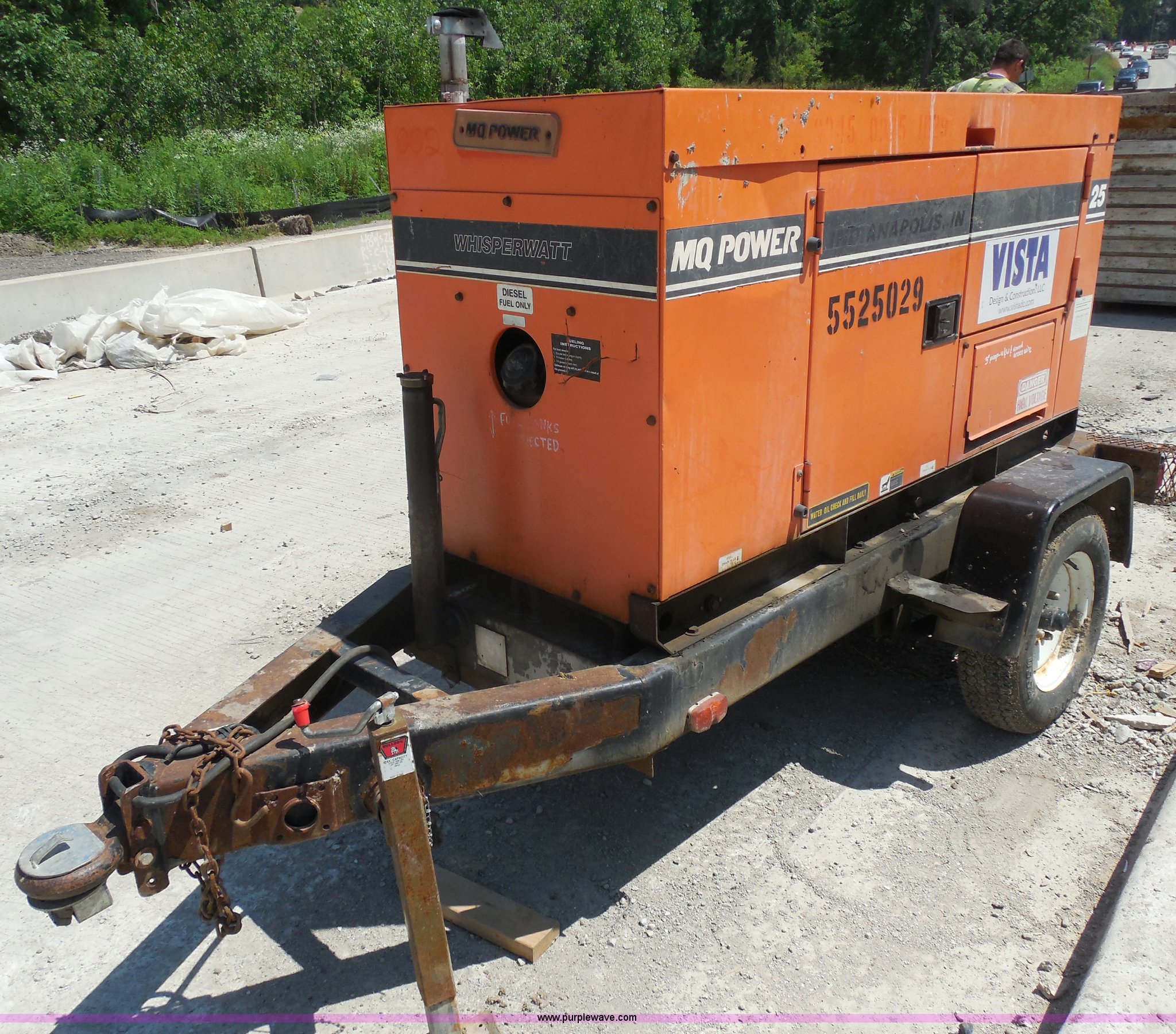 Whisperwatt 25 generator. 4,743 hours on meter, Isuzu four cylinder diesel engine, 120/480V, Oil pressure alarm, Water temperature alarm, Three phase, Pintle hitch, Trailer wiring, Jack stand, ST 175/80D13 tires. Shipping quotes available. Vista Design and Construction. 18025 West Lincoln Ave. New Berlin, WI 53146