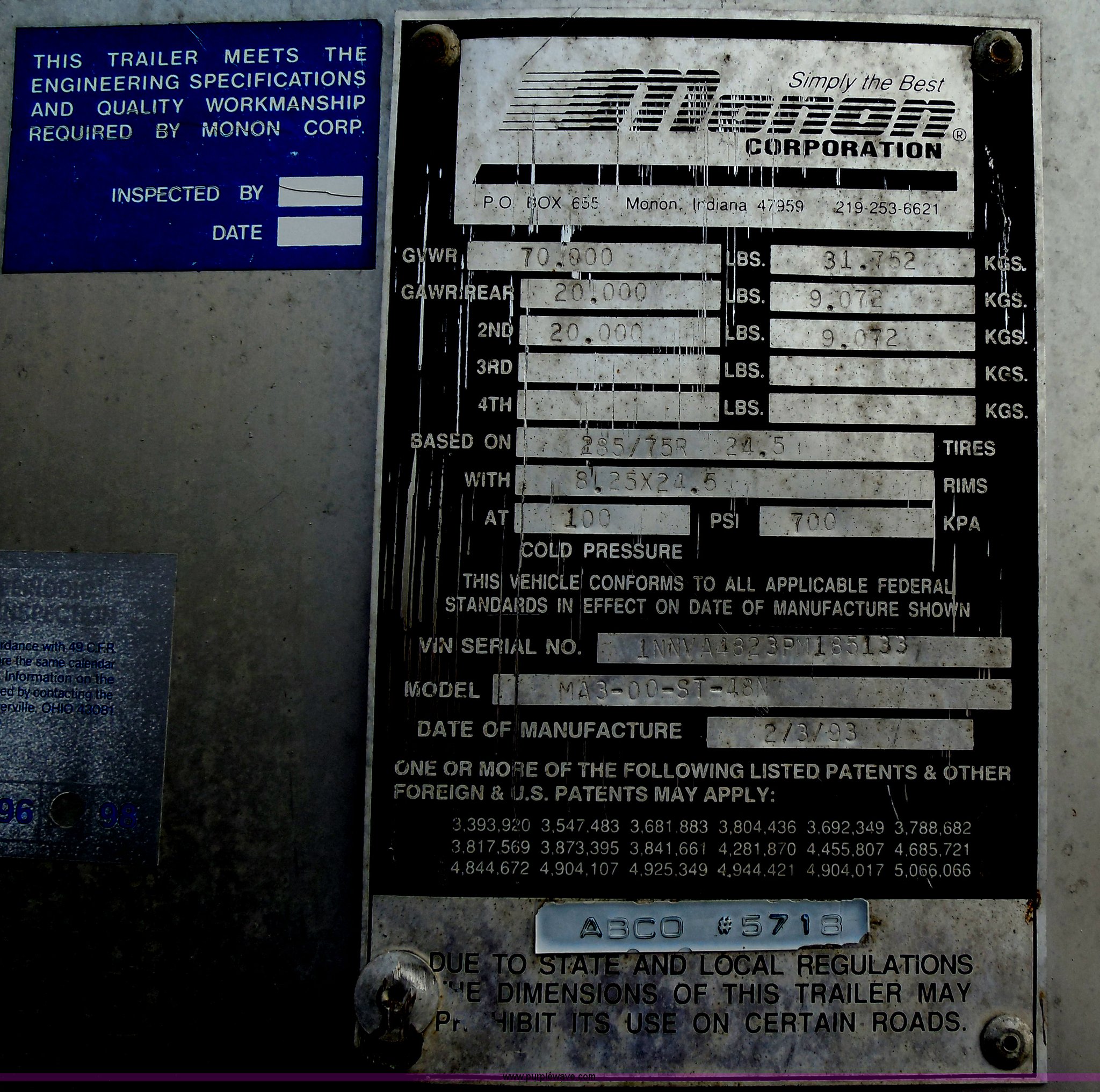 Purple Wave is selling a used Dry Van Trailer in Wisconsin. This item is a 1993 Monon dry van trailer with the following: Model MA3-00-ST-48, 48'L x 94"W x 9'H, Dual landing gear, Spring suspension, Air brakes, Spring suspension, Air brakes, 11R22.5 tires, GVWR 70,000 lbs, Contents are not included