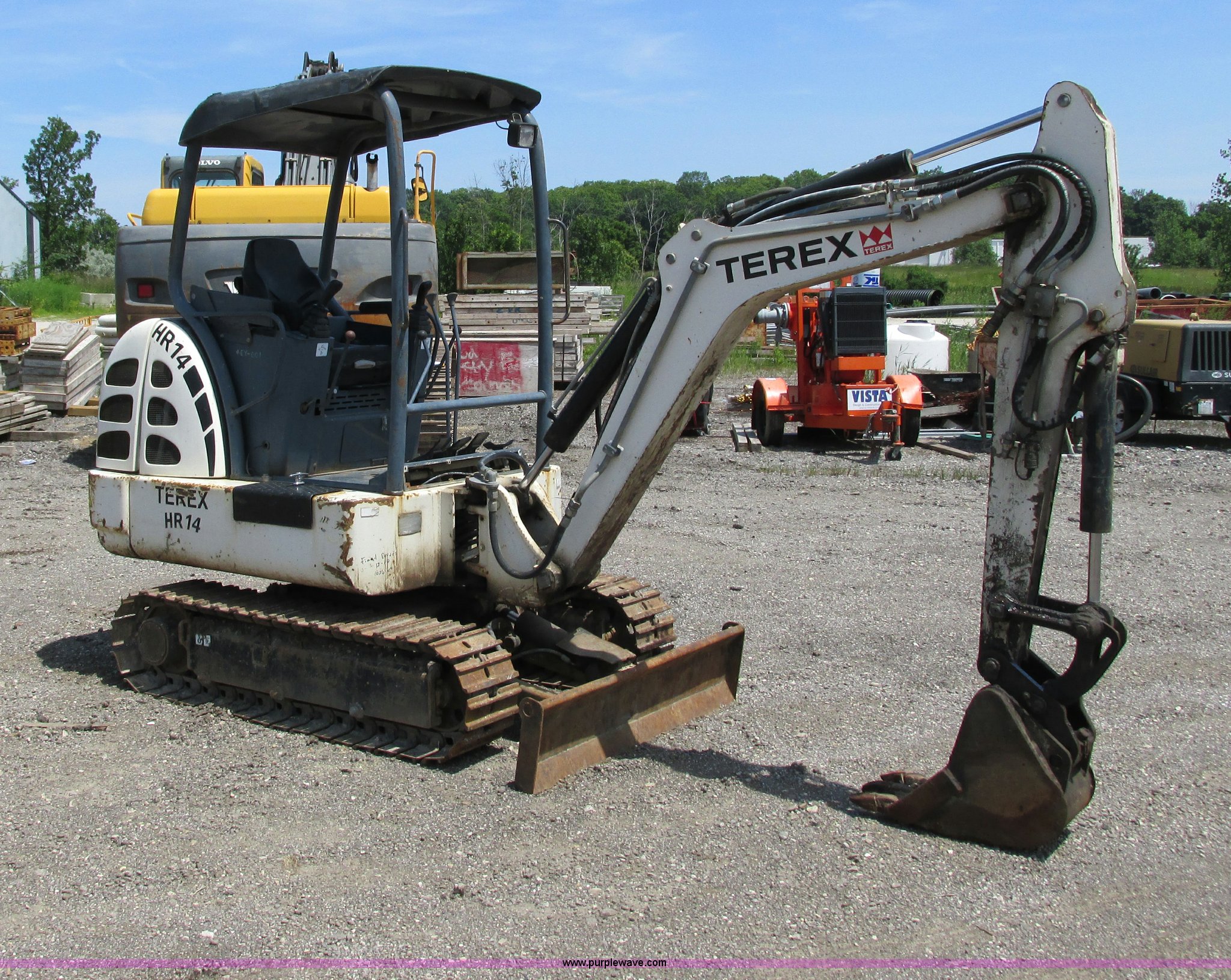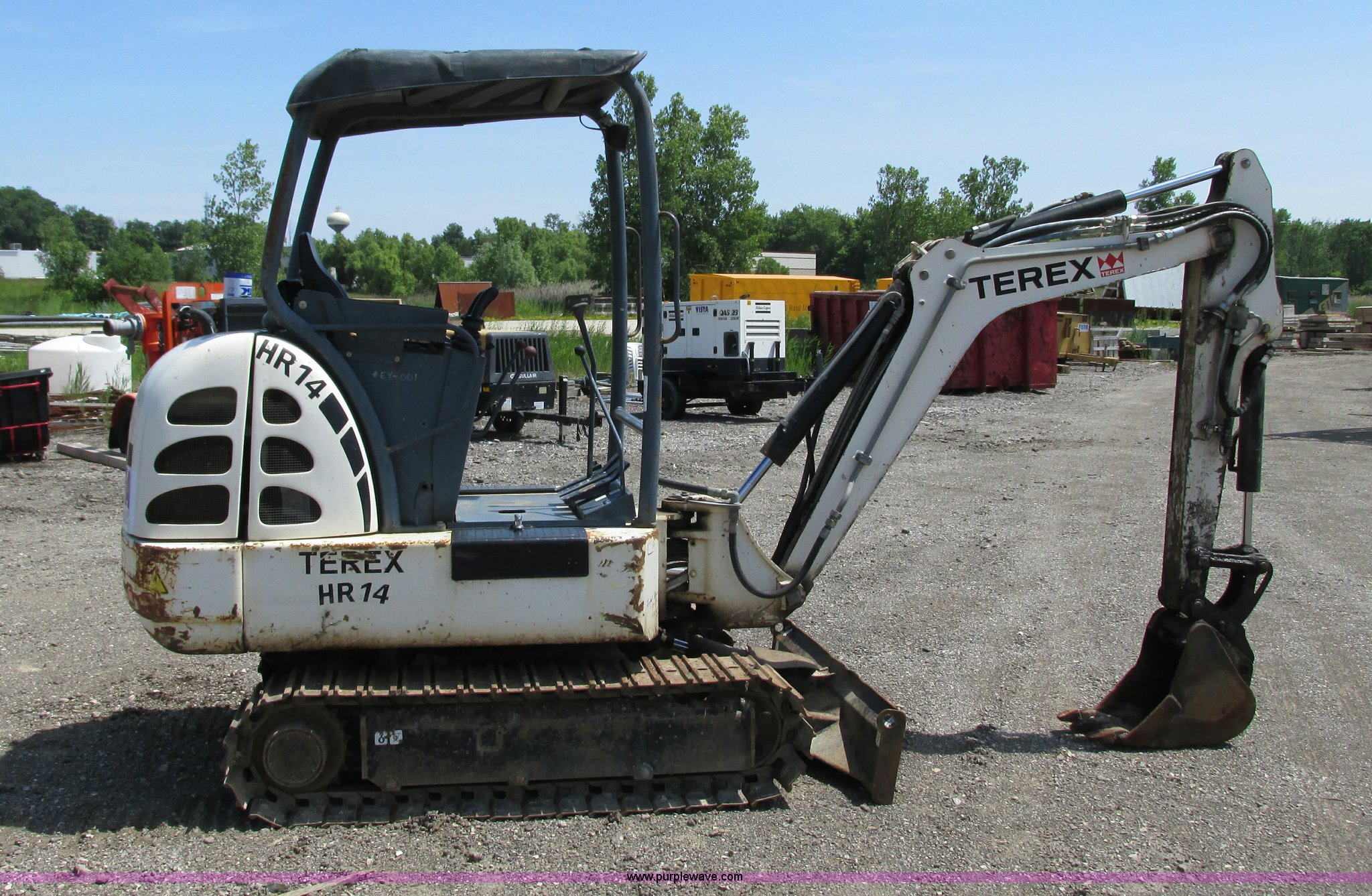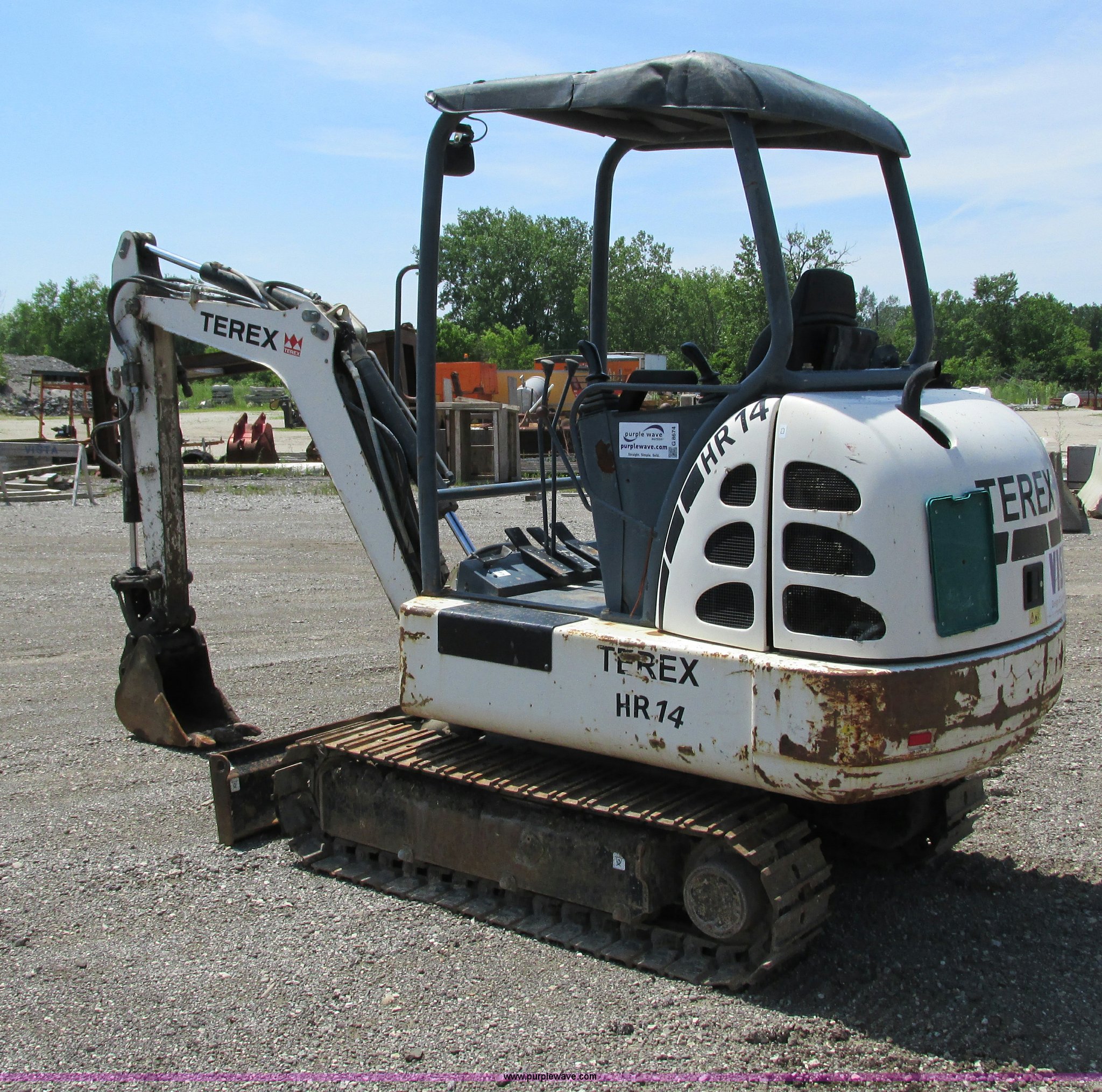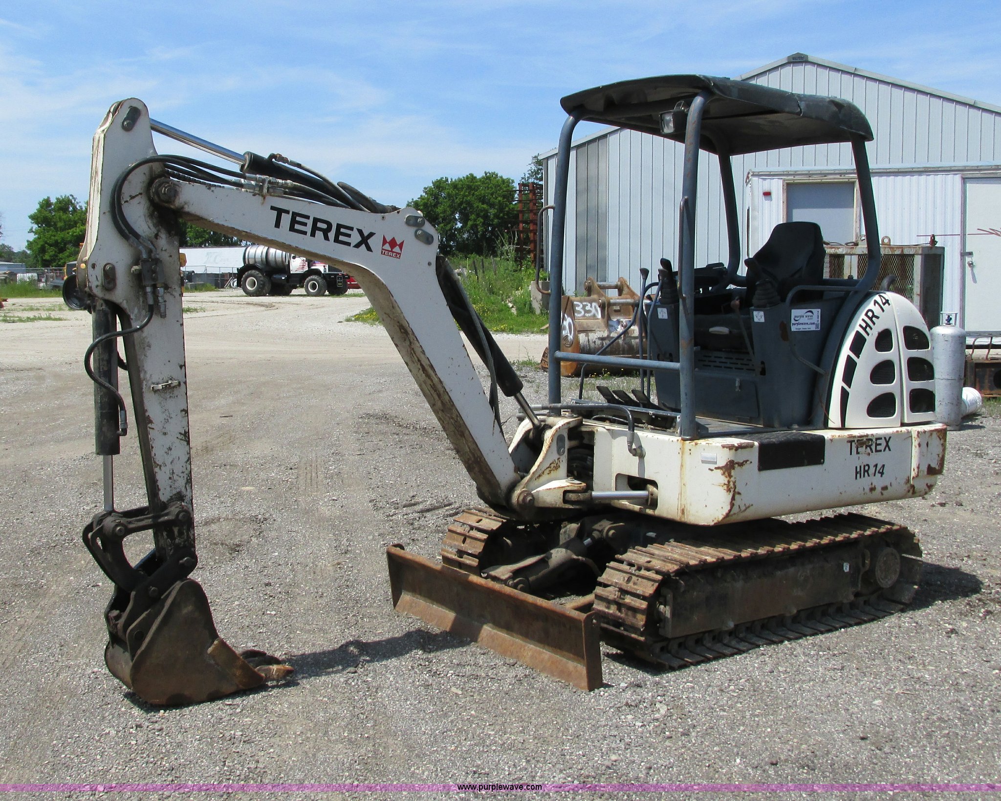 Purple Wave is selling a used Mini Excavator in Wisconsin. This item is a 2005 Terex HR14 mini excavator with the following: 1,262 hours on meter, Four cylinder diesel engine, OROPS, Auxiliary hydraulics, Boom side swing, 12"W bucket, (3) teeth, 54" stick, 55.5"W front dozer blade, 12"W steel tracks