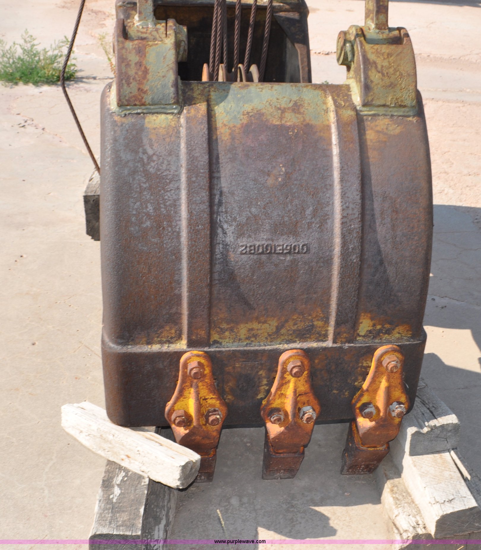 PMCO clam sheel bucket. Three teeth per side One missing, 3/4 cu. yd. capacity, Cable operated, 32"W, Opens to 77", 280013900 stamped on buckets. Shipping quotes available. Rock Express, Inc.. 1100 W 3rd St. Alliance , NE 69301