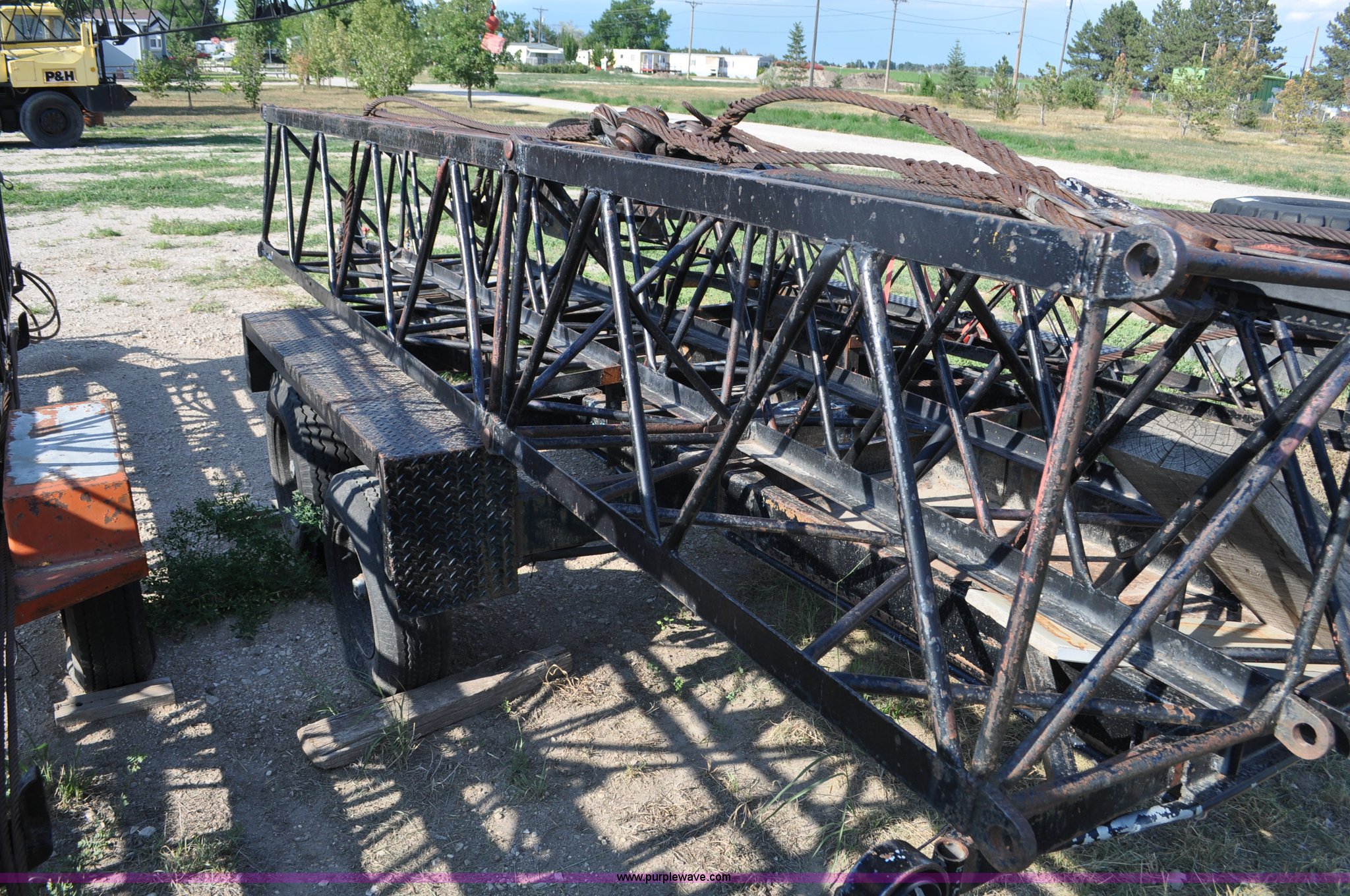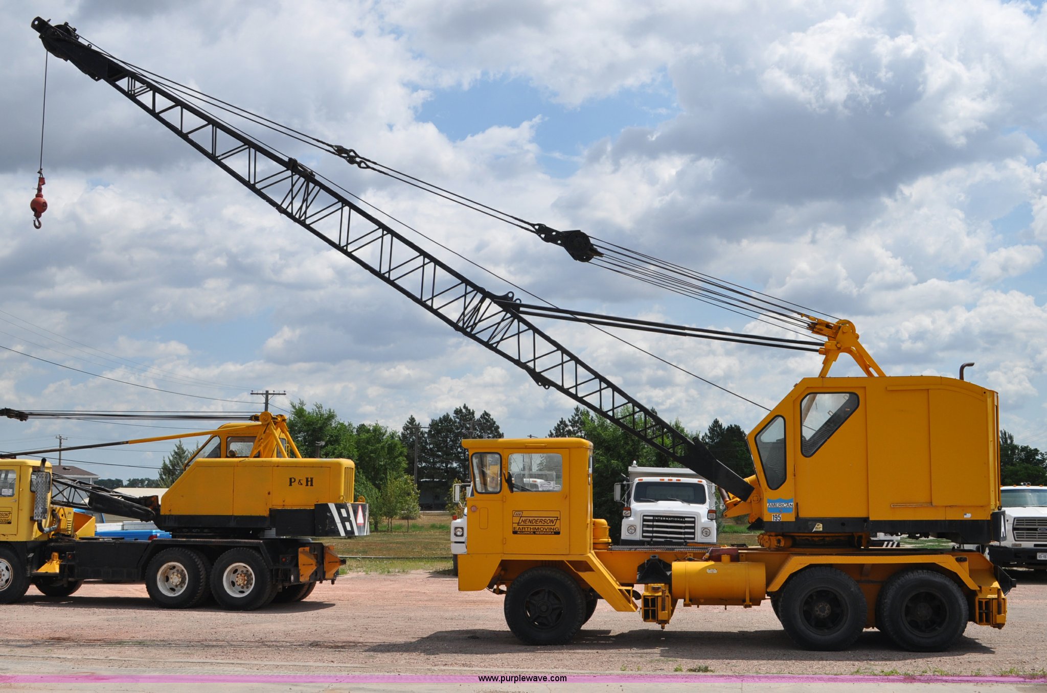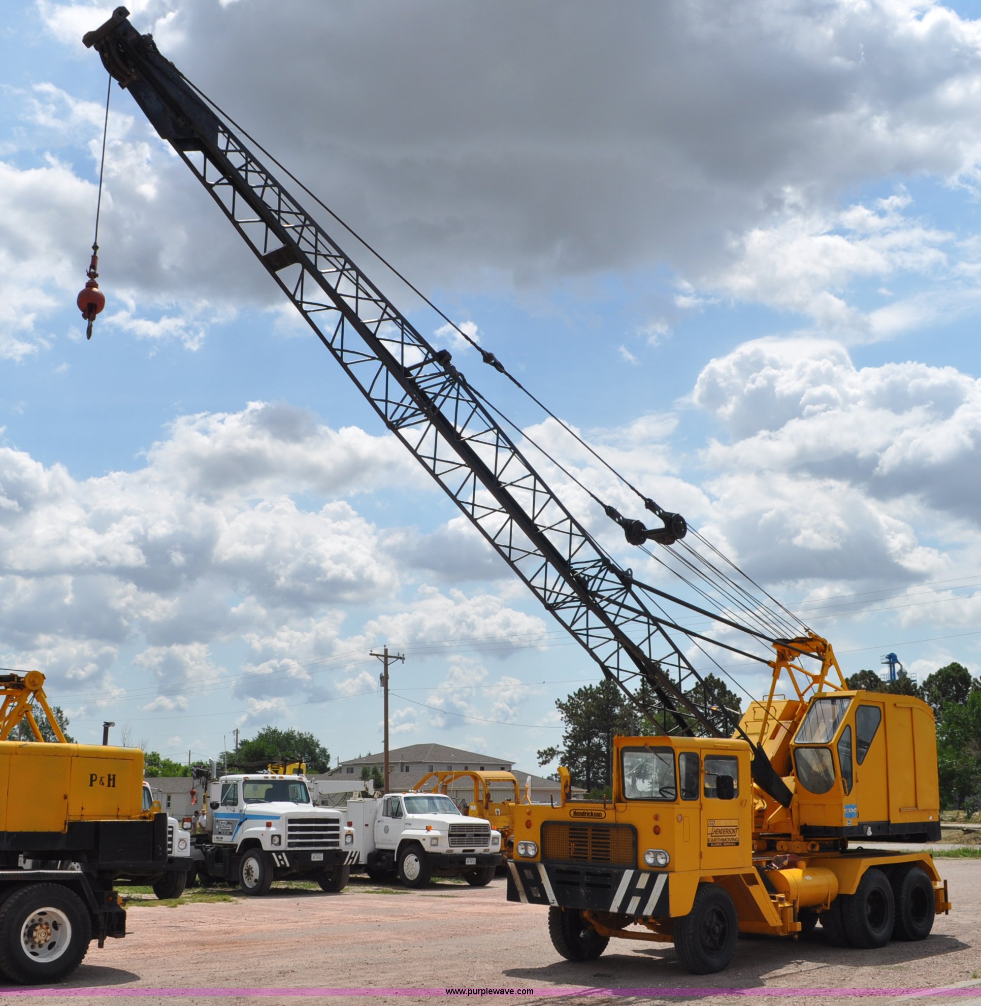 Purple Wave is selling a used Truck Crane in Nebraska. This item is a 1959 Hendrickson truck with crane with the following: International 406 Red Diamond six cylinder gas engine, Five speed transmission, Twin screw, Power divider, Waukesha gas crane engine, Inoperable, American 195 crane, 40' boom, 35' extensions, 15' jib, Carrier trailer, Manual outriggers, Hendrickson suspension, 10.00x20 tires, Truck gas tank has water in it