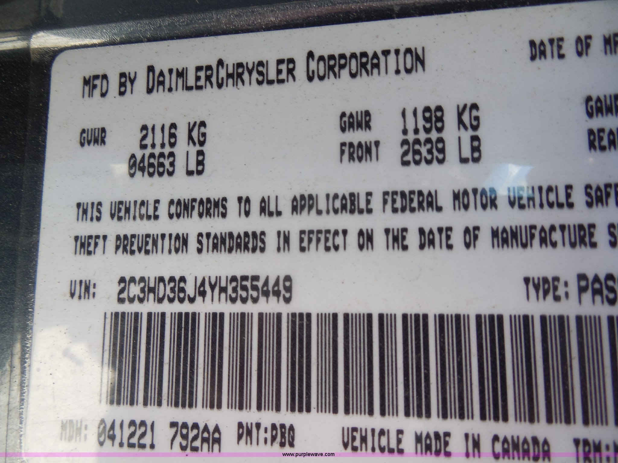 2000 Chrysler Concorde. Unknown miles on odometer, 3.2L V6 SOHC 24V gas engine, Automatic transmission, AM/FM/CD, Leather interior, Sunroof, Keys, P225/60R15 tires, Case# 13C030007. Vehicle is abandoned. No additional information is available. Vehicle does not have keys unless notated otherwise in the item listing.. View City Of Wichita Terms for title acquisition and item removal requirements.. 2C3HD36J4YH355449. Shipping quotes available. Bud Roat Towing. 310 N Handley. Wichita, KS 67203