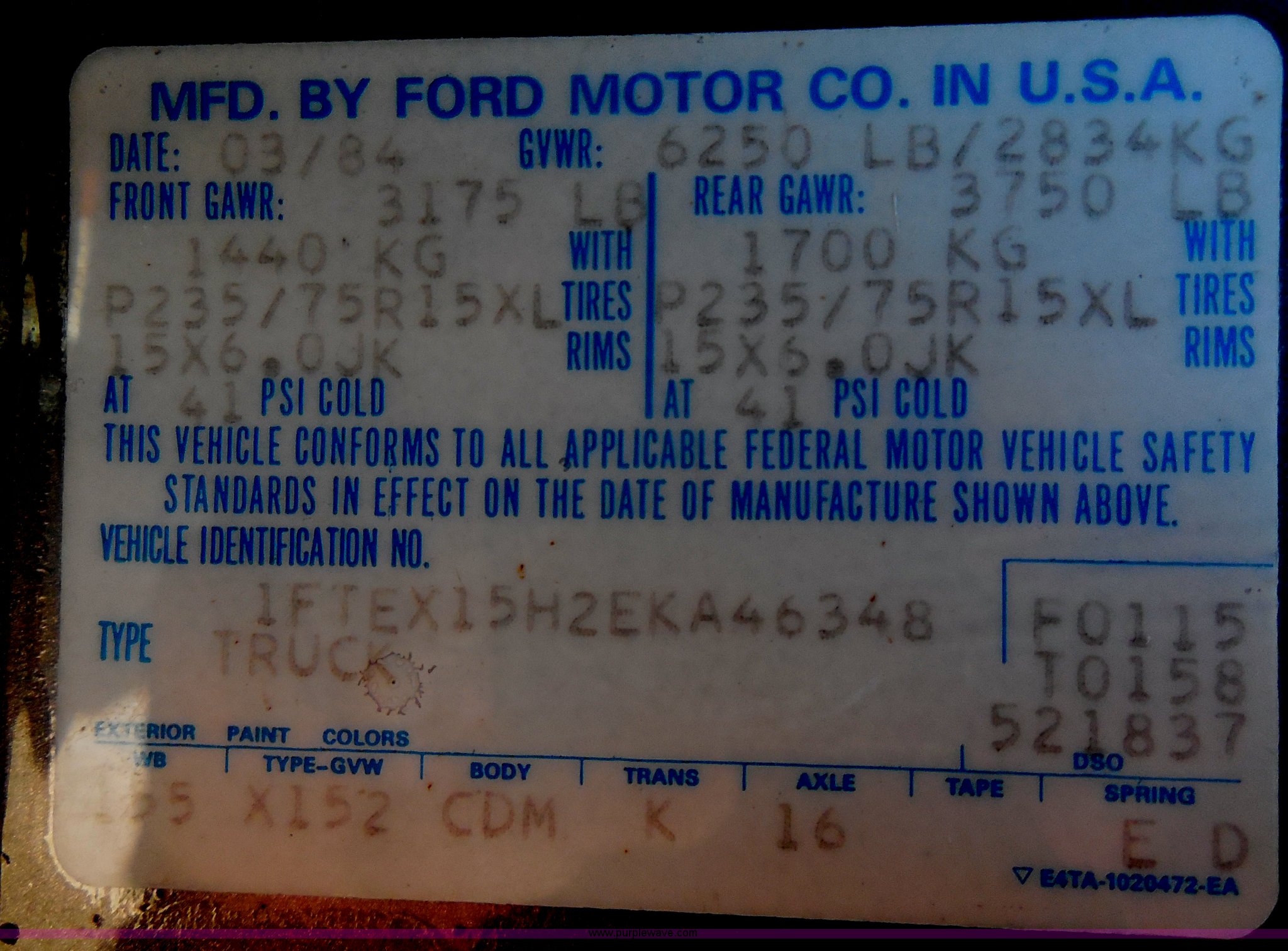 1984 Ford F150 XLT pickup truck. 82,332 miles on odometer Not Actual Mileage, 5.8L V8 OHV 16V gas engine, Automatic transmission, AM/FM/CD, Receiver hitch, Moonroof, Keys, P255/70R15 tires, Case# 13C040301. Vehicle is abandoned. No additional information is available. Vehicle does not have keys unless notated otherwise in the item listing.. View City Of Wichita Terms for title acquisition and item removal requirements.. 1FTEX15H2EKA46348. Shipping quotes available. Bud Roat Towing. 310 N Handley. Wichita, KS 67203
