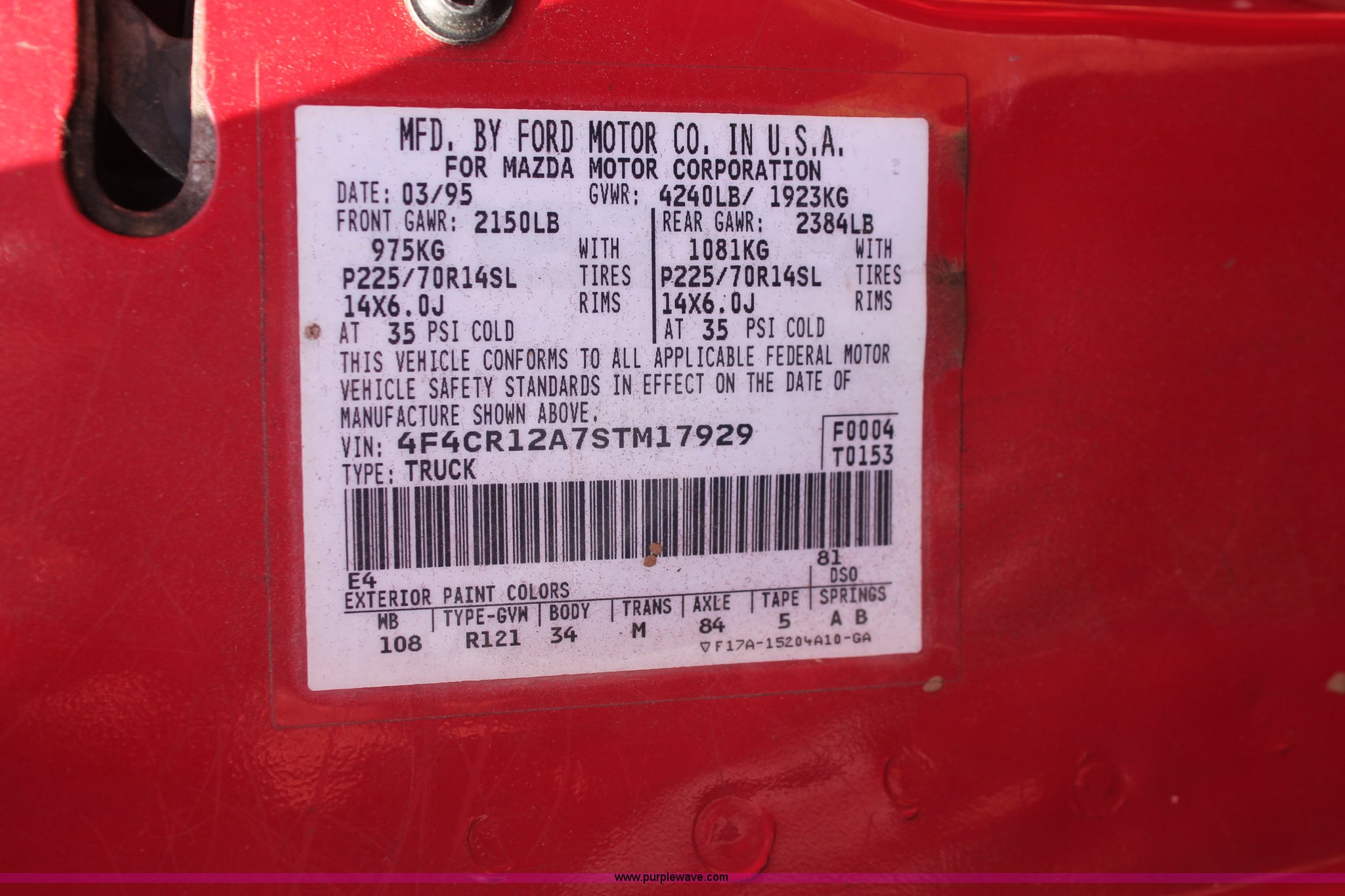 1995 Mazda B2300 pickup truck. 186,490 miles on odometer, 2.3L L4 SOHC 8V gas engine, Five speed manual transmission, AC and heat, Tilt, Cruise, AM/FM/cassette, Sliding rear window, Keys, Bed topper, 2" ball, Trailer wiring, P225/70R14 tires, Paint faded and peeling, Passenger side swipe damage, Glove box damage, Will start, Unknown driving condition, Idles rough, Case# 13C30314. Vehicle is abandoned. No additional information is available. Vehicle does not have keys unless notated otherwise in the item listing.. View City Of Wichita Terms for title acquisition and item removal requirements.. 4F4CR12A7STM17929. Shipping quotes available. Ken's Auto Tow. 3730 South Broadway. Wichita, KS 67216