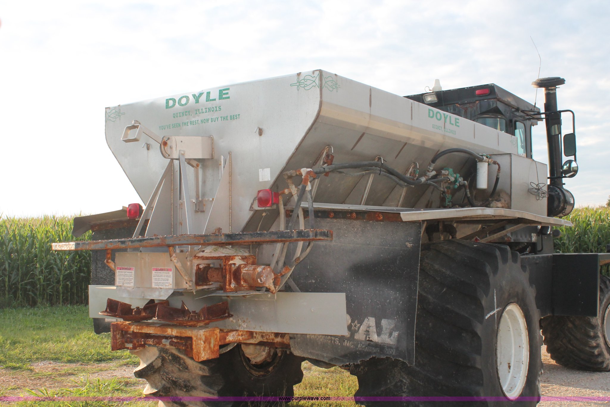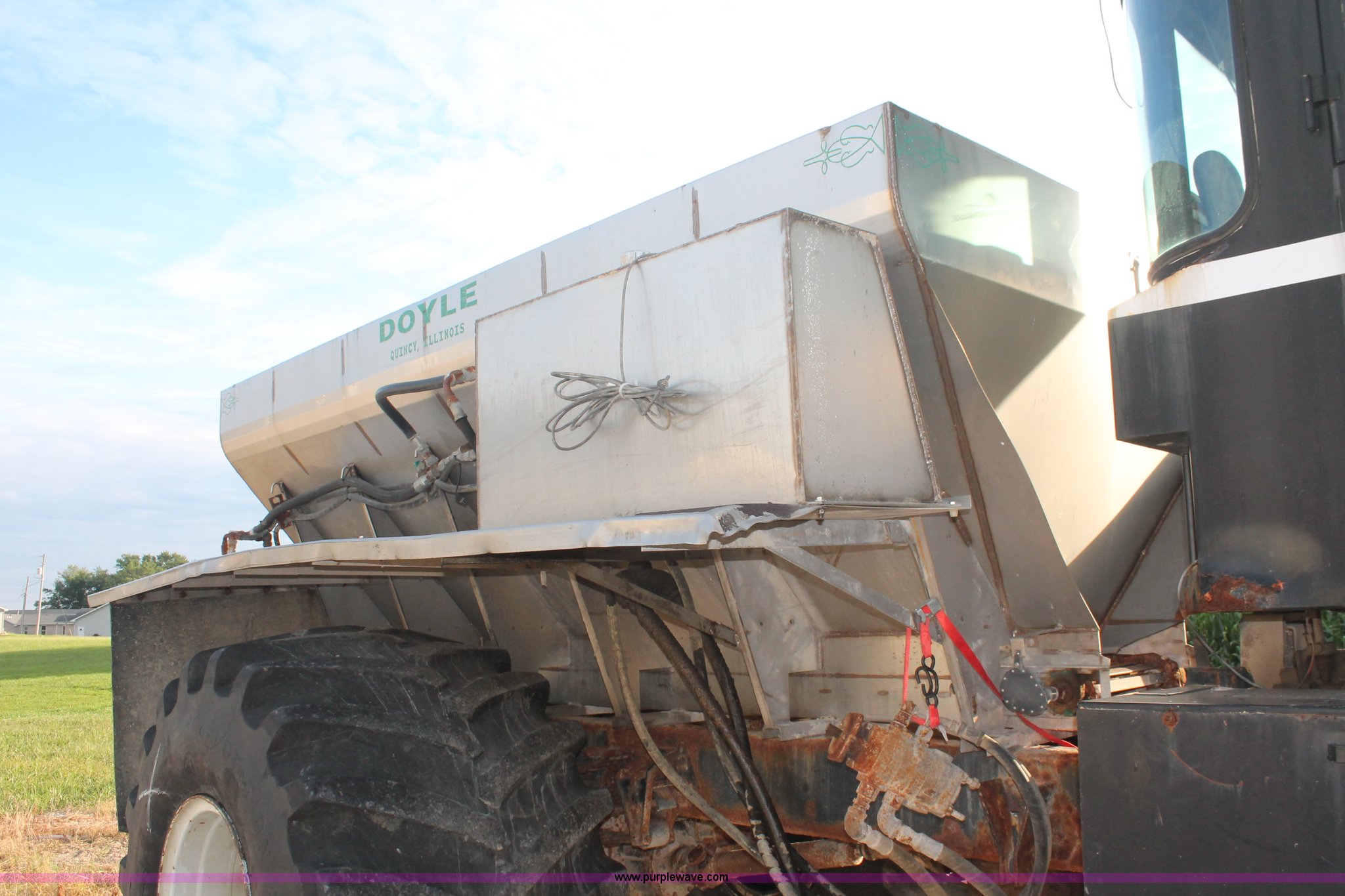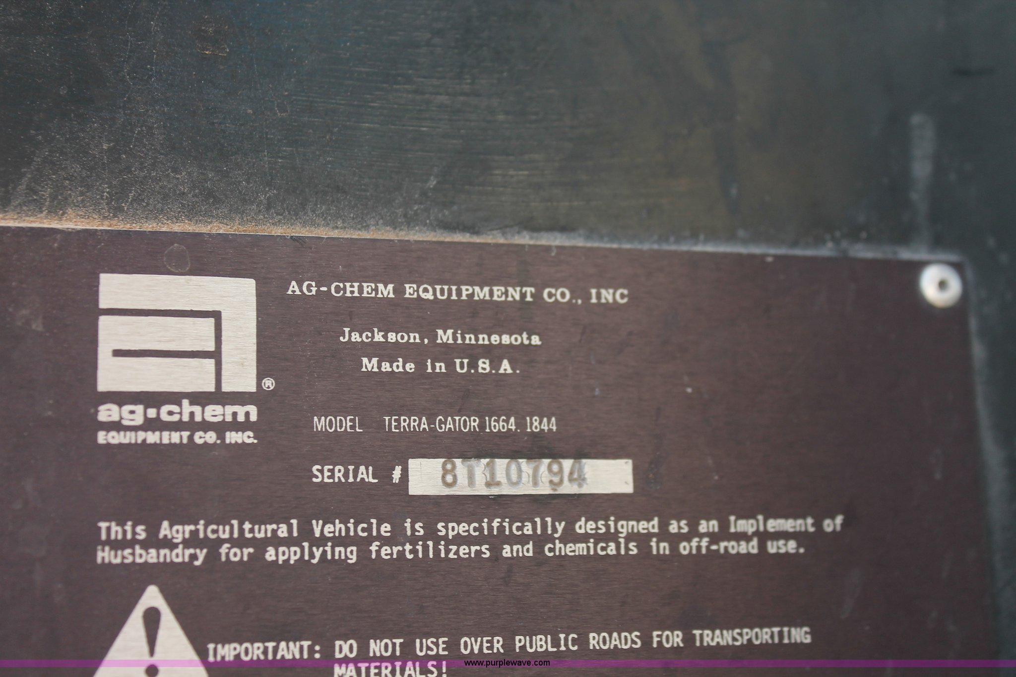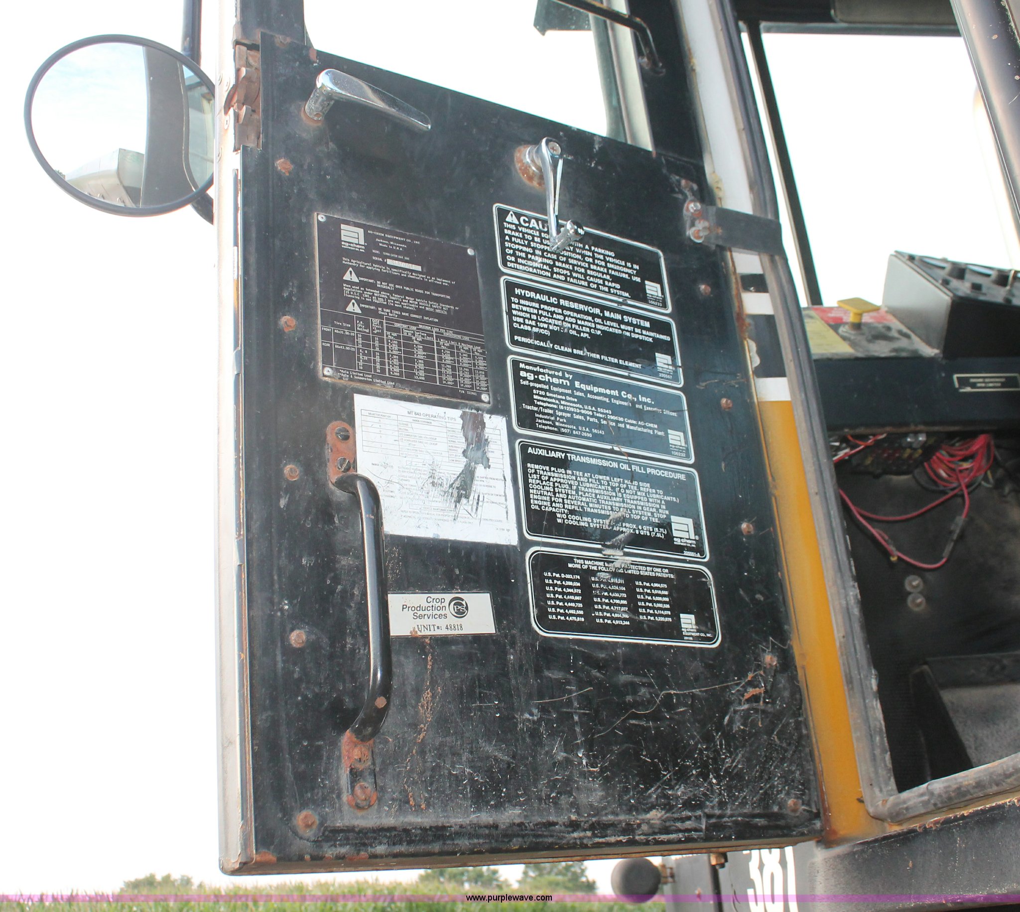 Purple Wave is selling a used Applicator Self Propelled in Indiana. This item is a 1994 Ag-Chem TerraGator 1844 spreader with the following: 42,622 miles on odometer, 5,901 hours on meter, Six cylinder diesel engine, Non-operational, Automatic transmission, Four speed auxiliary transmission, AC and heat, AM/FM, Suspension seat, Engine governor, Starlink GPS, New Leader bin level monitor, New Leader 3020 spreader bed, Stainless steel, 12'L, Eight ton capacity, 20" dual spinners, 20"W conveyor, Fimco poly tank, Volume adjustable discharge chute, PTO, Wet kit, 48x31.00-20 front tires, 66x43.00-25 rear tires, Undiagnosed engine issues, Serial 8T10794, Unit# 48818