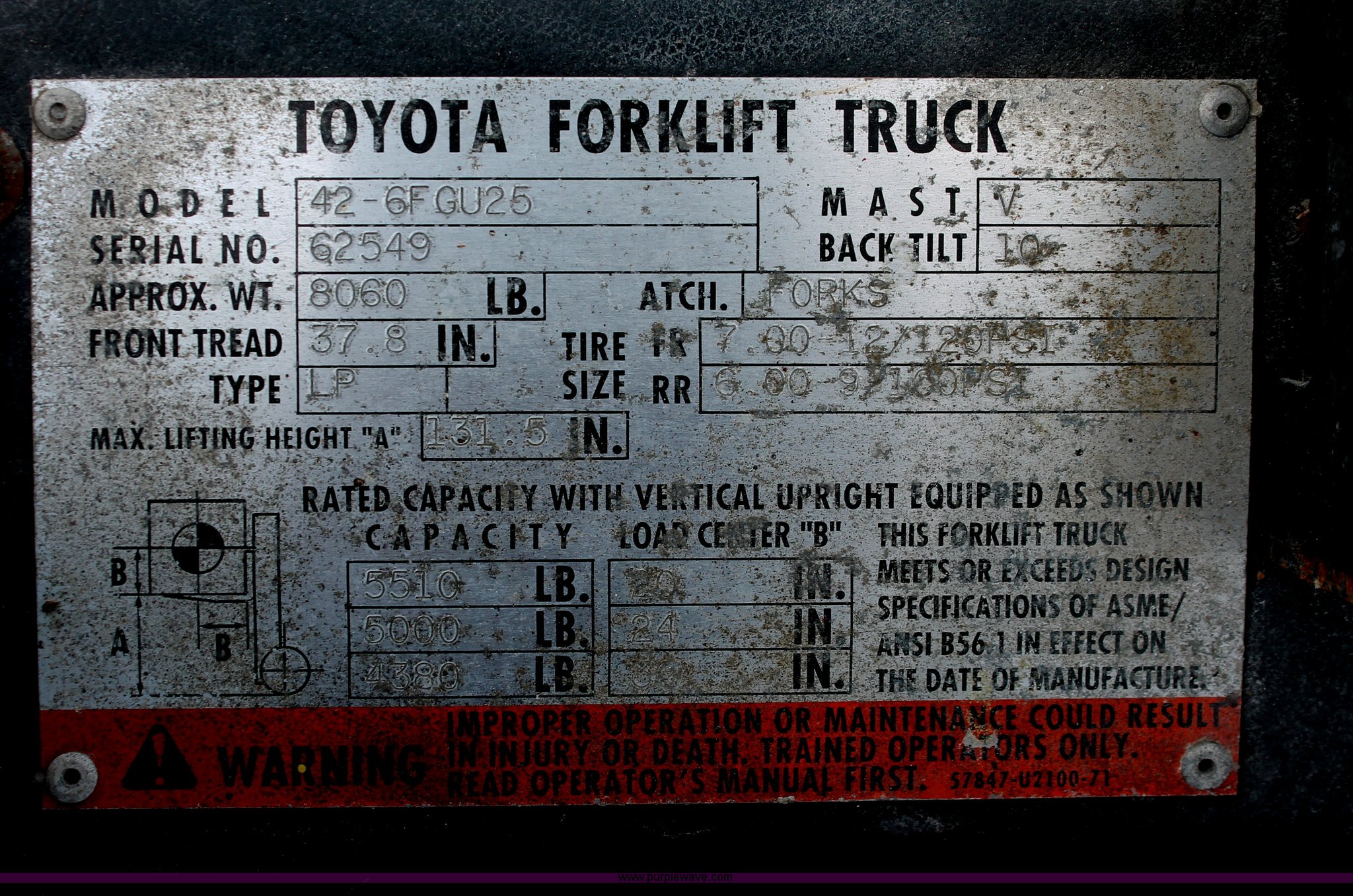 Toyota 42 forklift. 8,917 hours on meter, Model 42-6FGU25, Four cylinder LP engine, Four stick operation, ROPS canopy , Work lights, Two stage mast, 42" forks, 5,510 lbs rated capacity, 131" fork height, Pin hitch, Rear counterweight, 7.00-12NHS front tires, 6.00-9NHS rear tires, 8,060 lbs. base operating weight, Serial 62549. Shipping quotes available. Crop Production Services - Clarksville. 5216 Guthrie Hwy. Clarksville, TN 37040