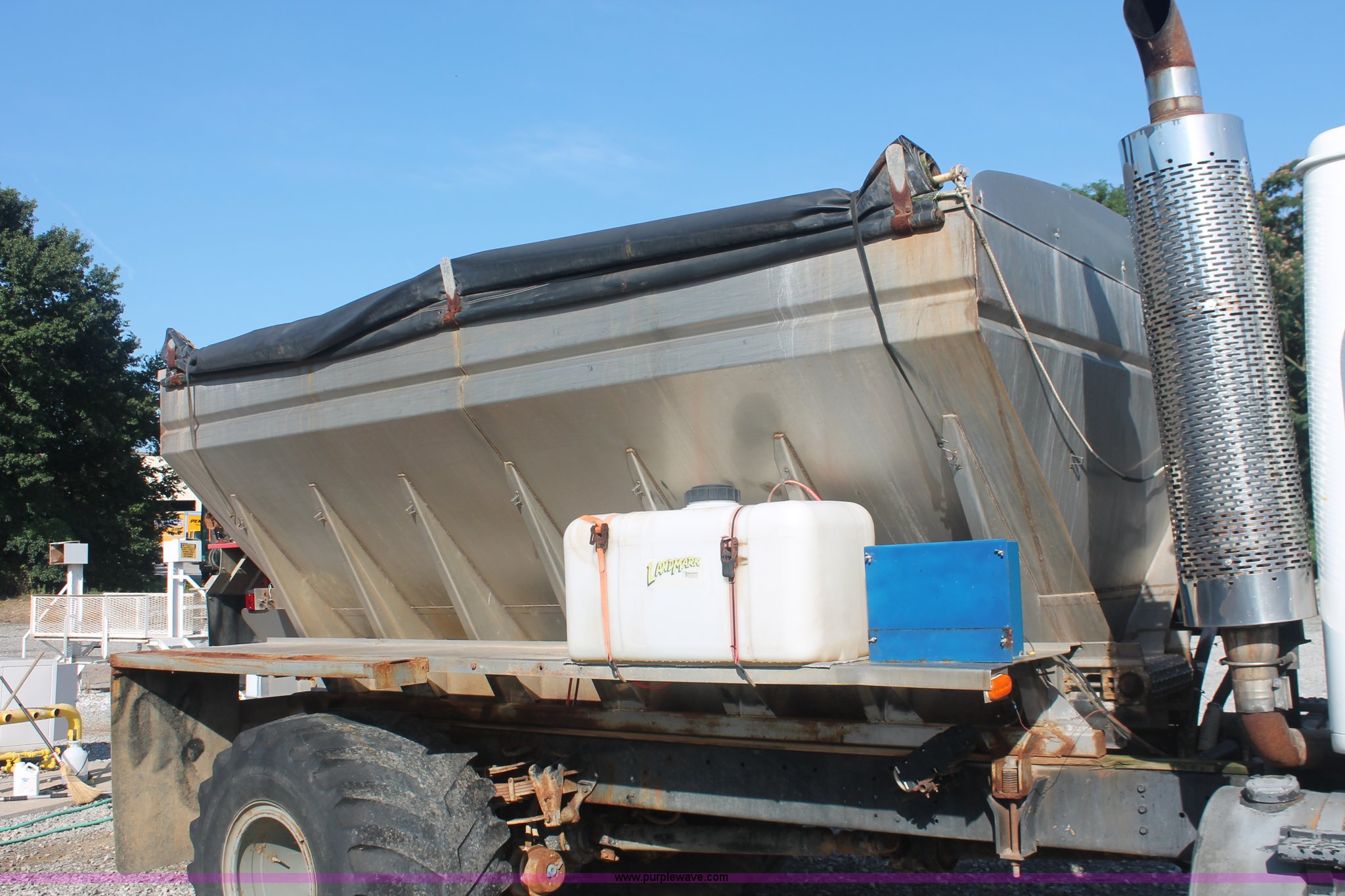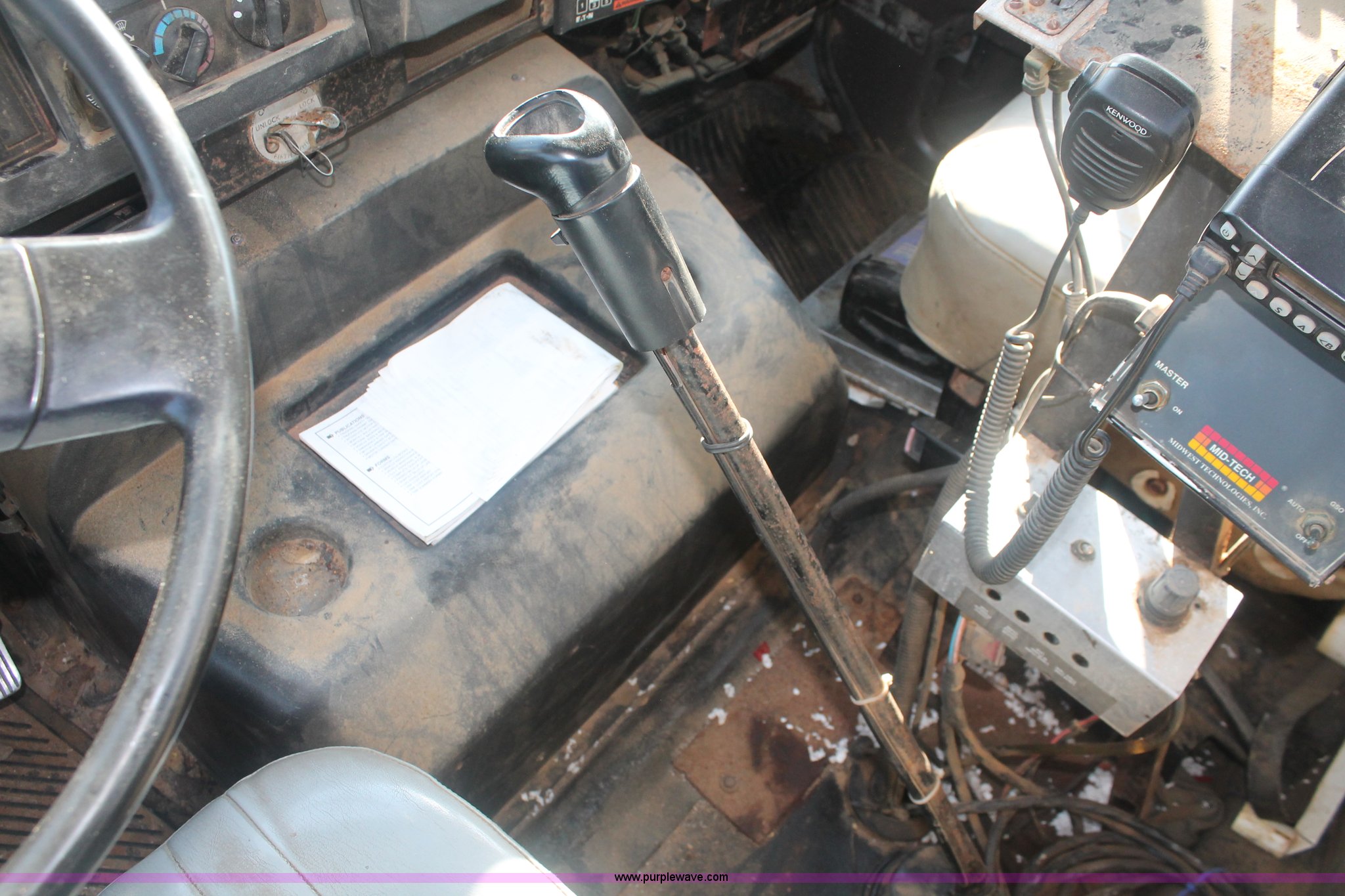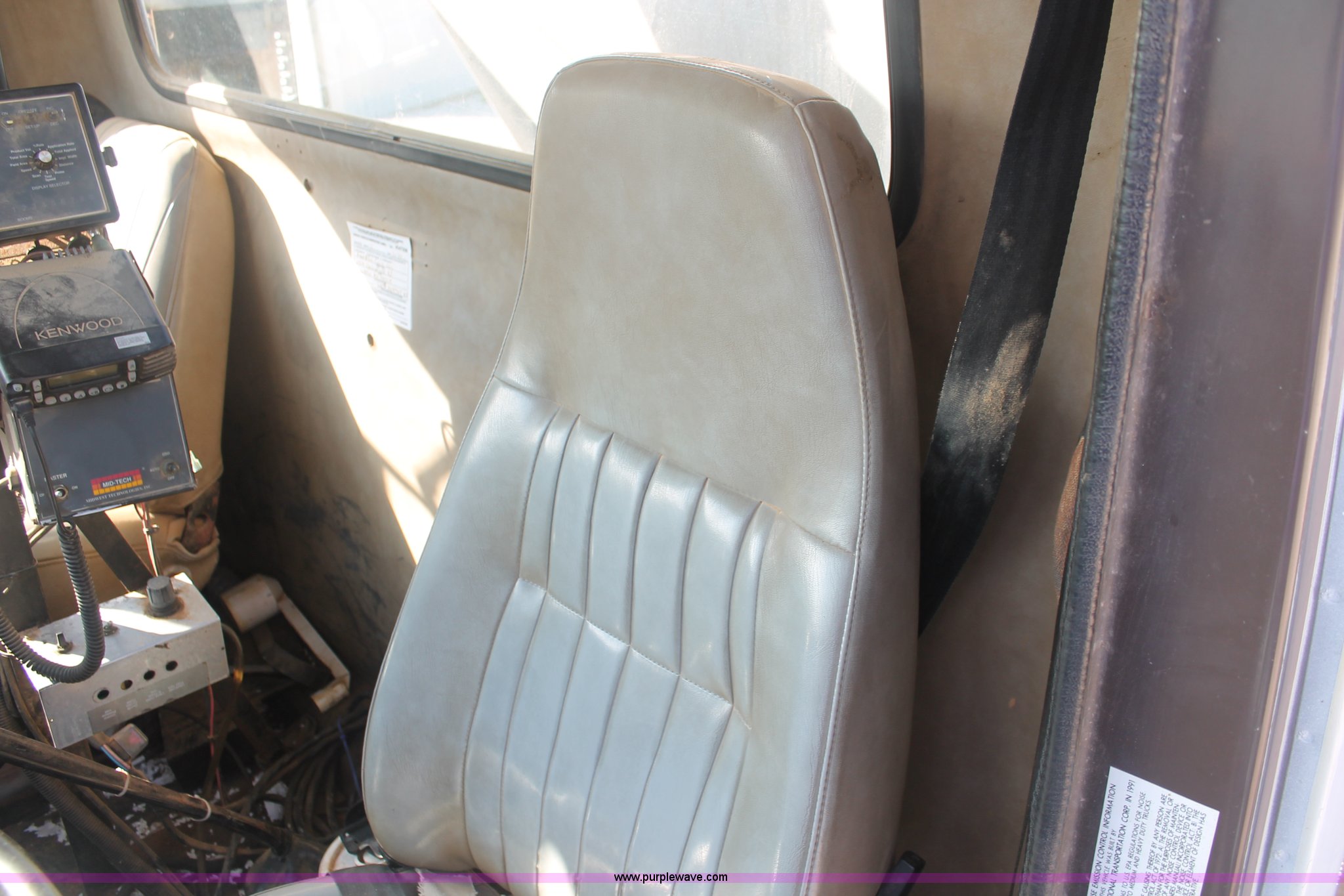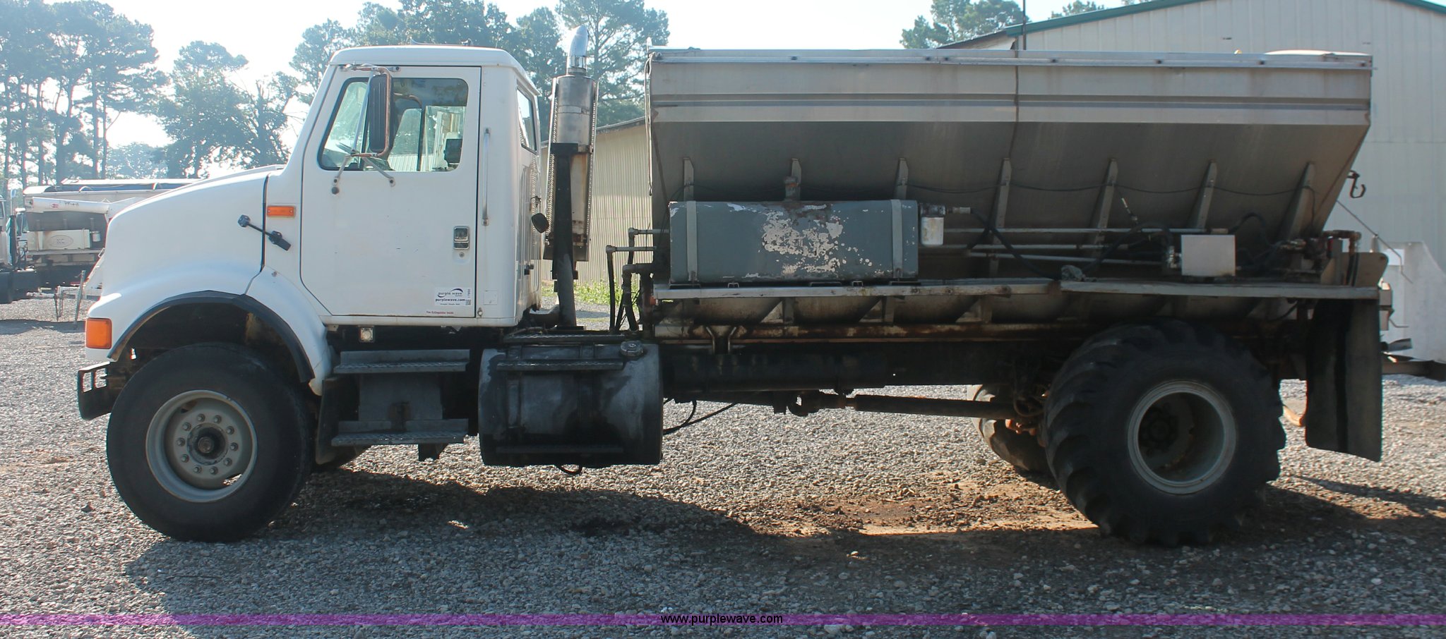 Purple Wave is selling a used Applicator Truck in Tennessee. This item is a 1991 International 8100 spreader truck with the following: 53,540 miles on odometer, Cummins L10 10.0L L6 diesel engine, Eaton Fuller Road Ranger nine speed manual transmission, Heat, AM/FM/cassette, Kenwood CB radio, Mid-Tech ARC-6000 automatic rate controller, Newton Crouch stainless steel spreader bed, Dual spinners, 16" diameter chain linked conveyor, Volume adjustable discharge chute, Rollover tarp, Block heater, Dual fuel tanks, Single rear exhaust stack, PTO, Wet kit, Spring suspension, Air brakes, 204" wheelbase, 385/85R22.5 front tires, 48x31.00-20 rear tires, GVWR 32,000 lbs, FAWR 12,000 lbs, RAWR 20,000 lbs, Weak battery, Unit# 22023