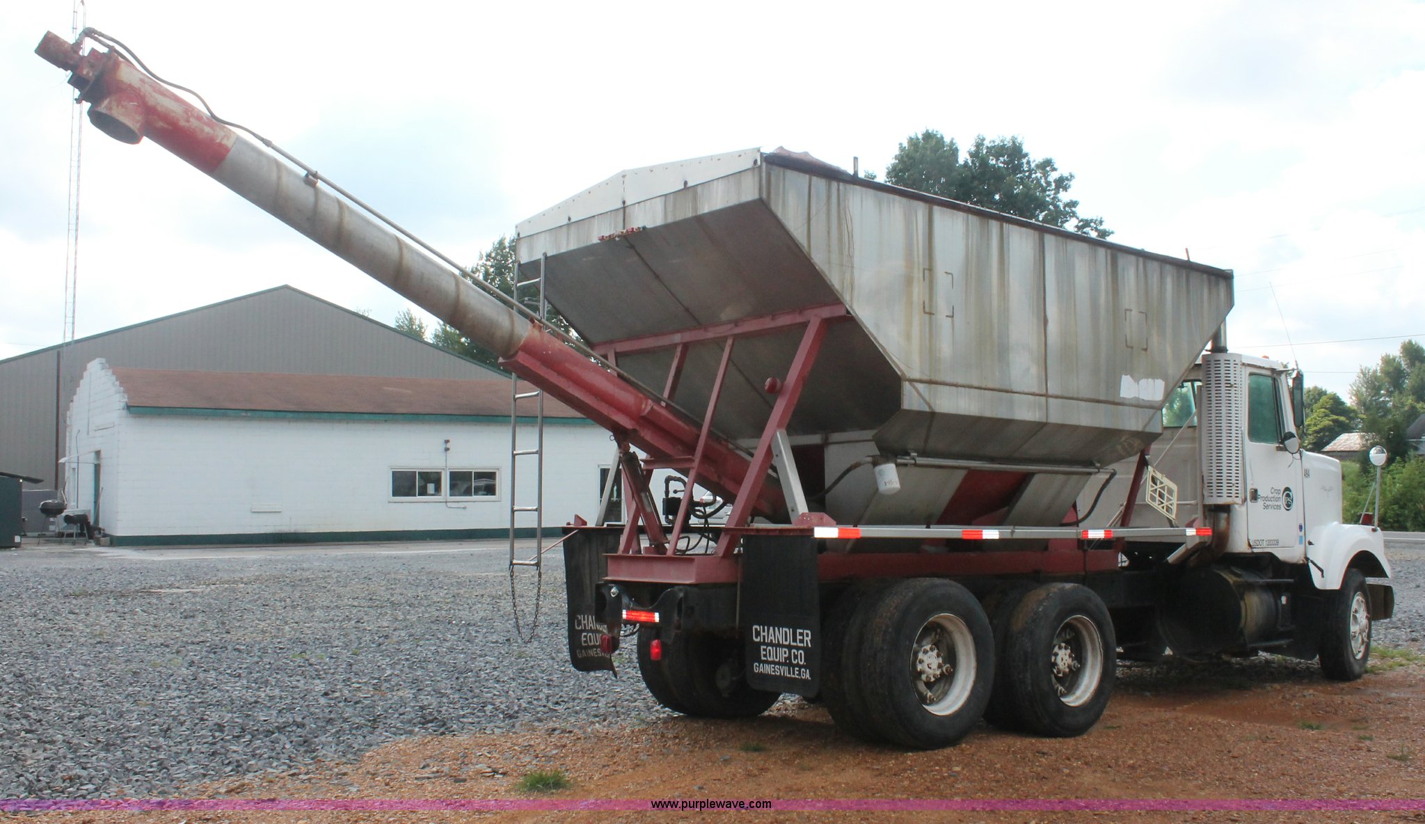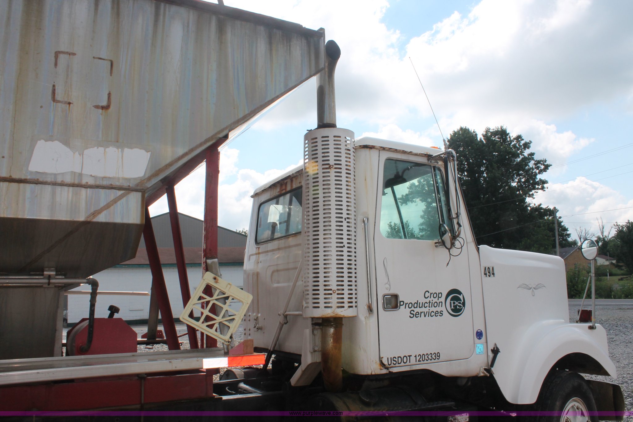 1982 White tender truck. 144,242 miles on odometer, 7,495 hours on meter, 14.0L L6 diesel engine, Eaton Fuller Road Ranger nine speed manual transmission, Interdiffertial lock, Chandler tender bed 16 ton capacity, Single spool control valve, 10" diameter discharge auger, Hydraulic lift, Dual access ladders, Two compartment, Manual slide hopper doors, Serial 9135, Dual fuel tanks, Single rear exhaust stack, PTO, Wet kit, Spring suspension, Air brakes, 192" wheelbase, 295/75R22.5 tires, Missing driver's side window glass, Unit# 51729. Title distribution may be delayed up to 30 days from verification of funds. 1WUBDCJE0CN055167. Shipping quotes available. Crop Production Services - Sedalia. 1680 Kentucky 339 East. Sedalia, KY 42079