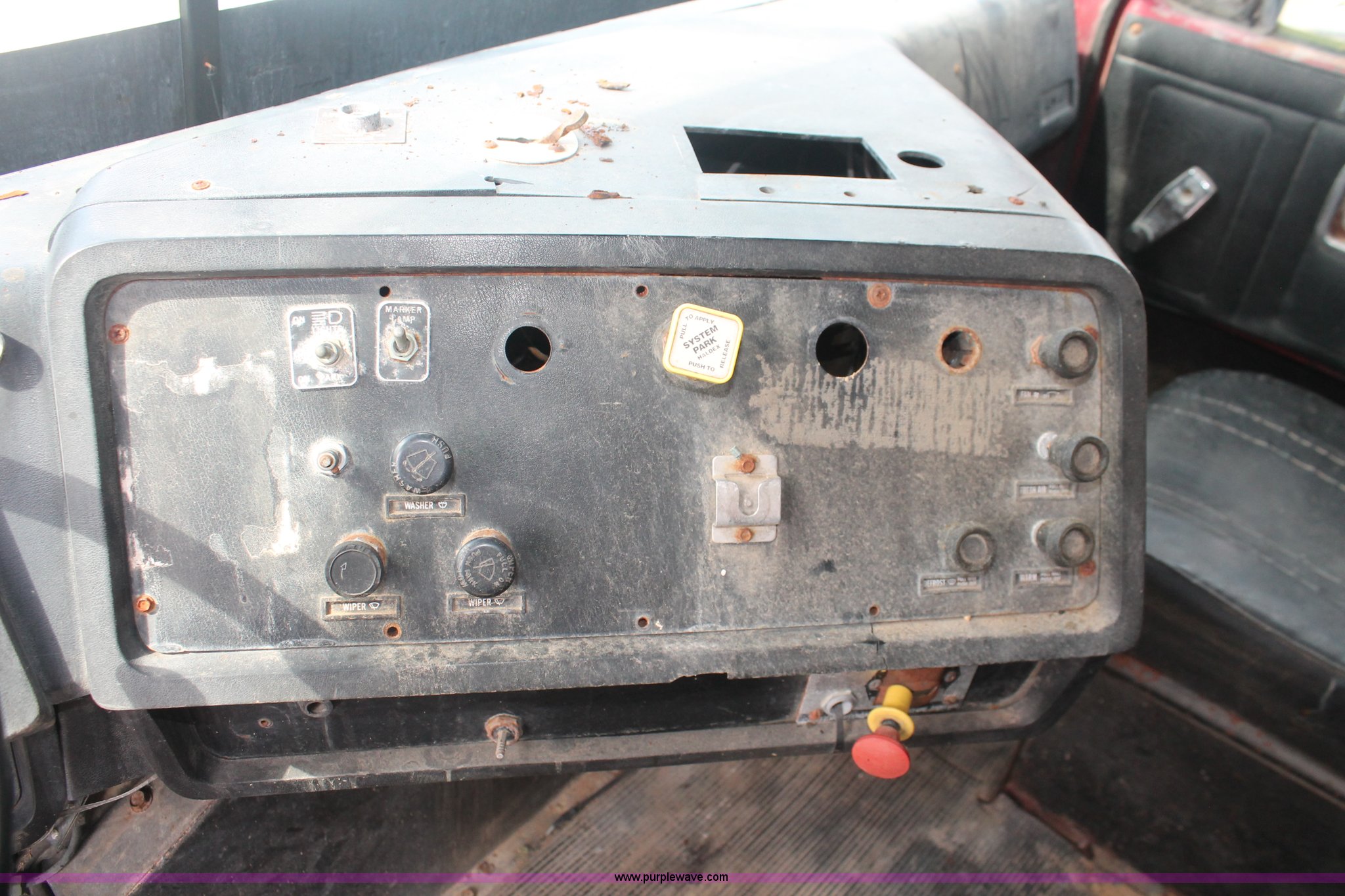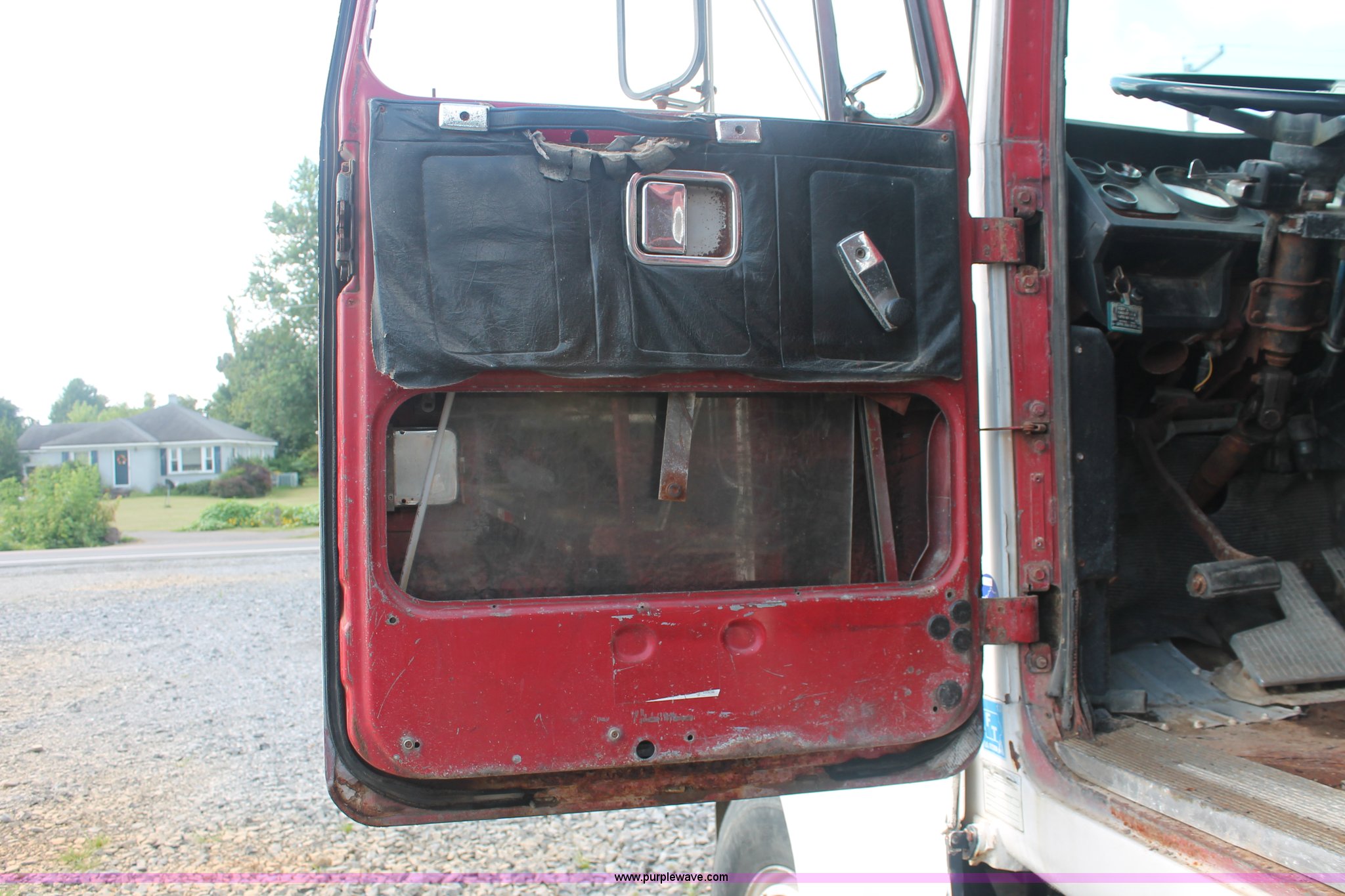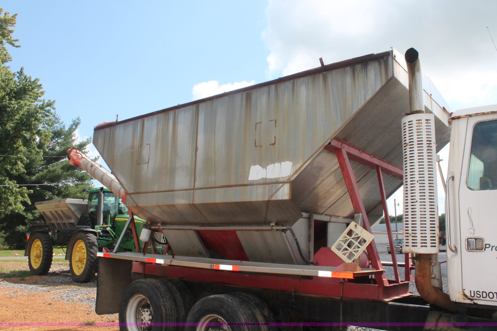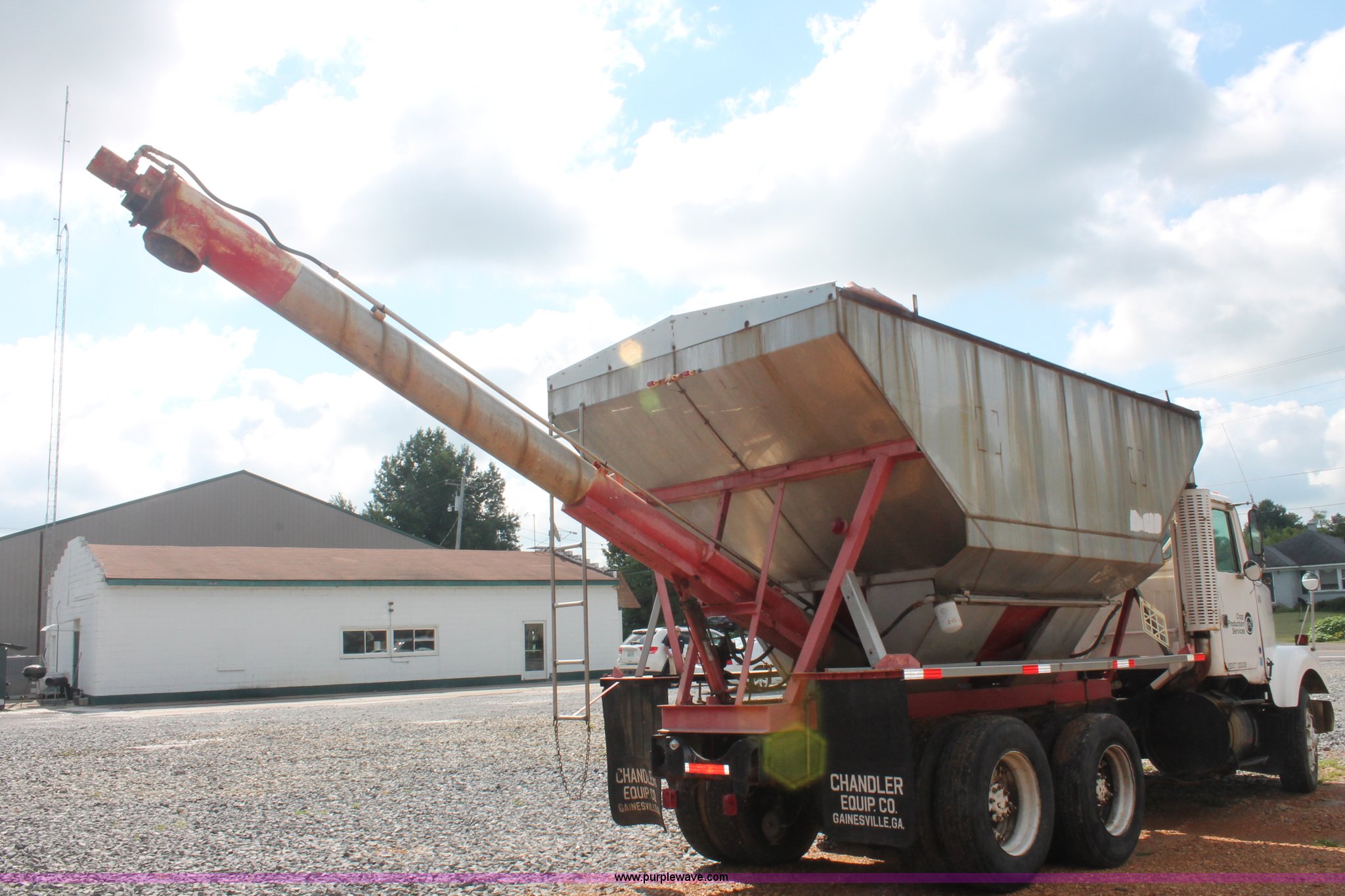 Purple Wave is selling a used Fertilizer or Feed Delivery Truck in Kentucky. This item is a 1982 White tender truck with the following: 144,242 miles on odometer, 7,495 hours on meter, 14.0L L6 diesel engine, Eaton Fuller Road Ranger nine speed manual transmission, Interdiffertial lock, Chandler tender bed, 16 ton capacity, Single spool control valve, 10" diameter discharge auger, Hydraulic lift, Dual access ladders, Two compartment, Manual slide hopper doors, Serial 9135, Dual fuel tanks, Single rear exhaust stack, PTO, Wet kit, Spring suspension, Air brakes, 192" wheelbase, 295/75R22.5 tires, Missing driver's side window glass, Unit# 51729